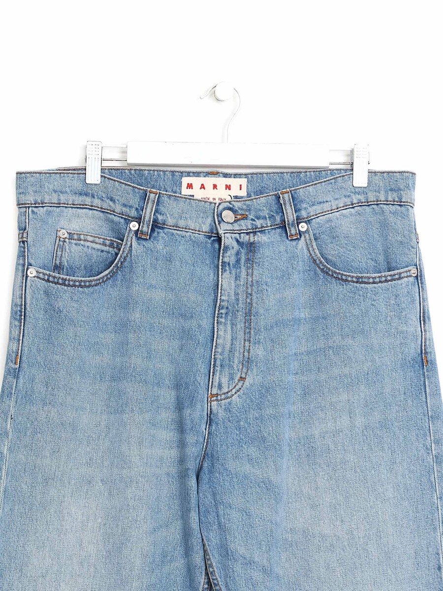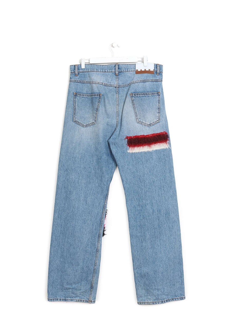 Jean à jambe large avec patchs de rayures abstraites en mohair. Taille mi-haute avec fermeture boutonnée sur le devant. Poches plaquées au dos.
