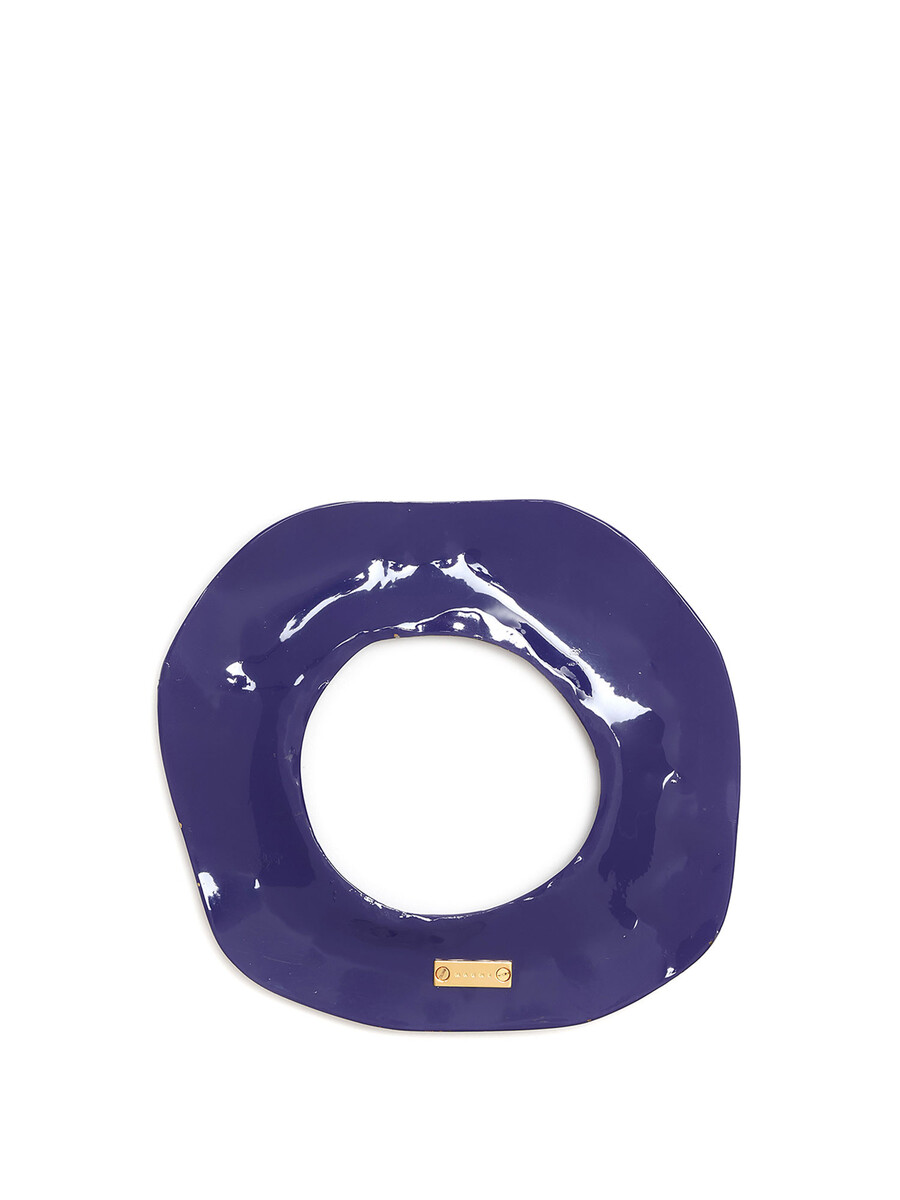 Bracelet en résine de forme asymétrique en bleu. Accents en métal émaillé. Avec boîte.