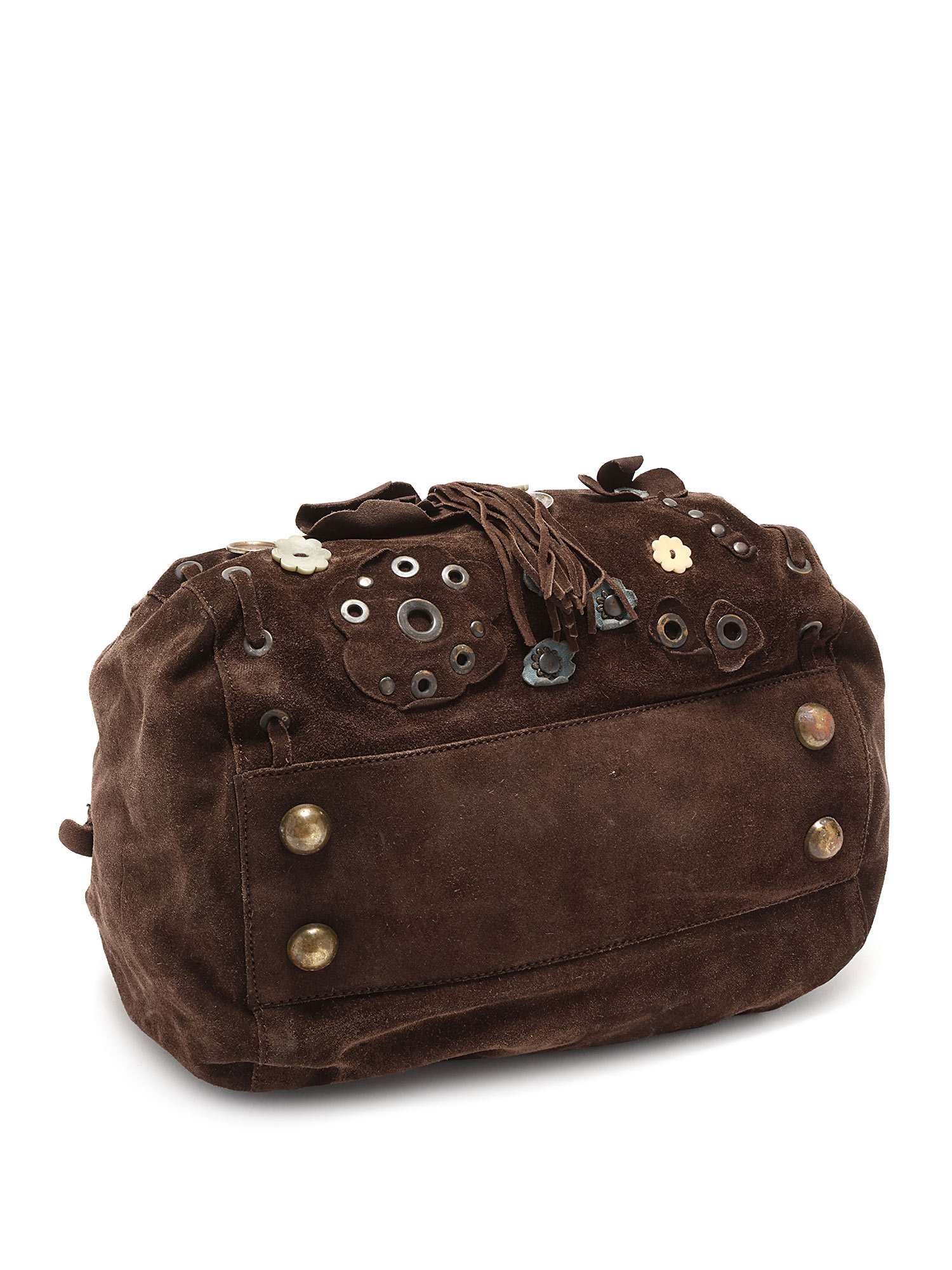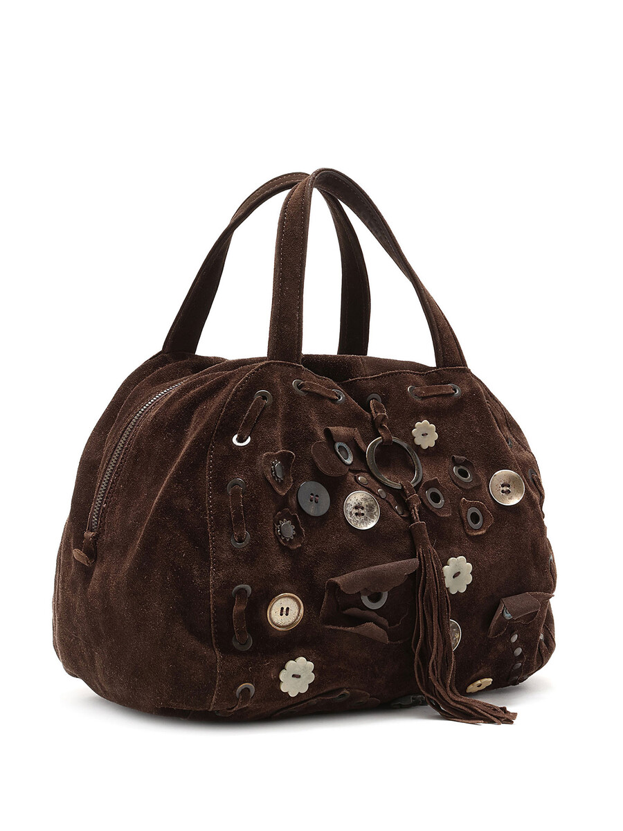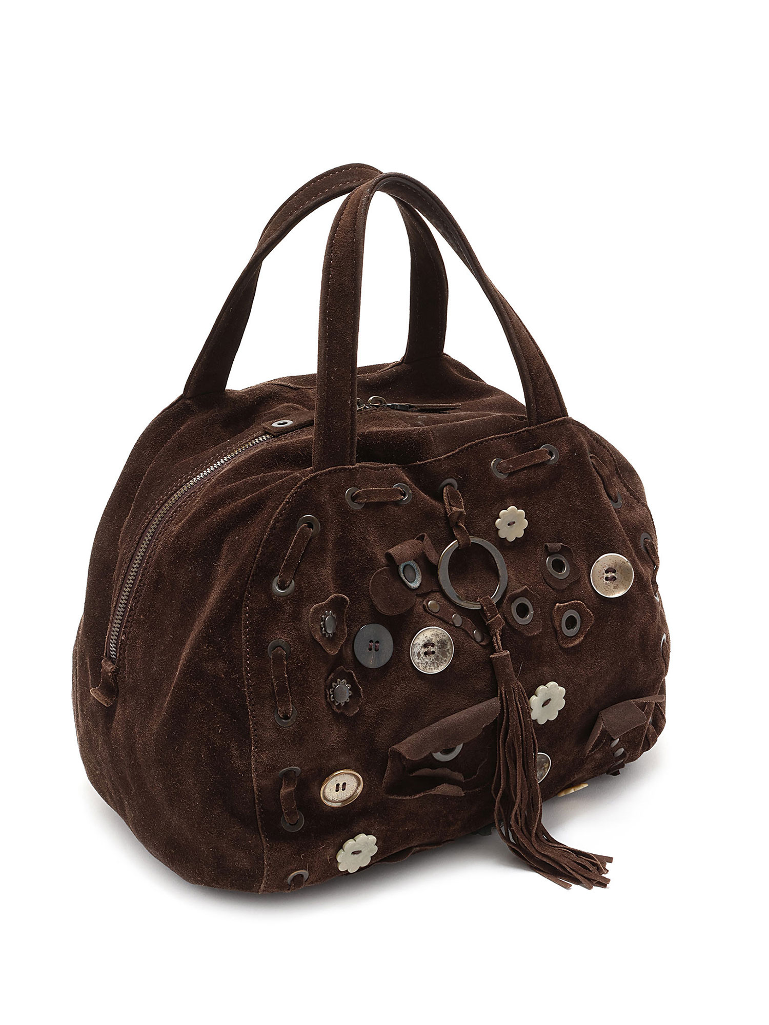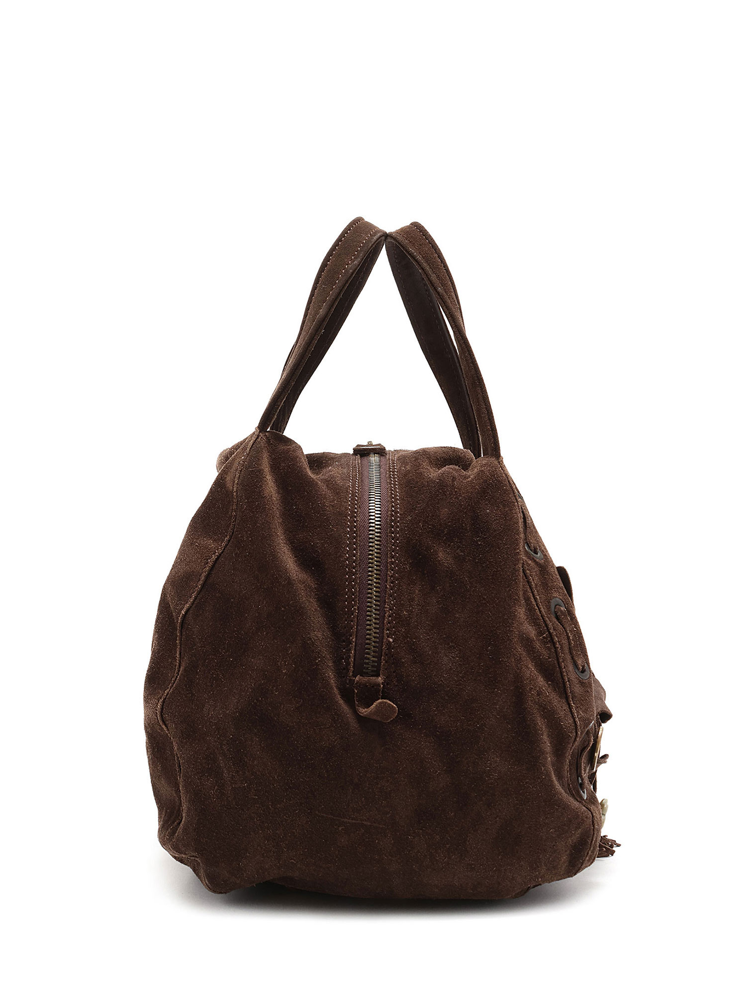 Cabas en suède avec éléments décoratifs en métal et cuir appliqués, en brun foncé. Fermeture zippée sur le dessus. Doubles poignées en cuir. Garnitures en cuir. Ferrures en laiton.