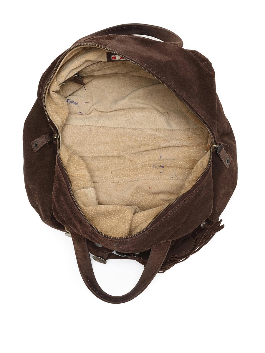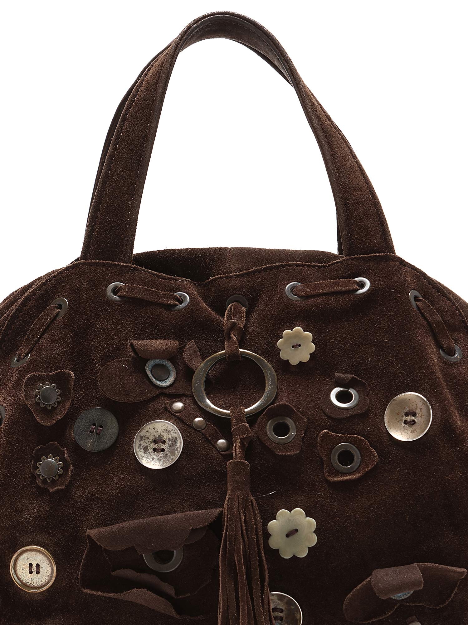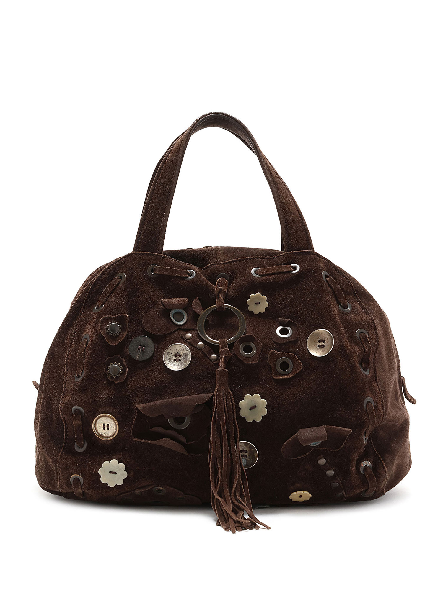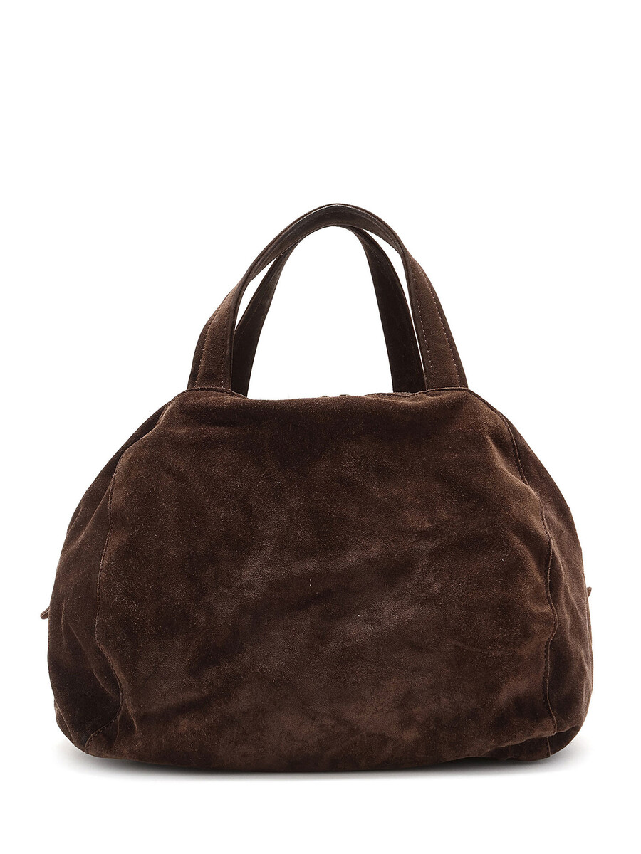 Cabas en suède avec éléments décoratifs en métal et cuir appliqués, en brun foncé. Fermeture zippée sur le dessus. Doubles poignées en cuir. Garnitures en cuir. Ferrures en laiton.