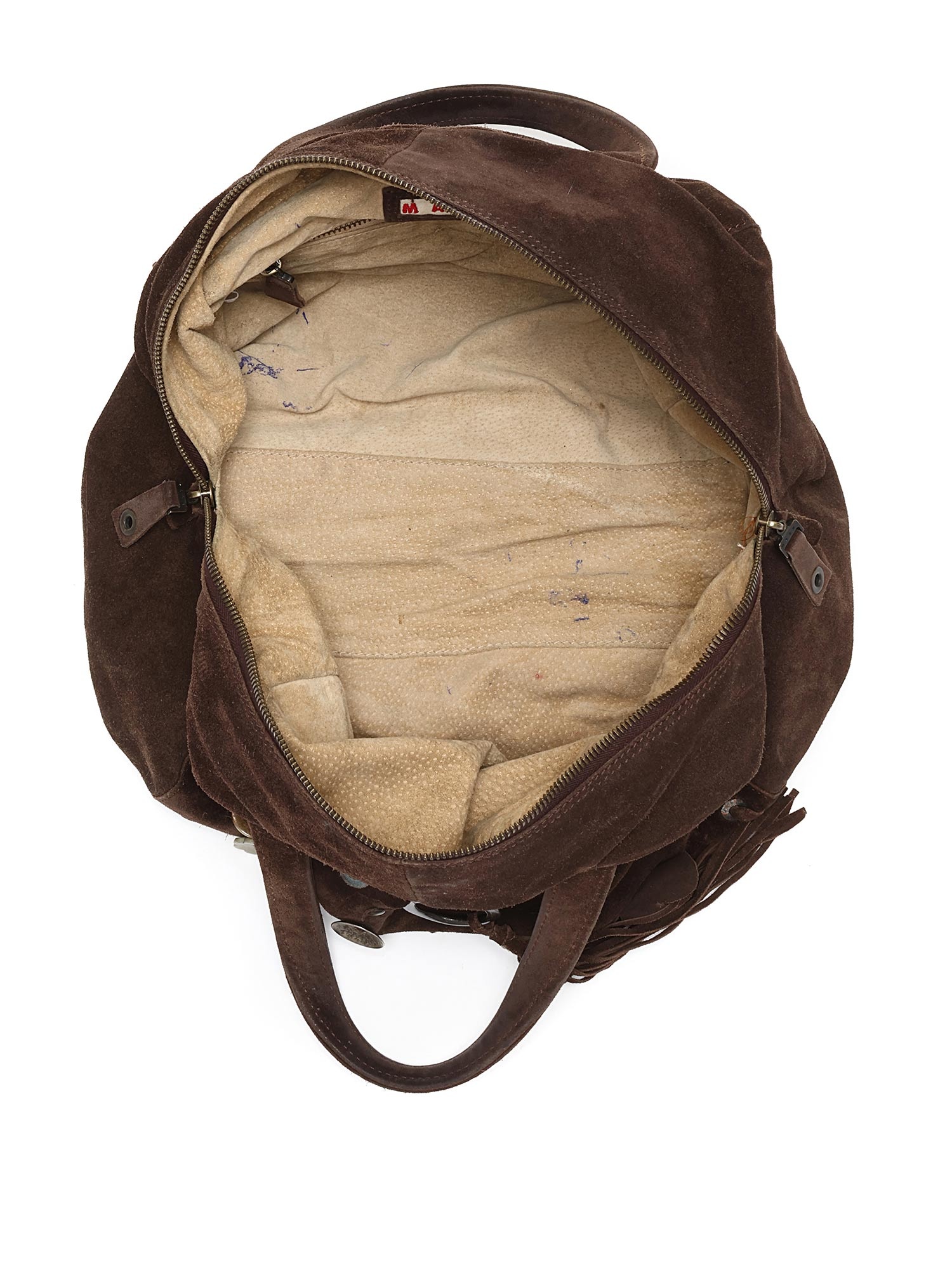 Signes d'usure. Patine sur les appliques et les pompons en métal. Intérieur usé. Daim éraflé.