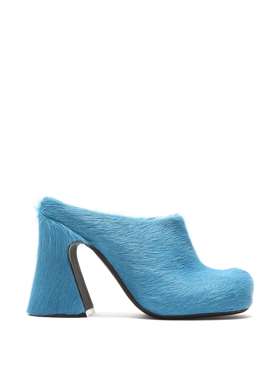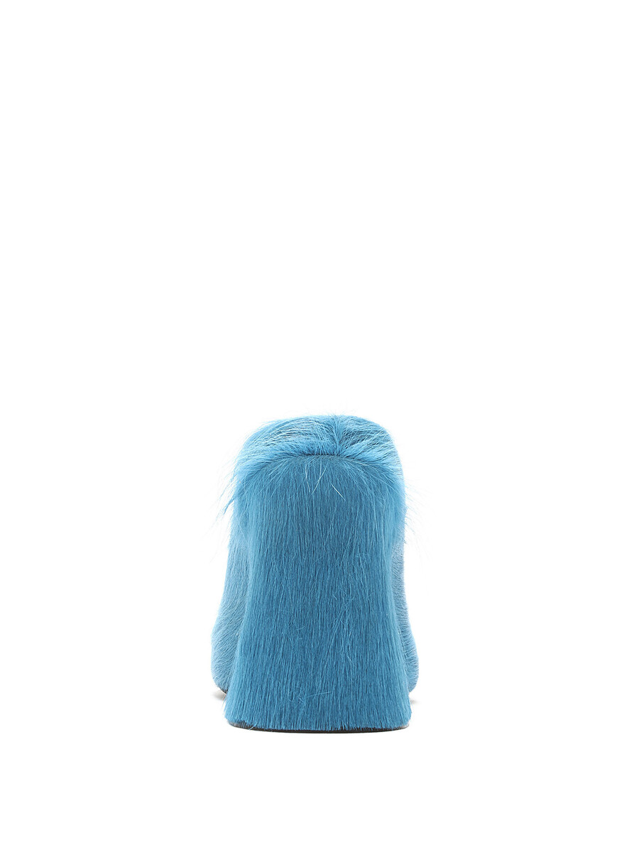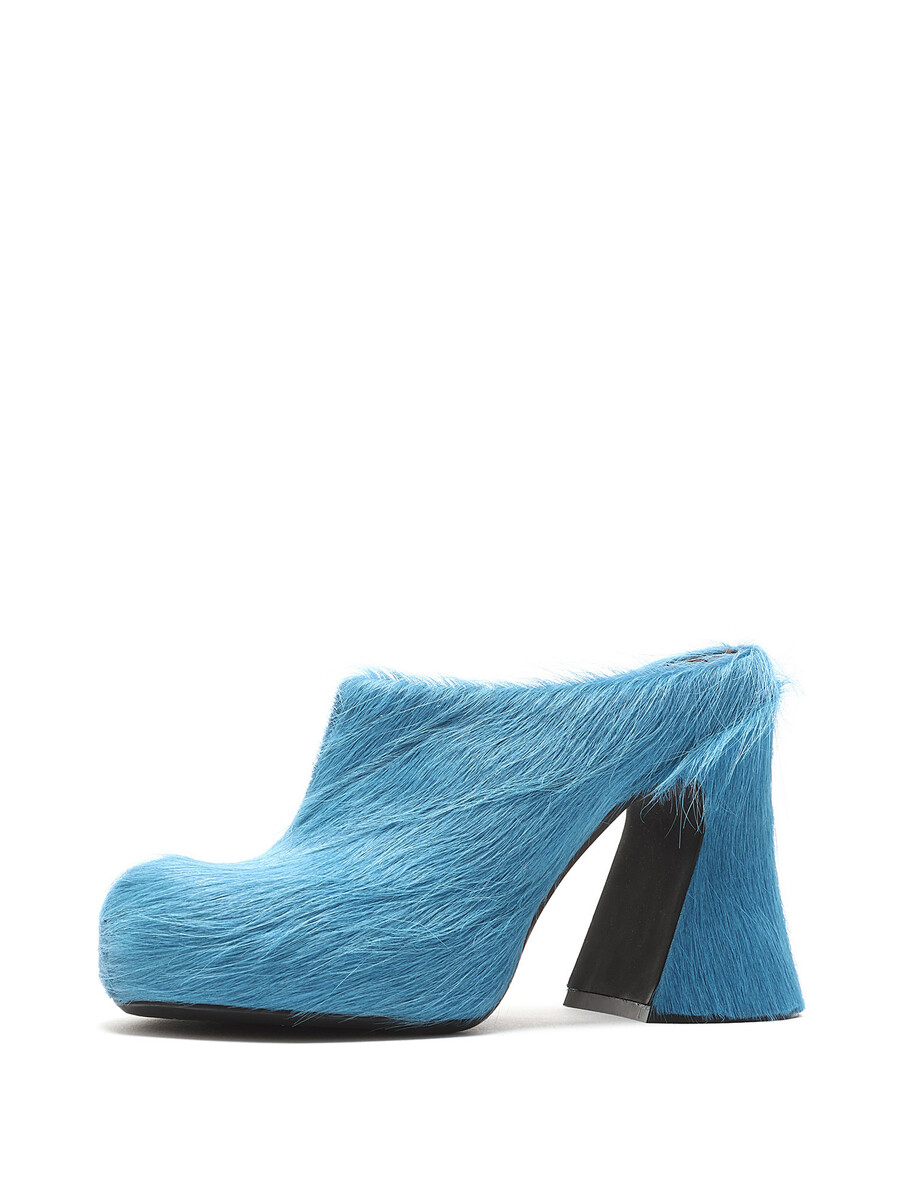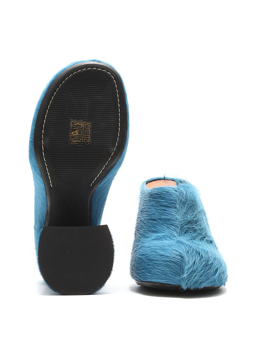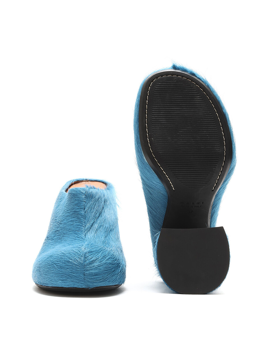 Mules en poil de veau avec détails texturés en bleu. Style à enfiler avec bout rond fermé. Semelle en caoutchouc robuste.