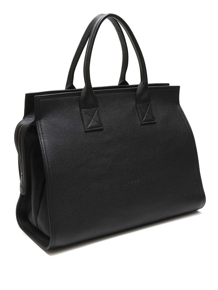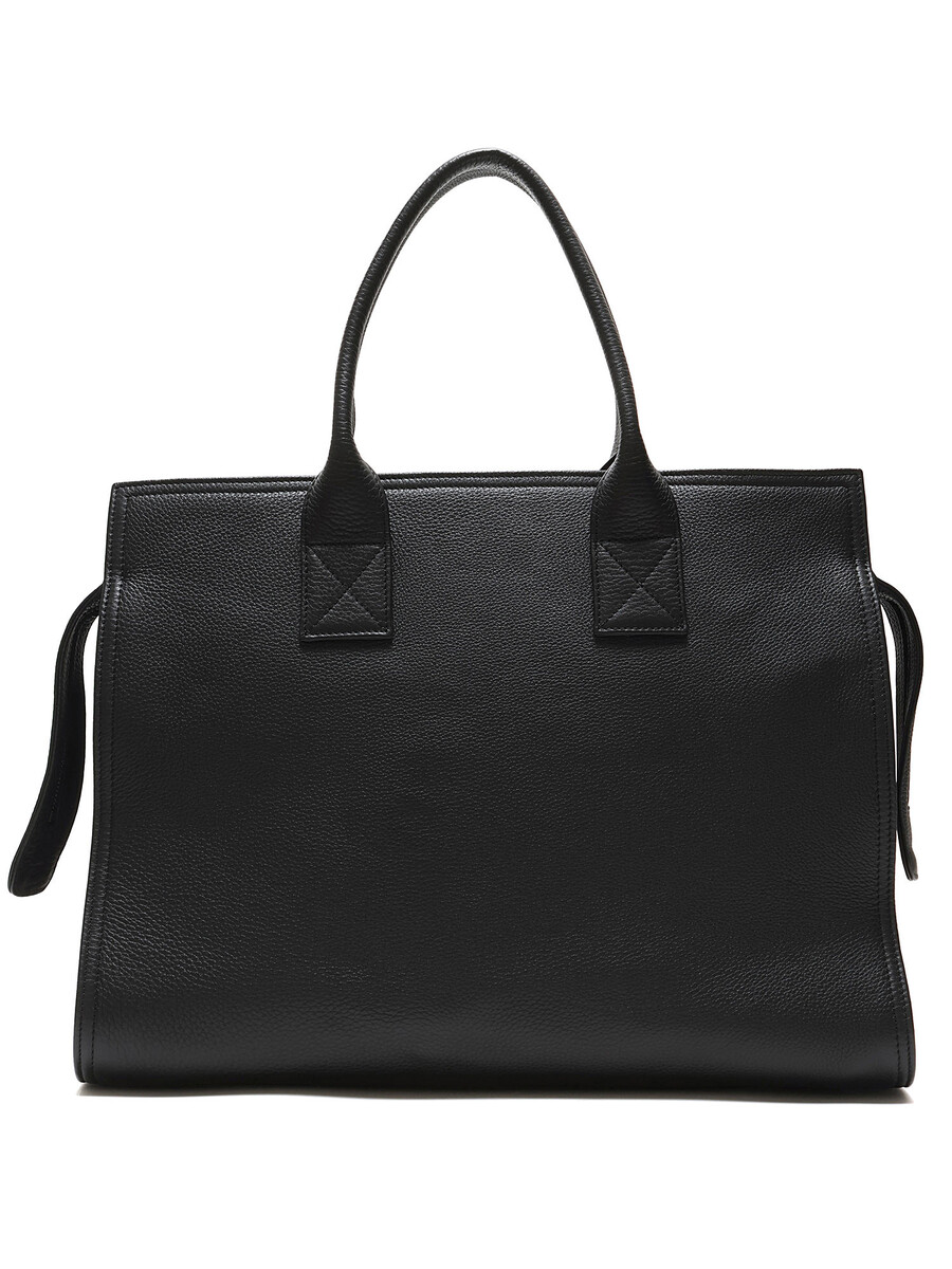 Sac fourre-tout en cuir noir avec fermeture à glissière et double poignées en cuir. Ferrures argentées. Comprend une pochette et une bandoulière ajustable. Livré avec un sac de protection.