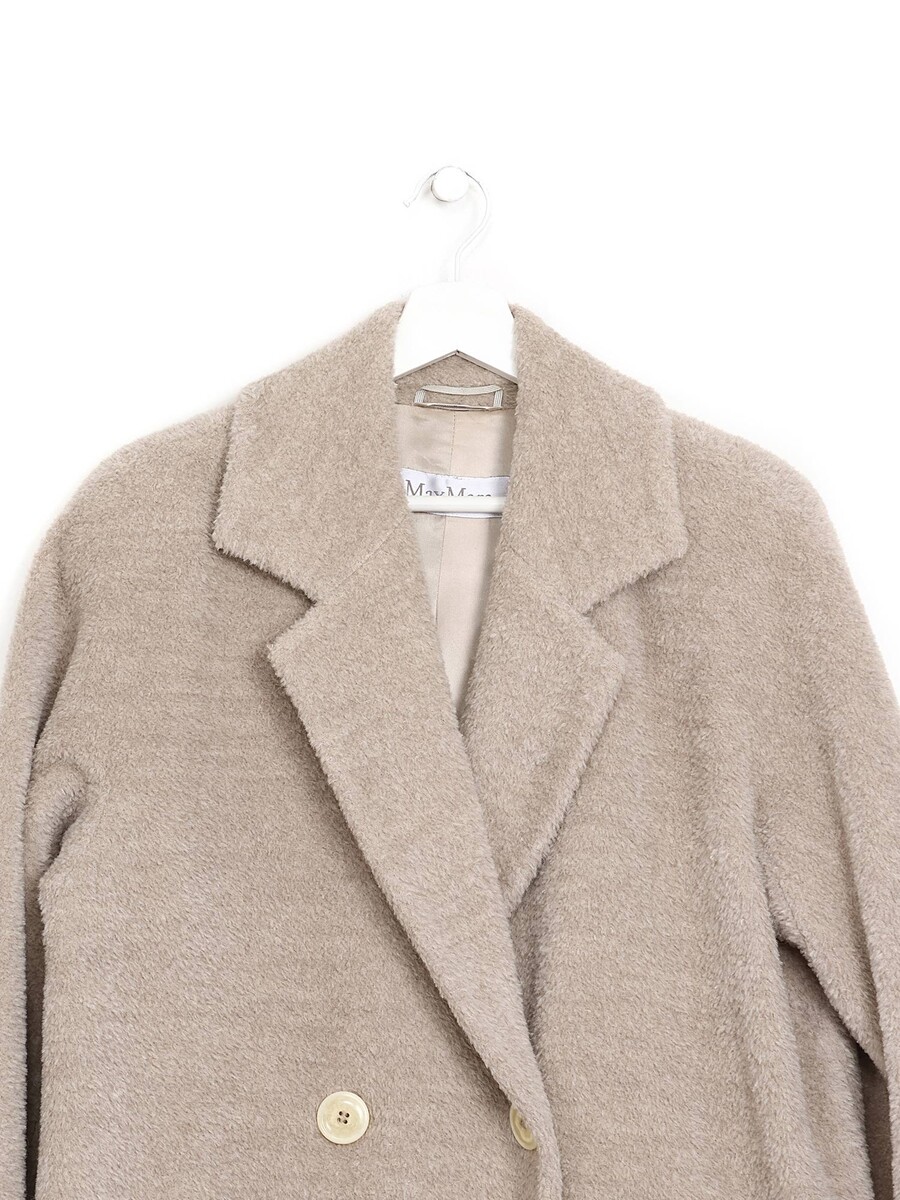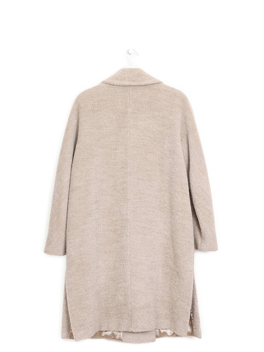 Manteau à manches longues en mélange luxueux d'alpaga et de laine. Col à revers, fermeture boutonnée, et poches à rabat à l'avant.