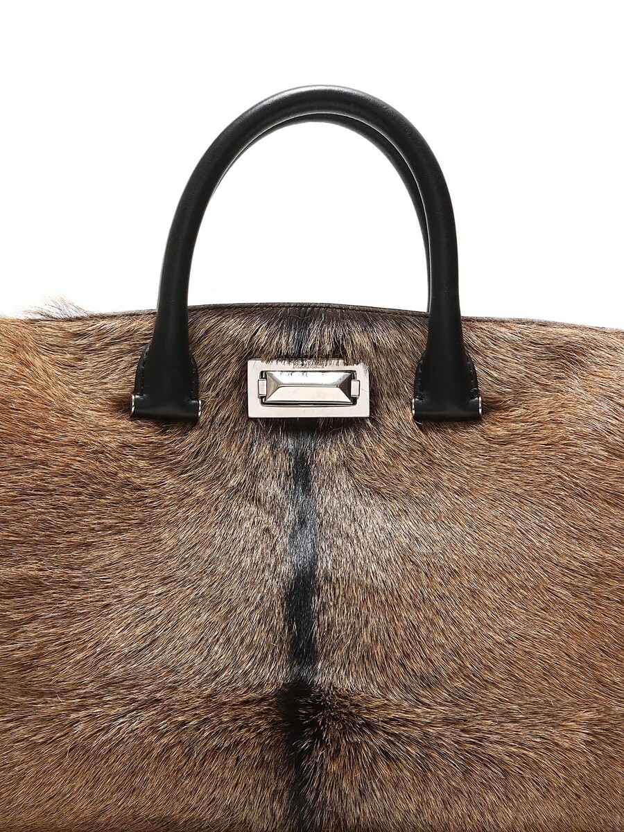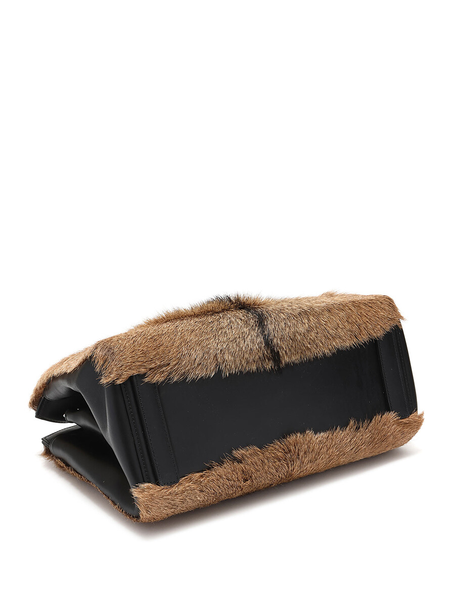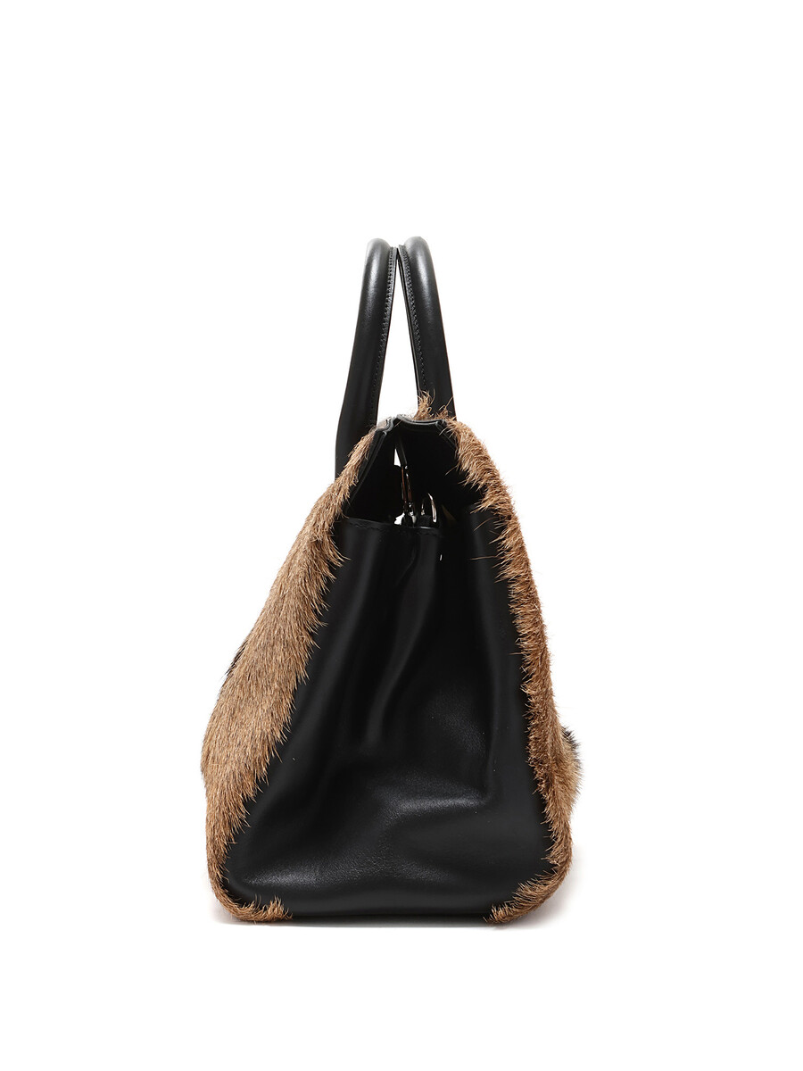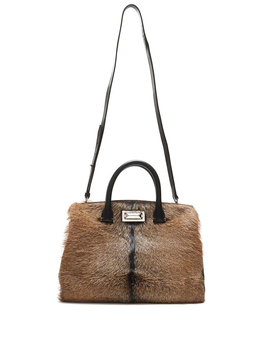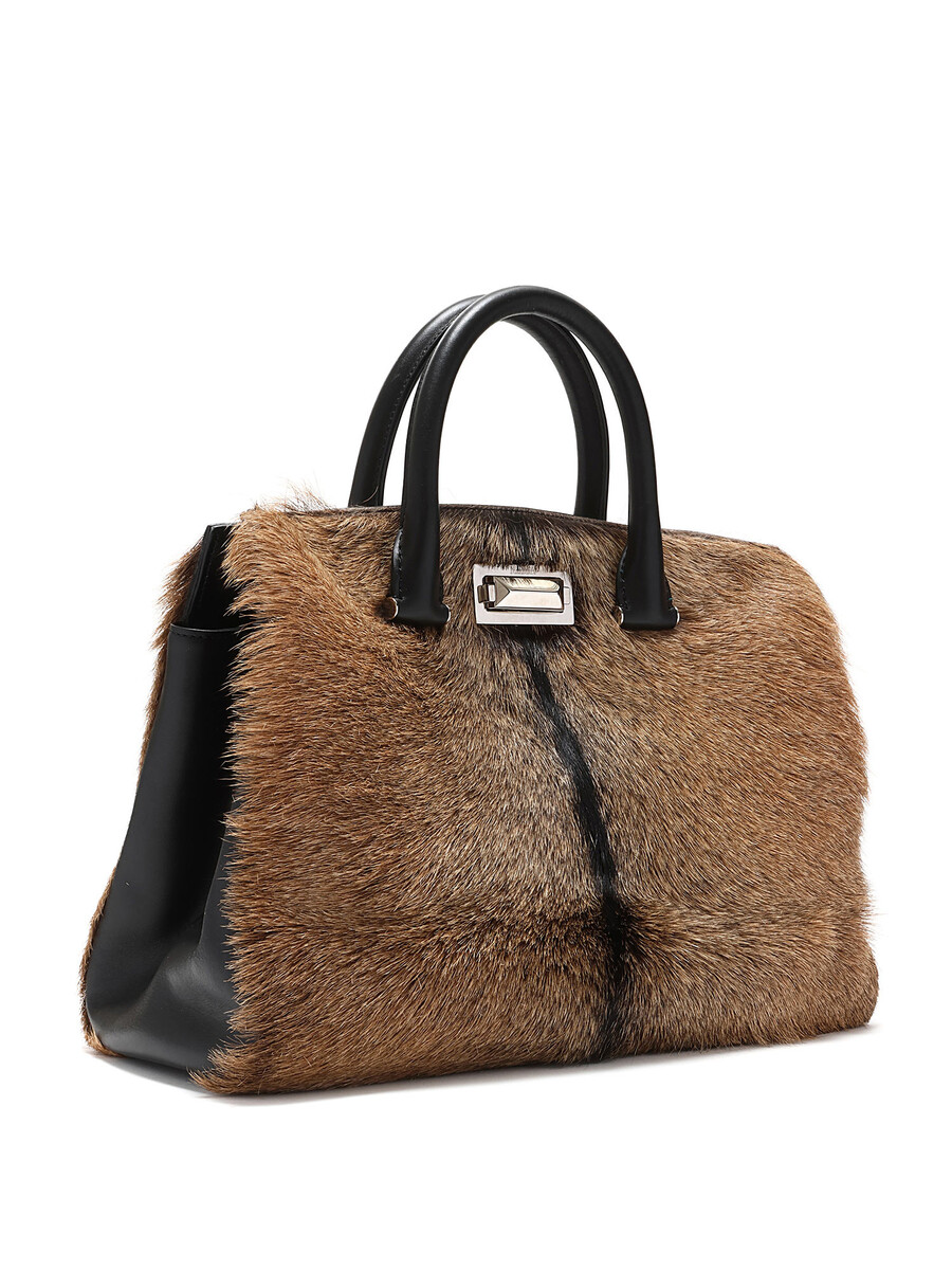 Sac fourreau en cuir de veau texturé, brun et noir, avec fermeture à loquet tournant. Poignées supérieures et bandoulière amovible en cuir noir. Quincaillerie argentée.