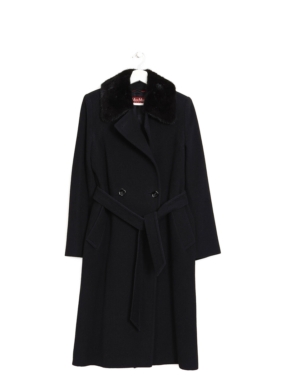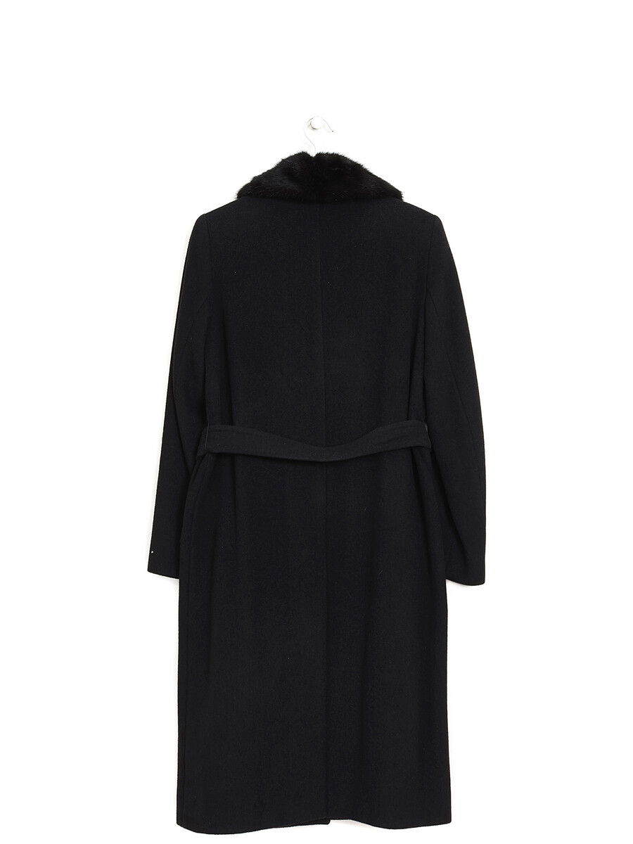Manteau long en mélange d'angora noir avec fermeture à double boutonnage. Col tailleur à bordure en fausse fourrure. Poches à rabat sur le devant.