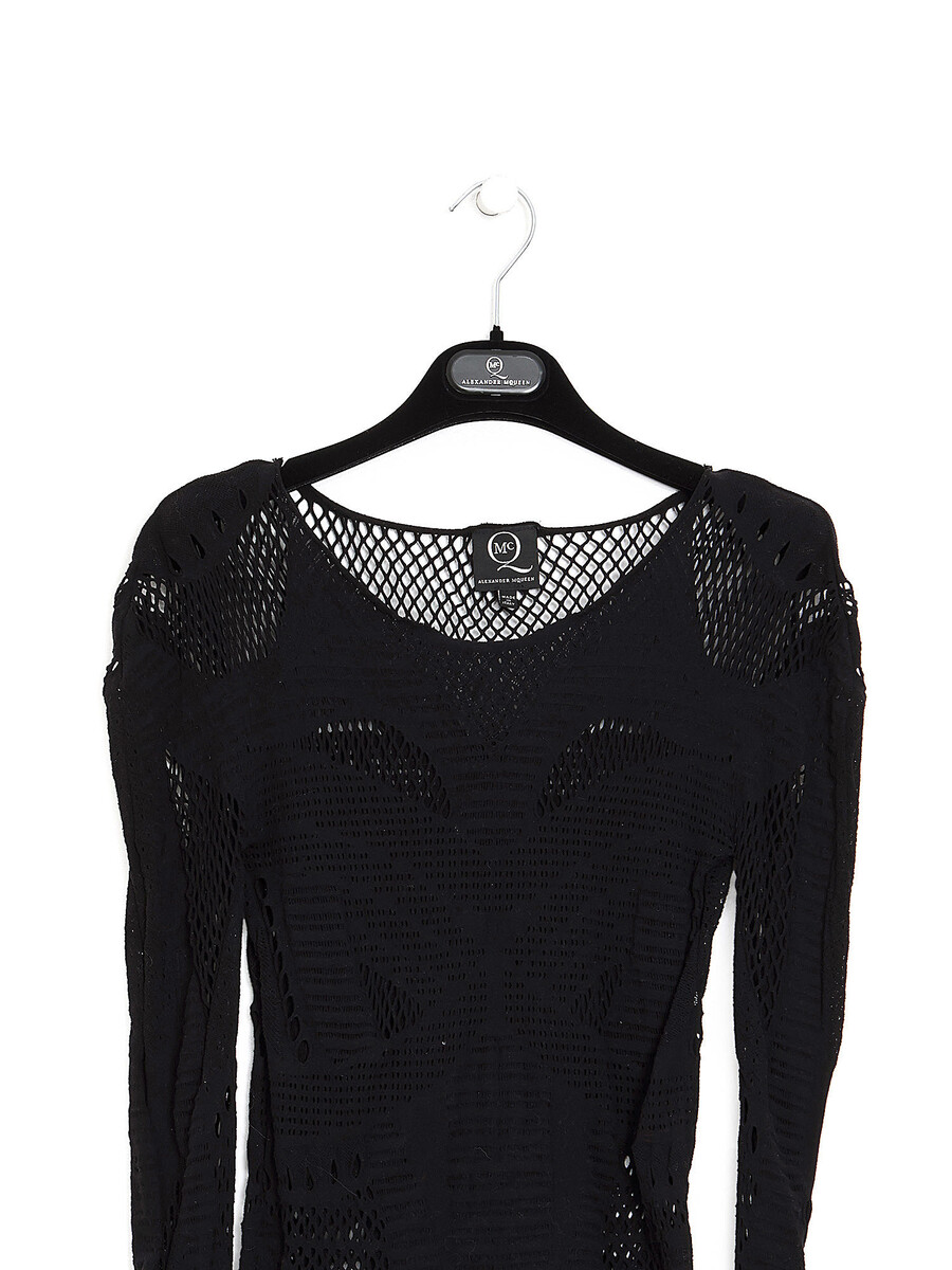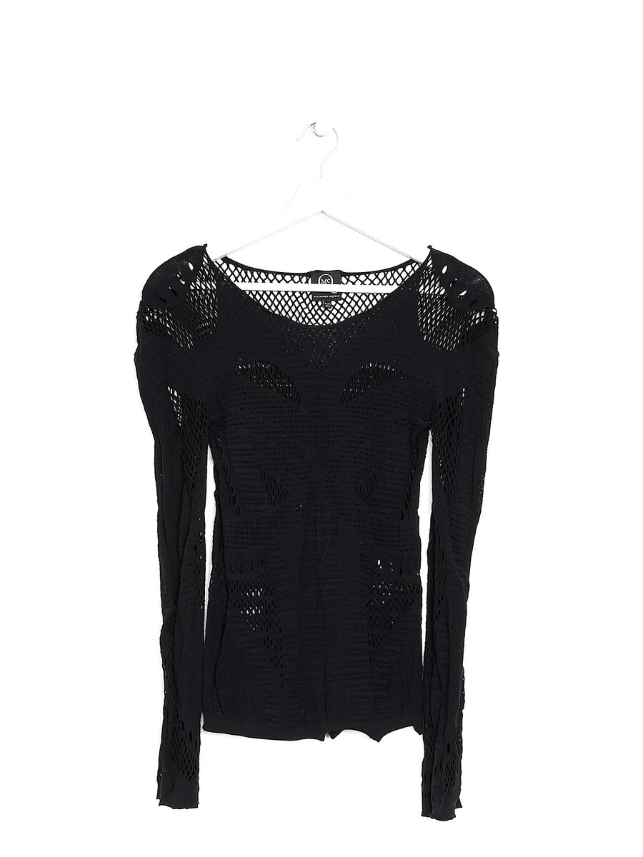 Haut à manches longues en résille avec motifs abstraits en noir. Encolure ronde.