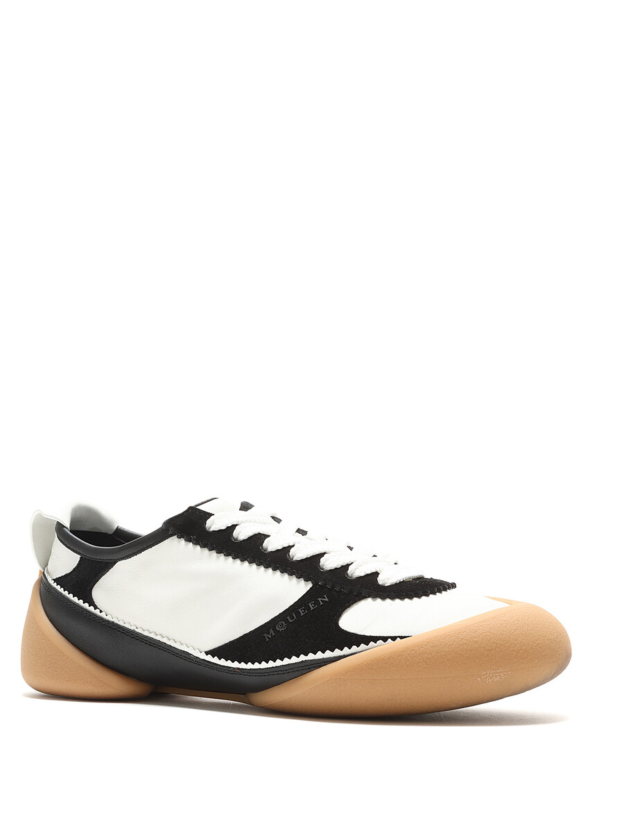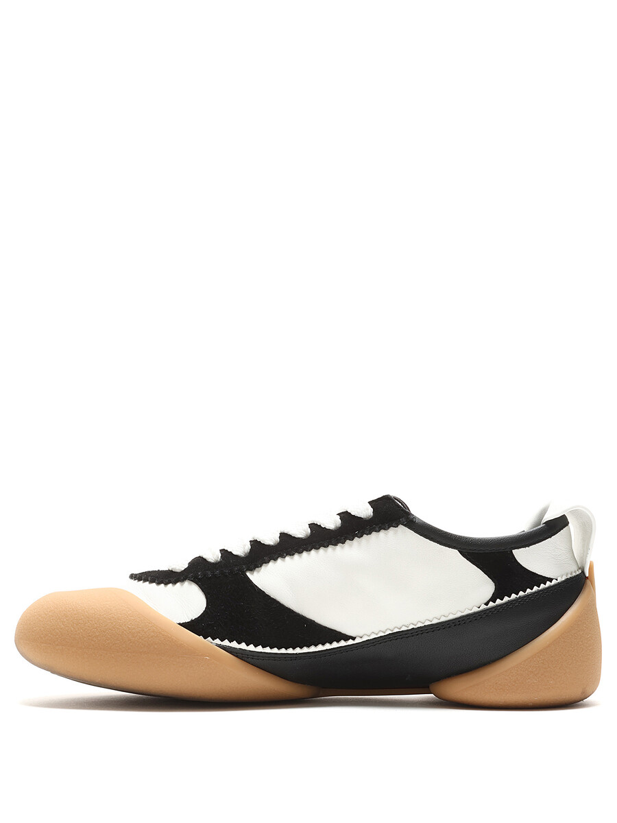 Baskets montantes en cuir et tissu avec un design bicolore et une semelle contrastée en noir, blanc, et beige. Bout rond. Fermeture à lacets. Semelle en caoutchouc. Avec boîte.