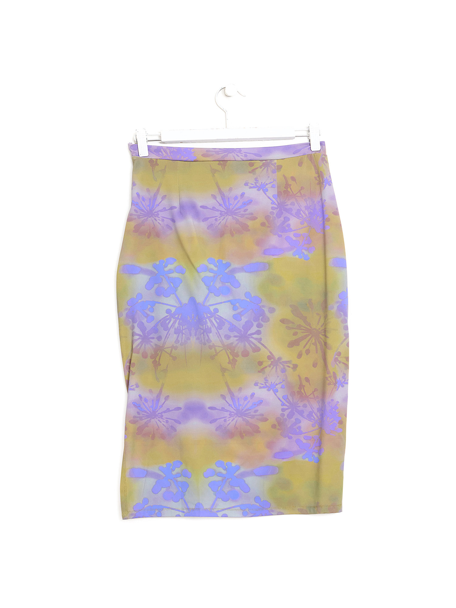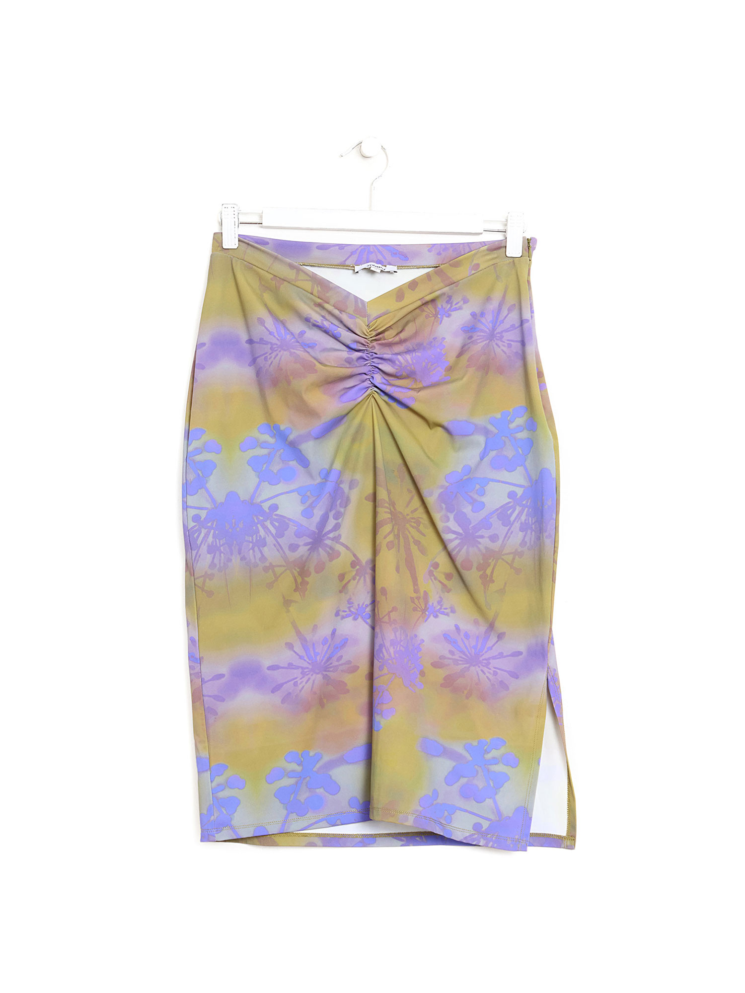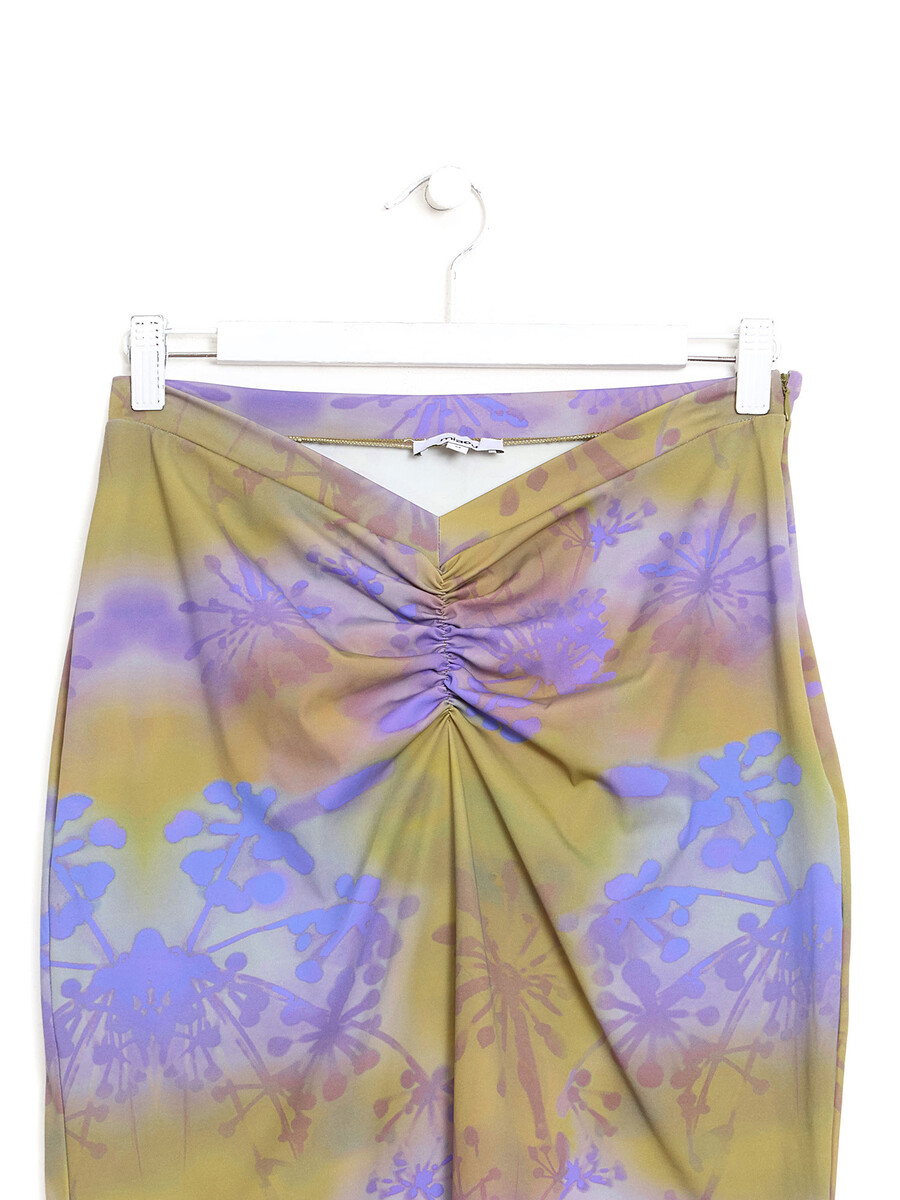 Jupe midi à imprimé abstrait en vert et violet. Détails froncés.