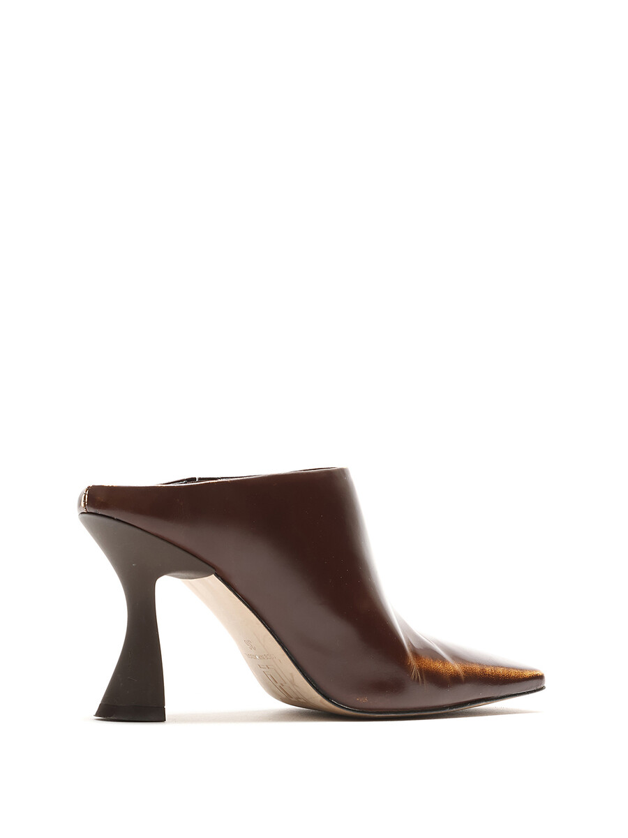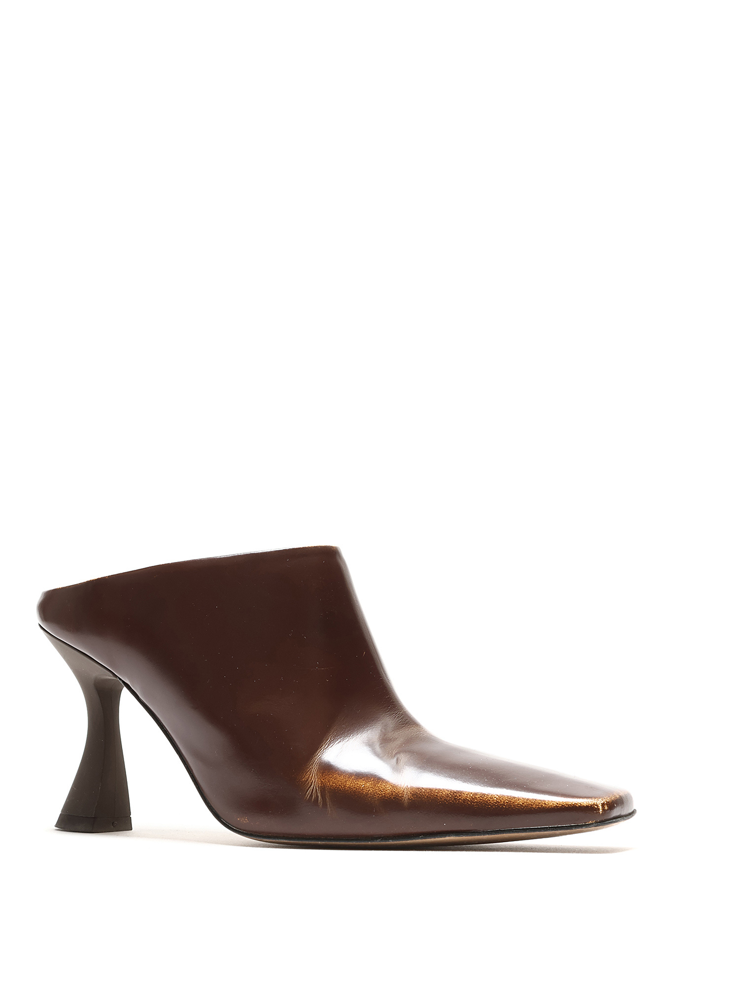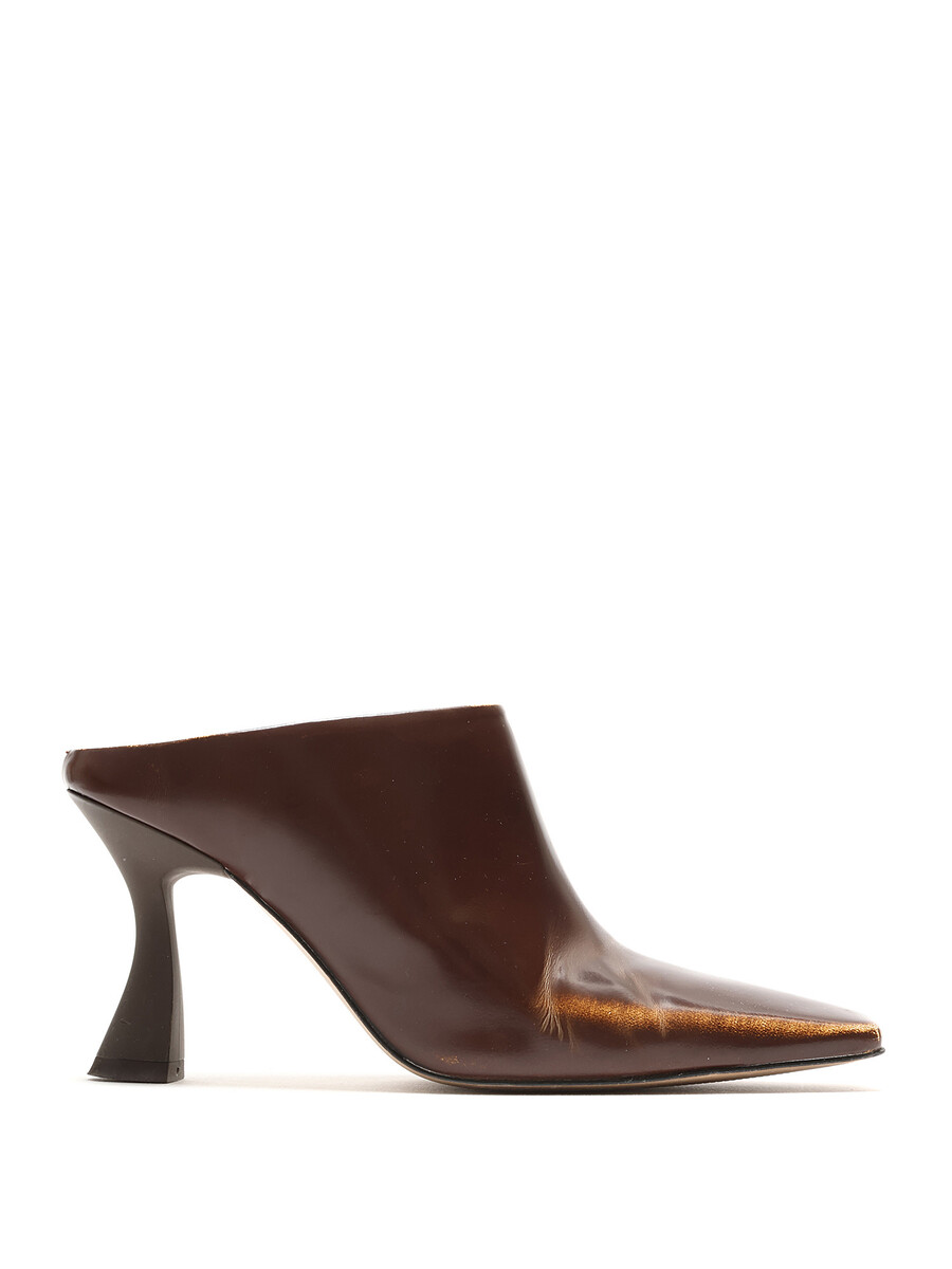 Mules à talon haut en cuir affligé brun. Design à bout carré.