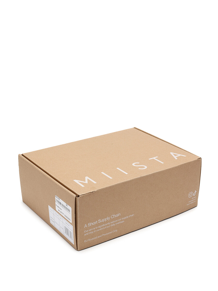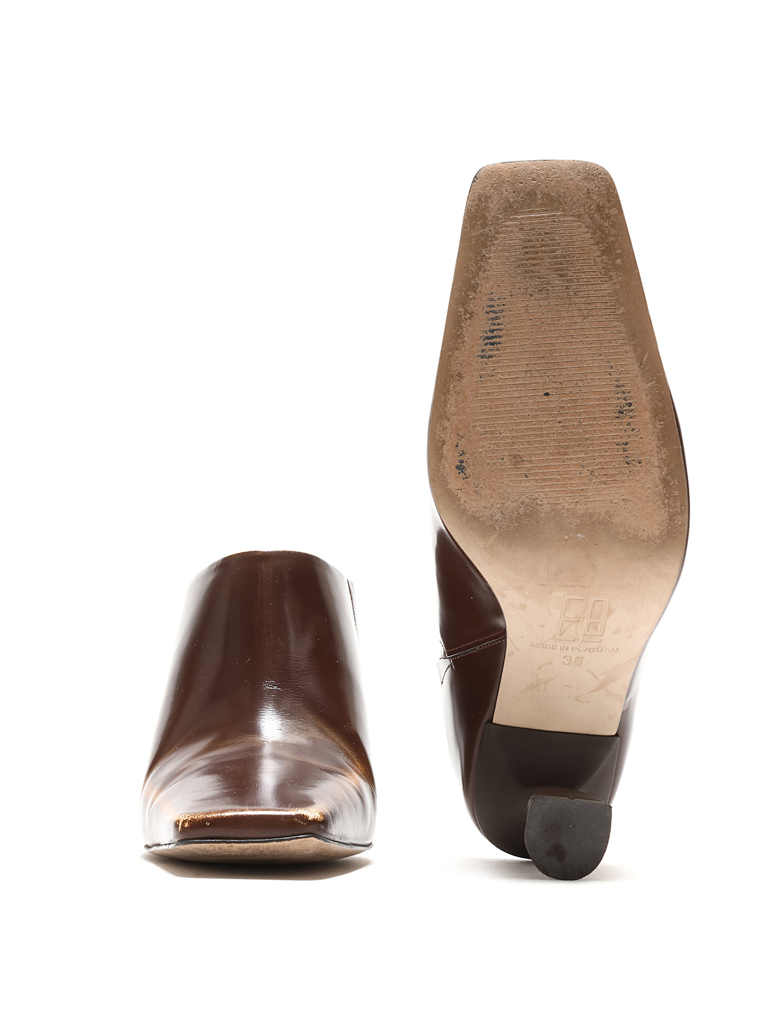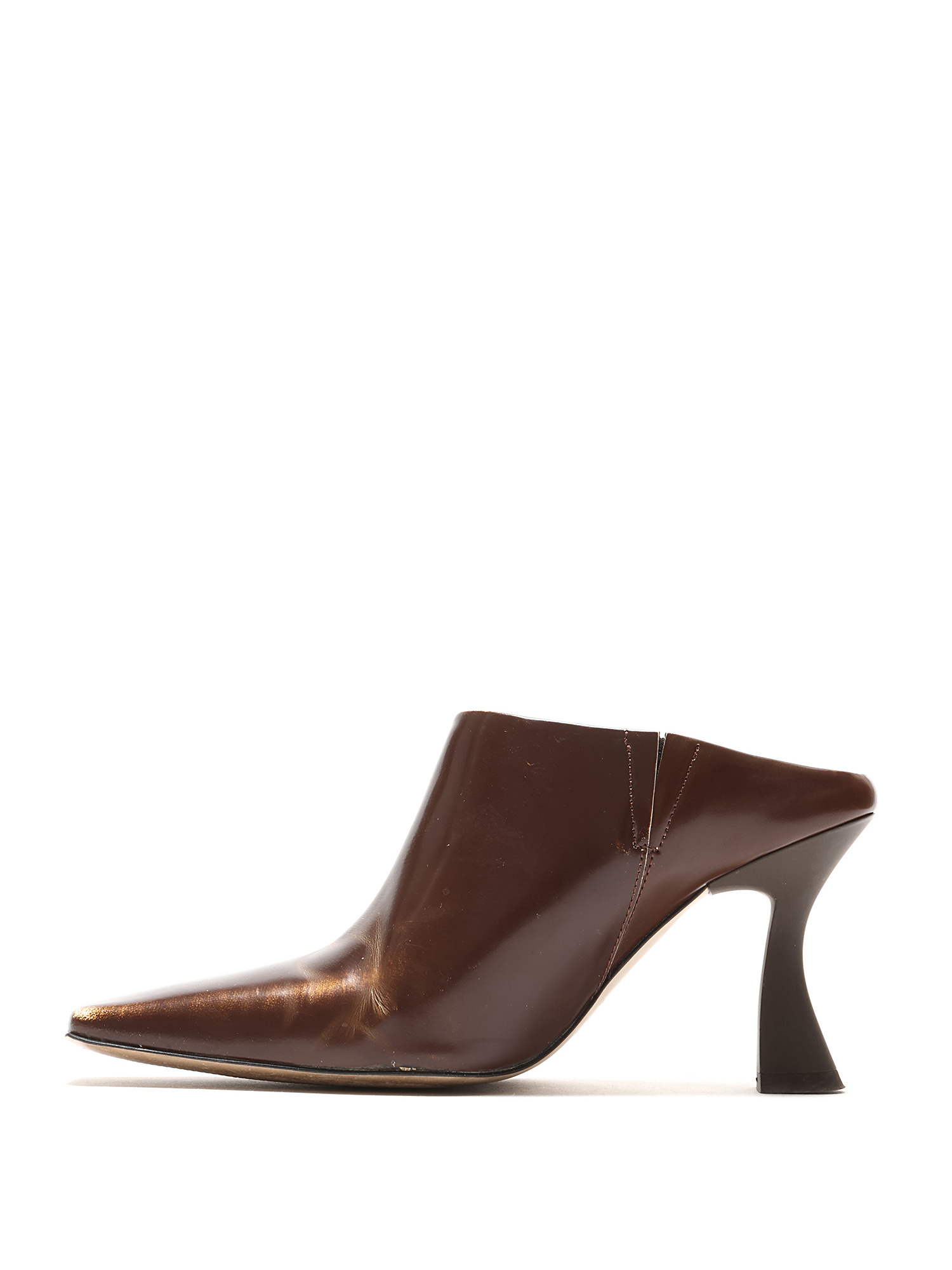 Mules à talon haut en cuir affligé brun. Design à bout carré.