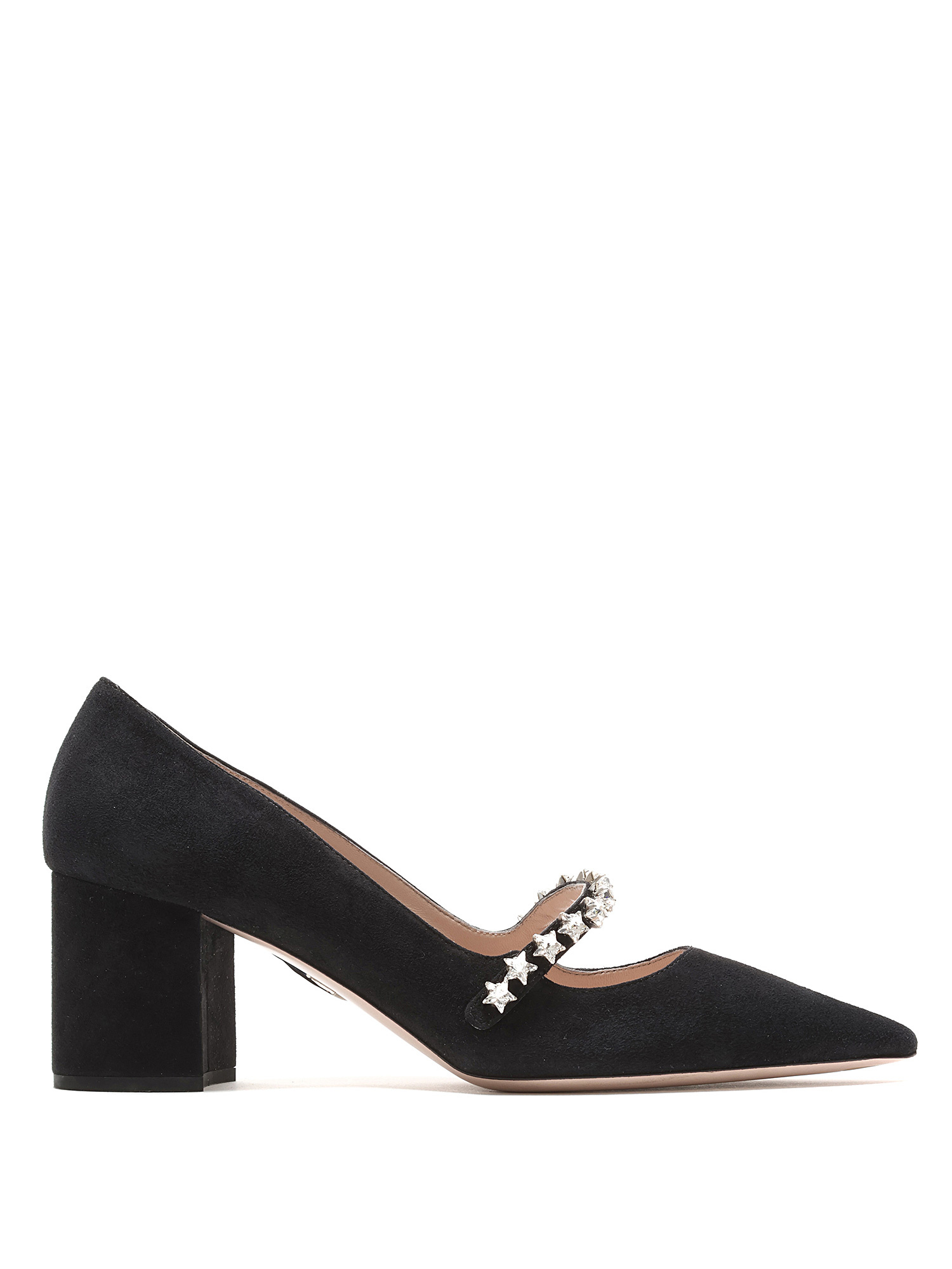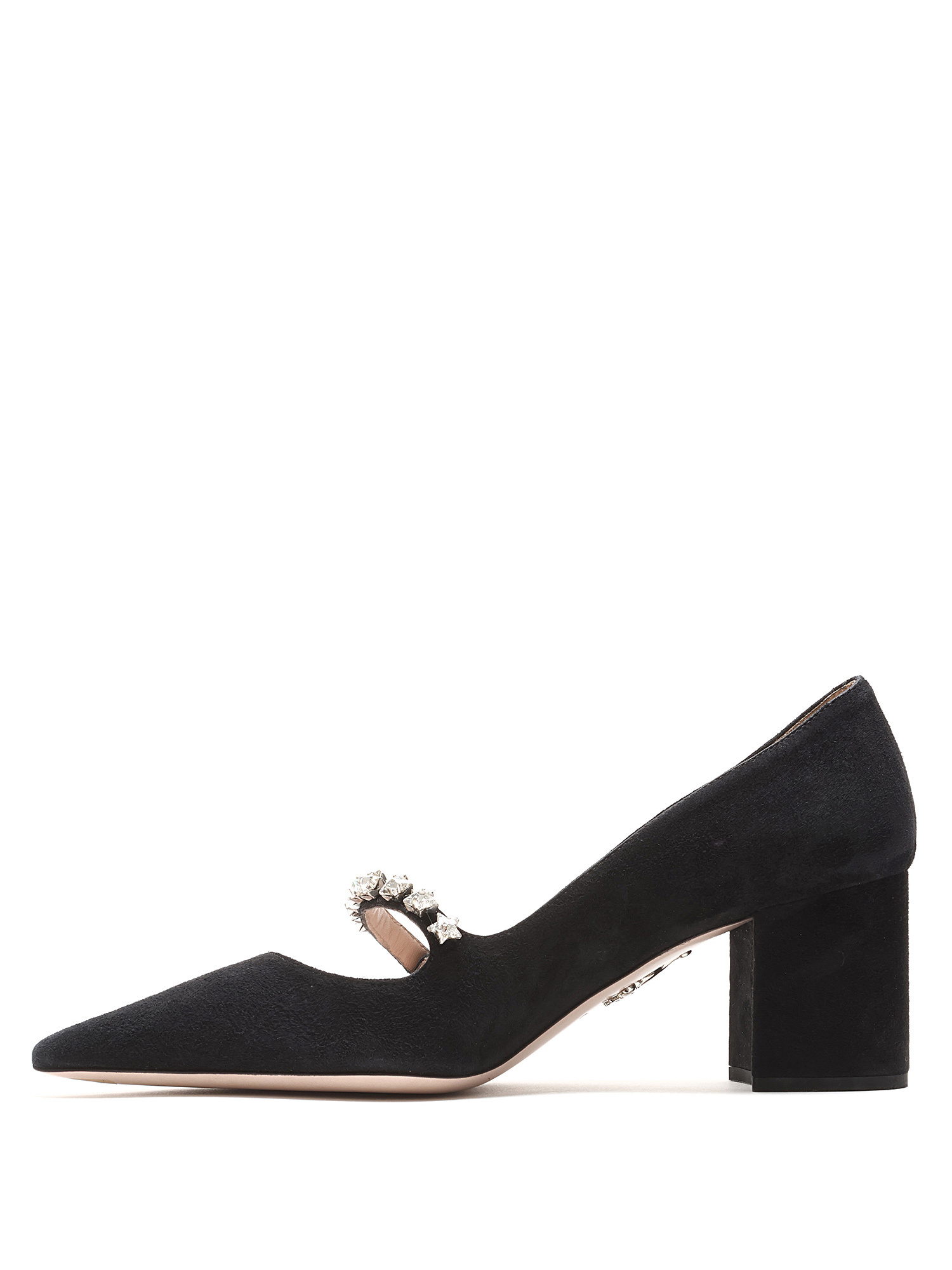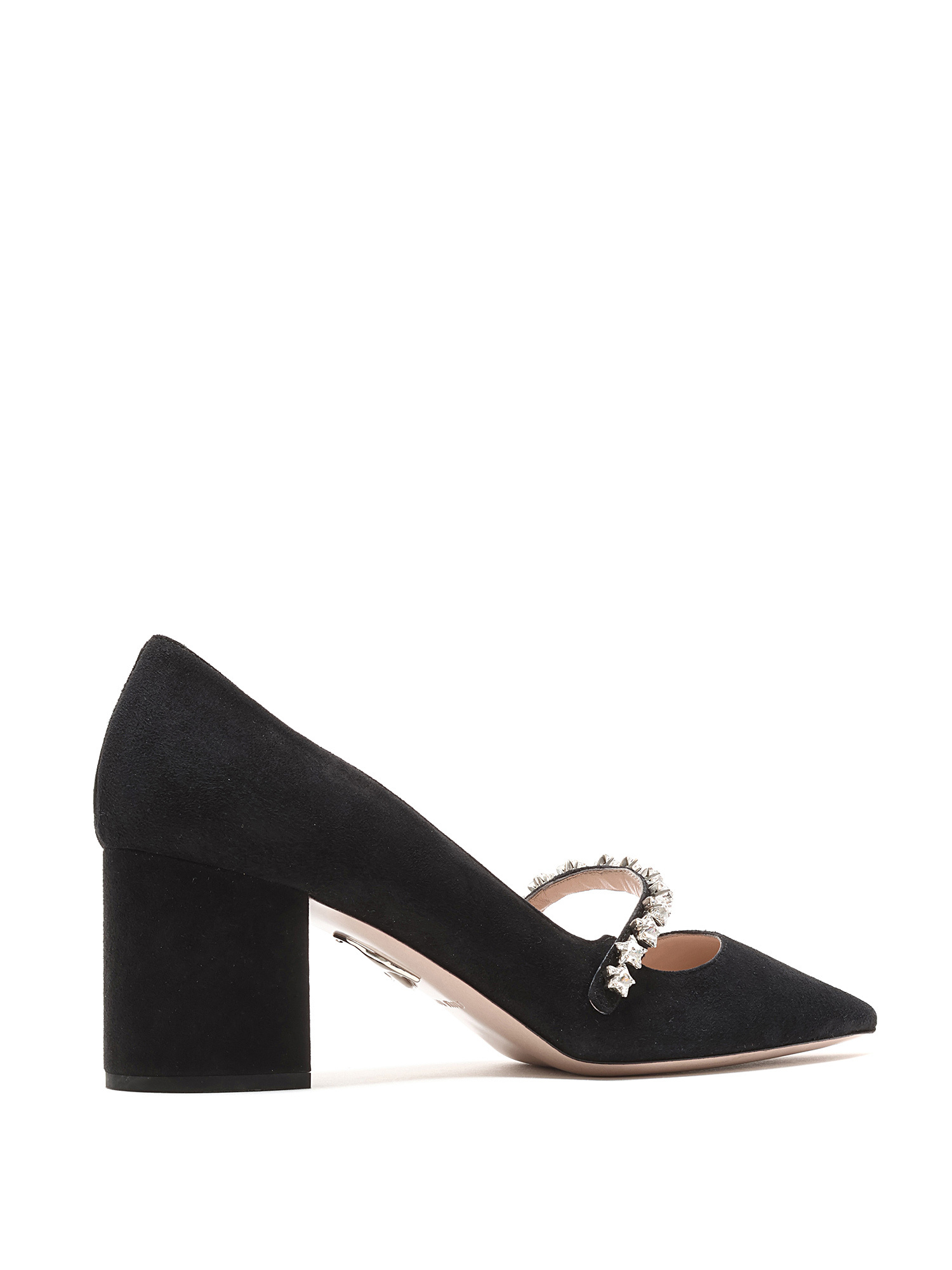 Ballerines en suède noires avec ornements en strass. Bout pointu. Bride arrière élastique. Semelle en cuir.