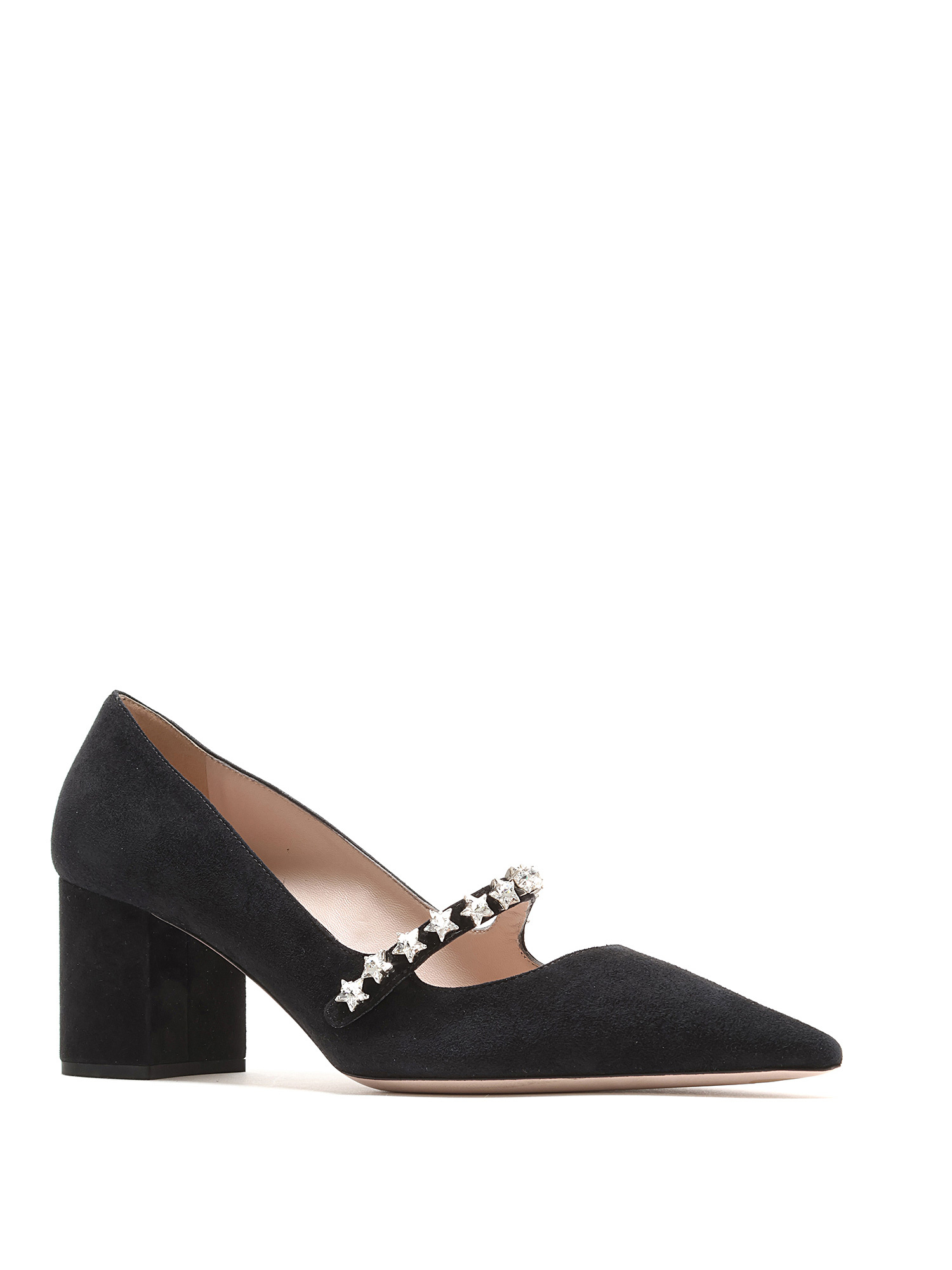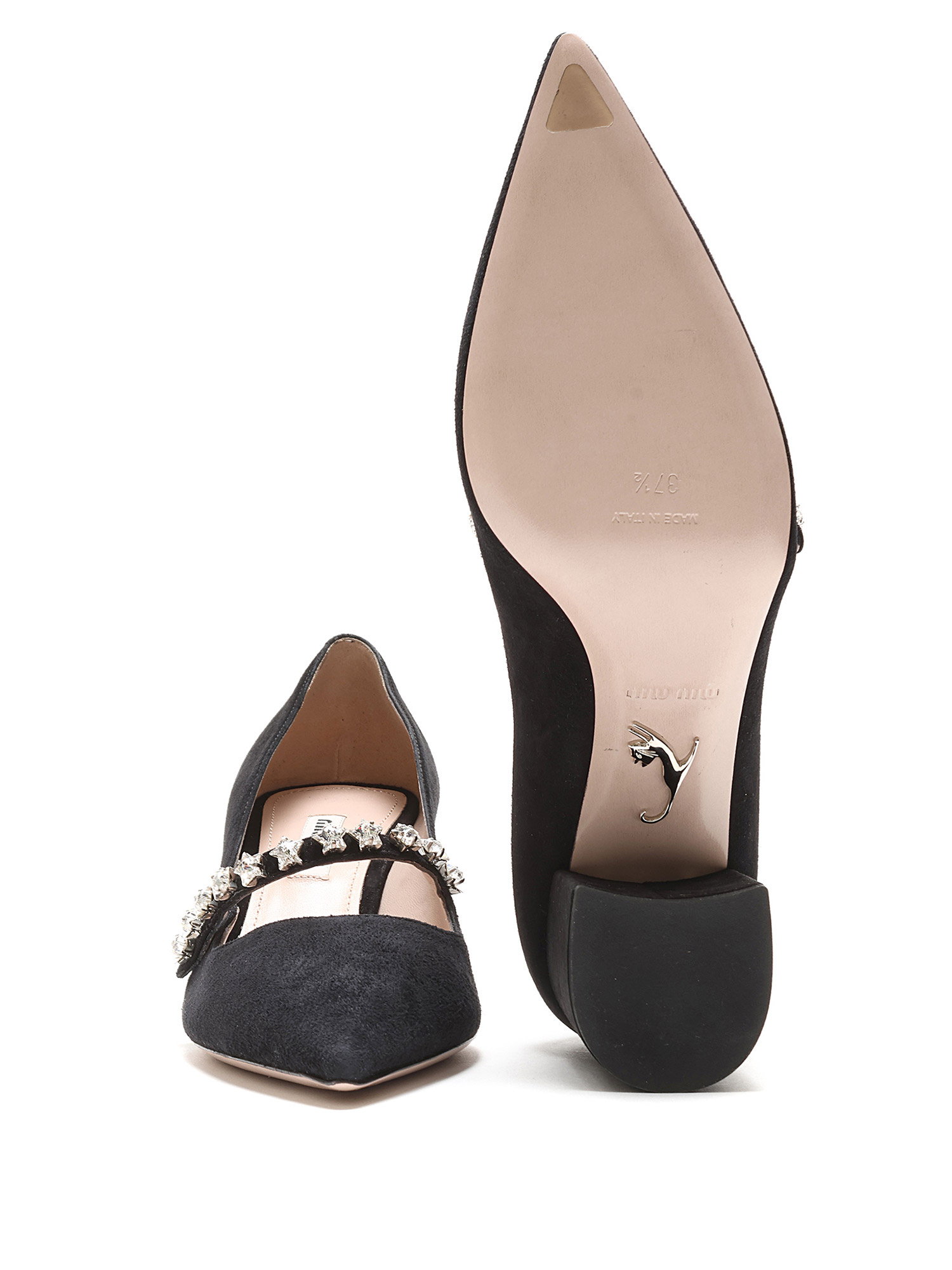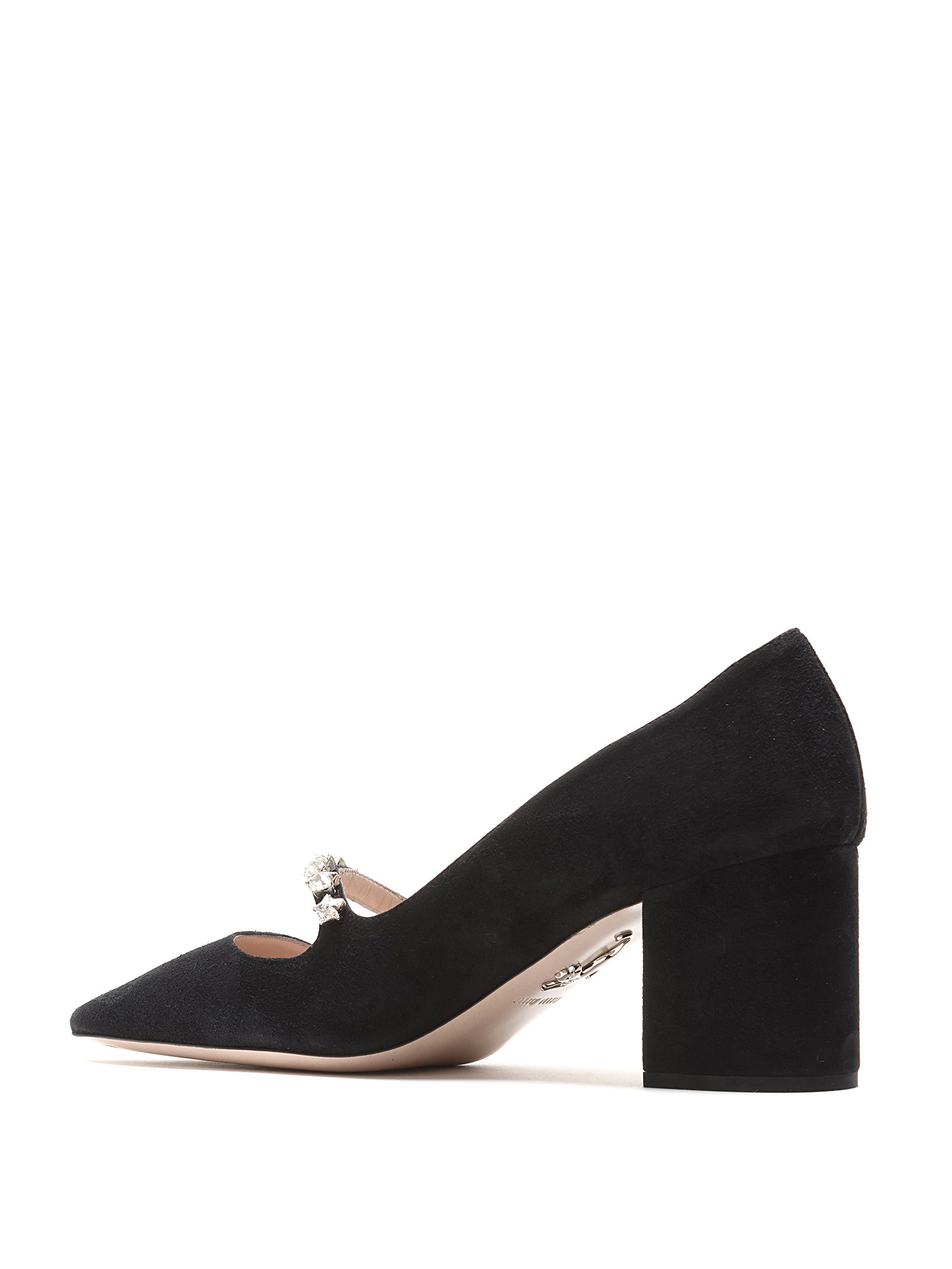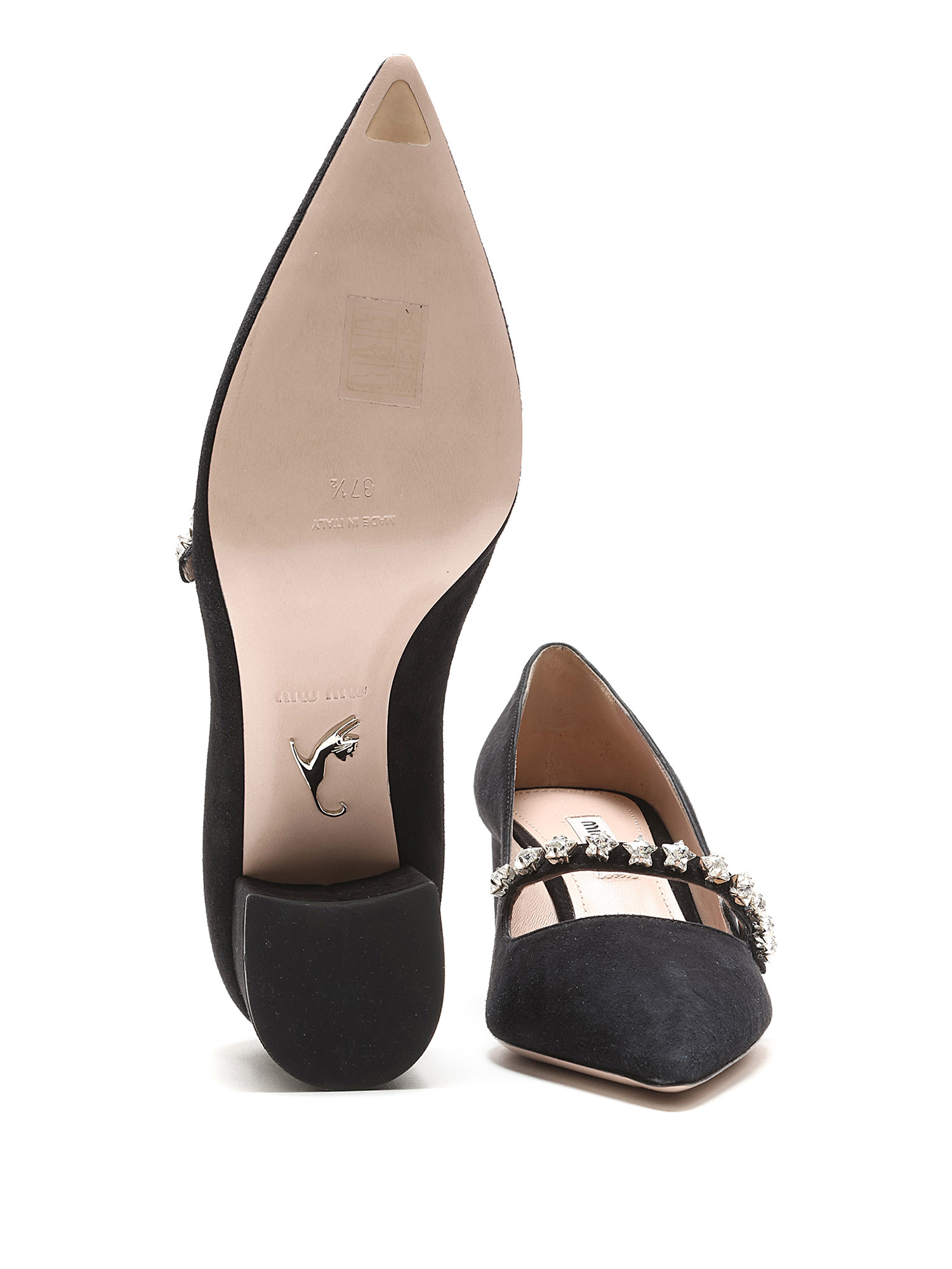 Ballerines en suède noires avec ornements en strass. Bout pointu. Bride arrière élastique. Semelle en cuir.