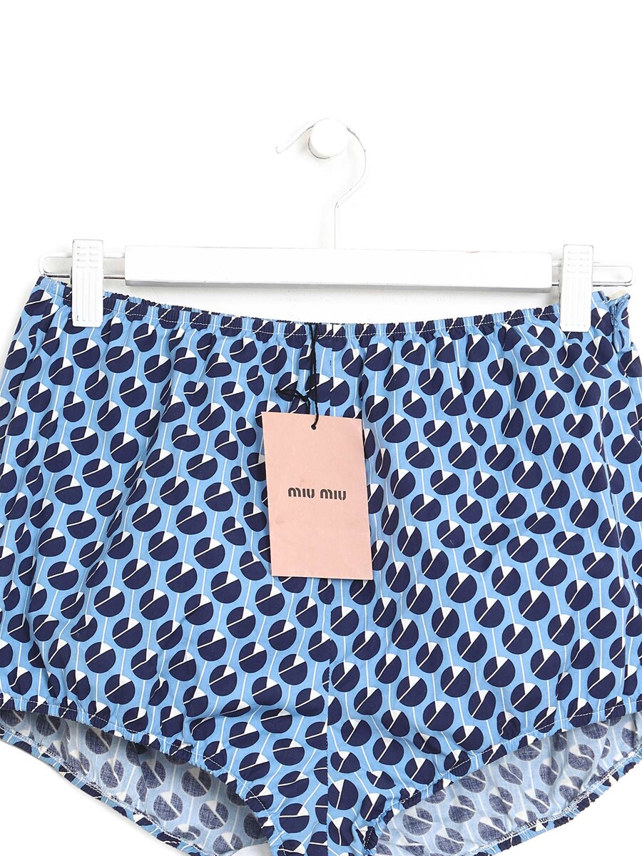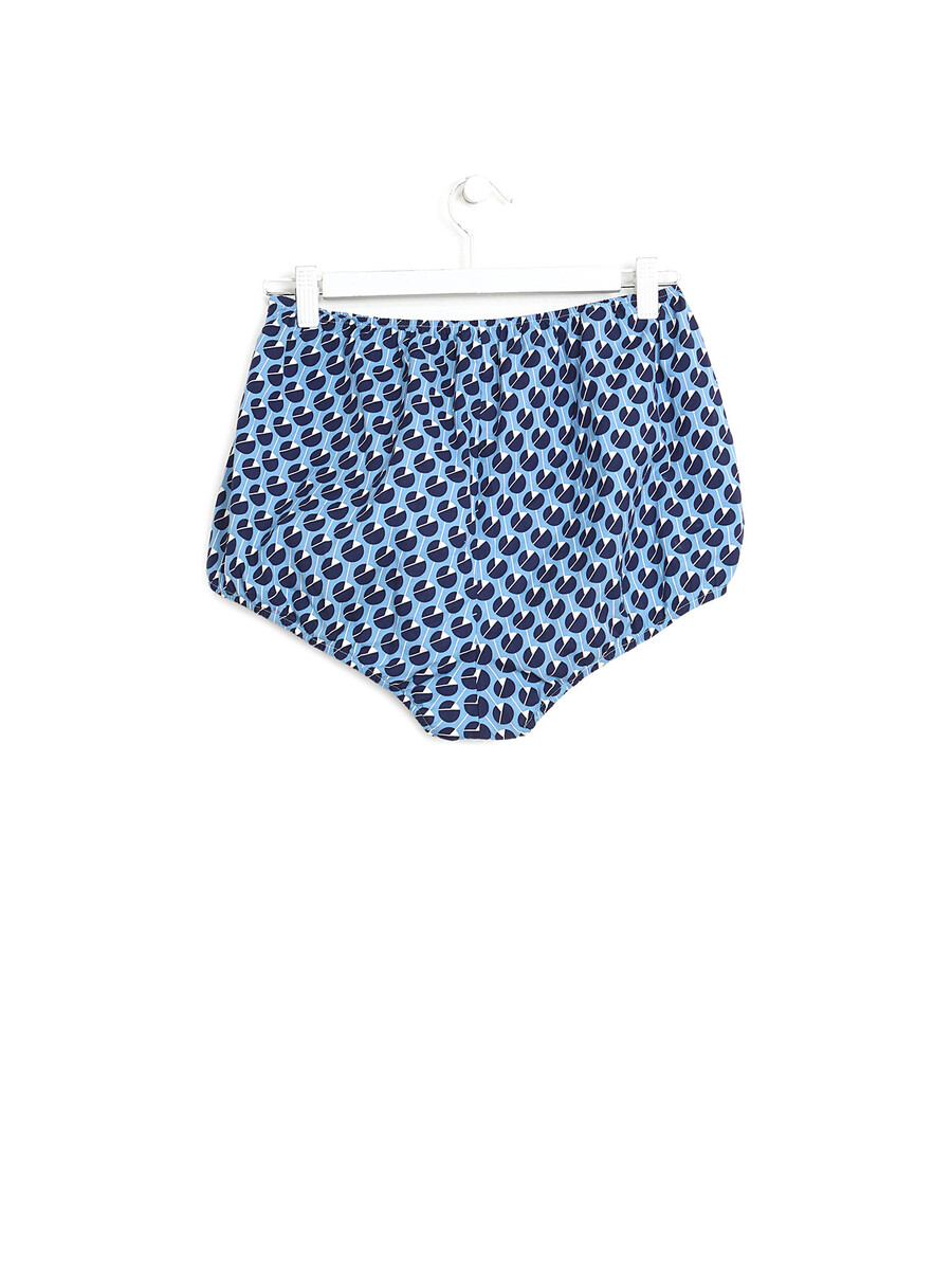 Shorts taille haute à motif à pois blancs sur fond bleu. Taille élastiquée avec fermeture éclair latérale et bouton.