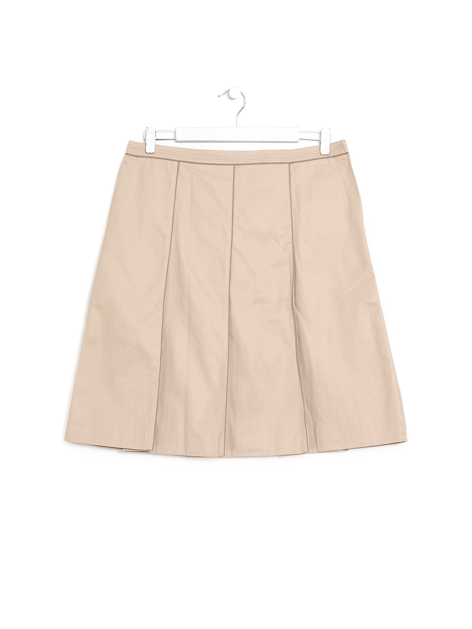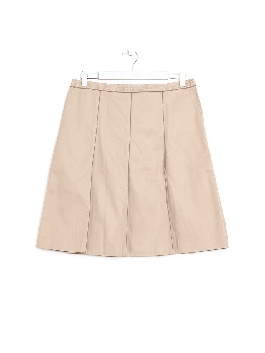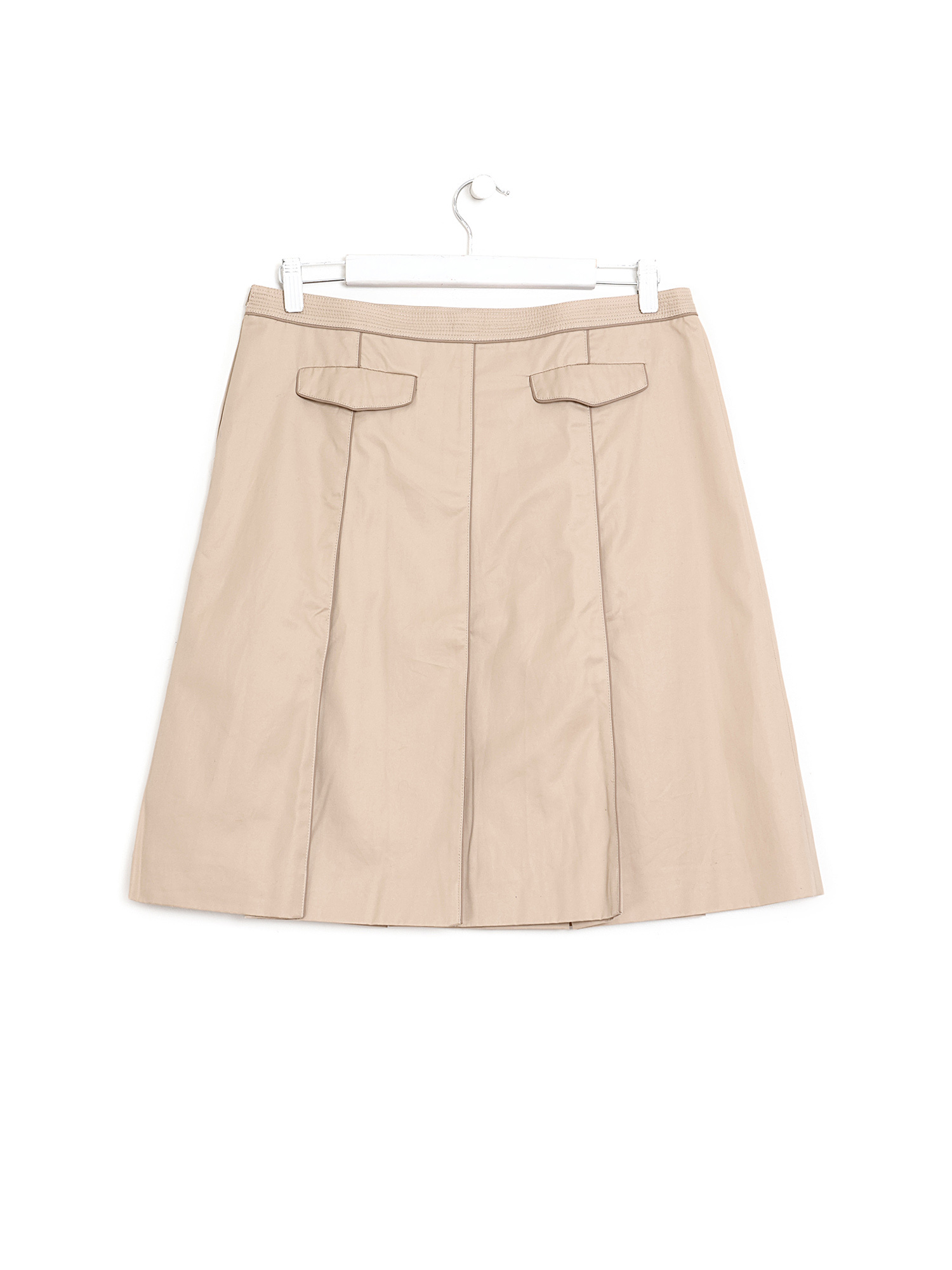 Jupe mi-longue plissée en coton beige. Fermeture à glissière. Deux poches à rabat à l’arrière.