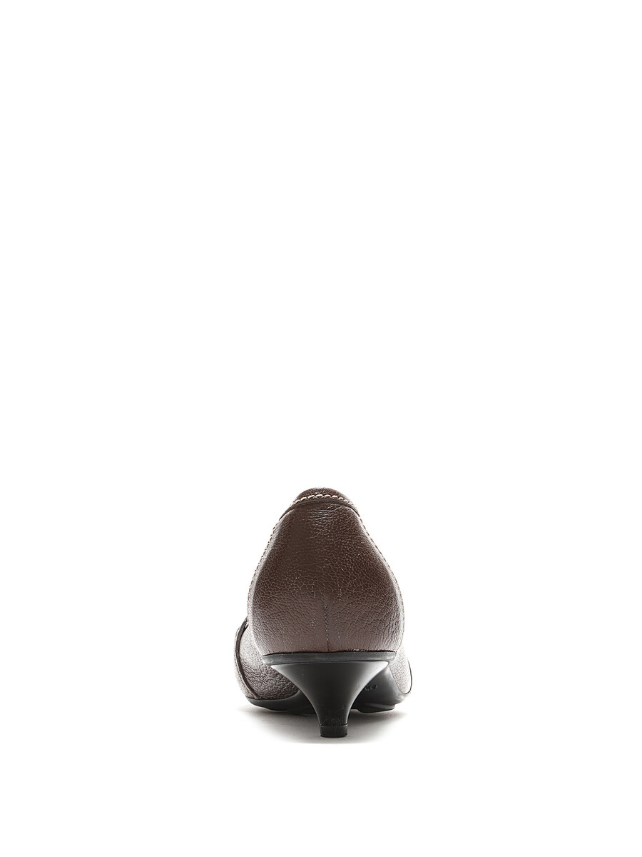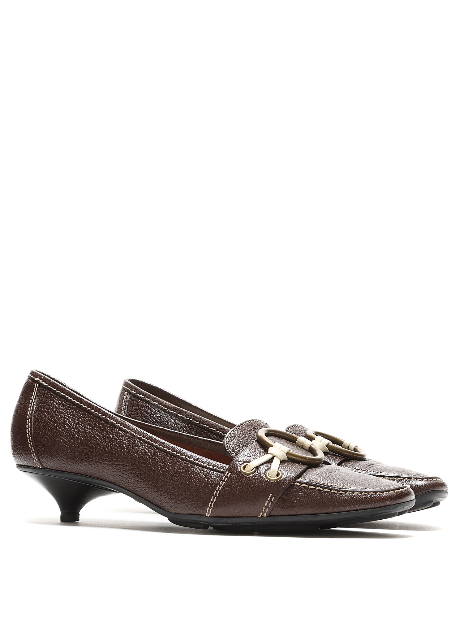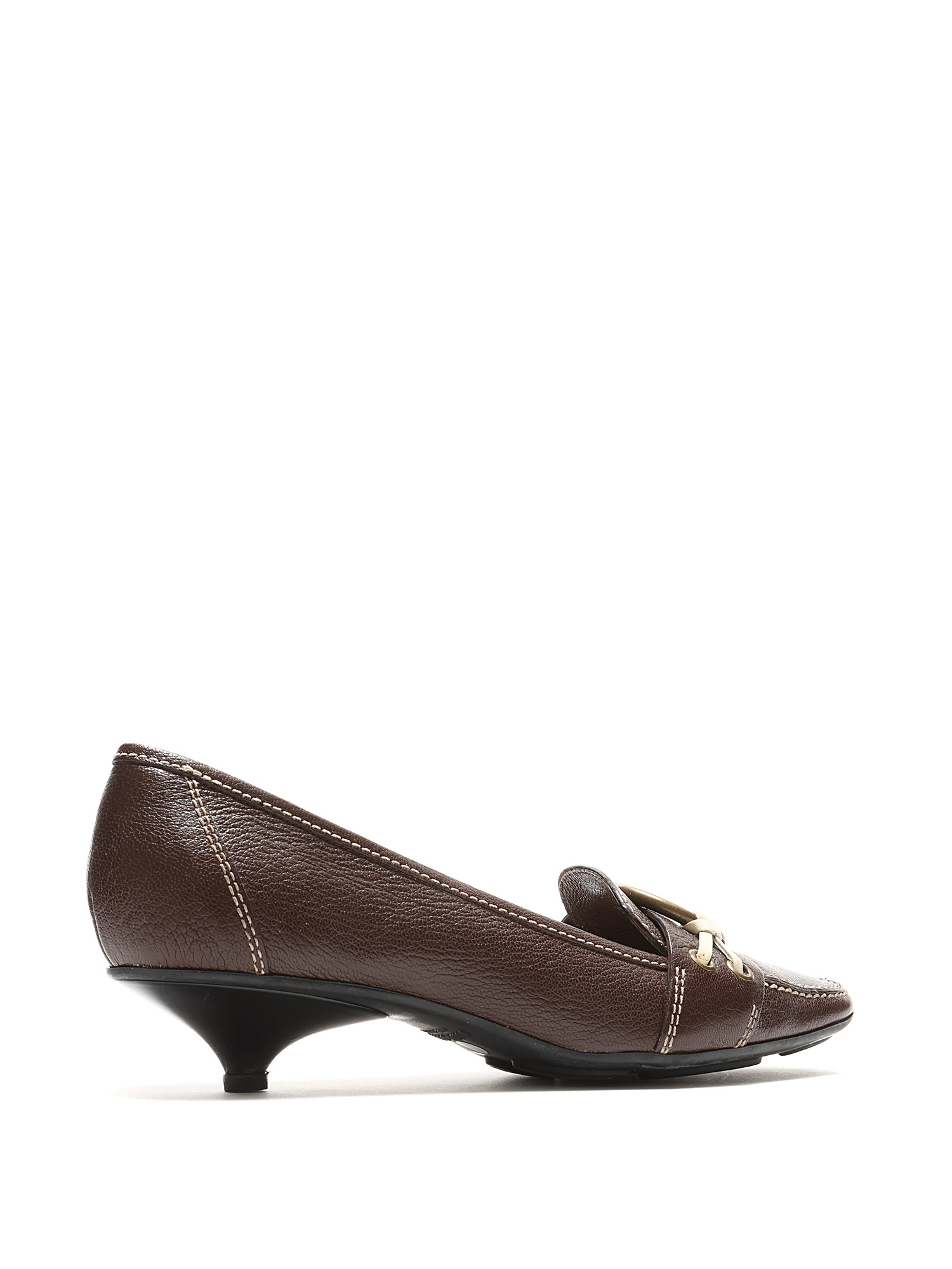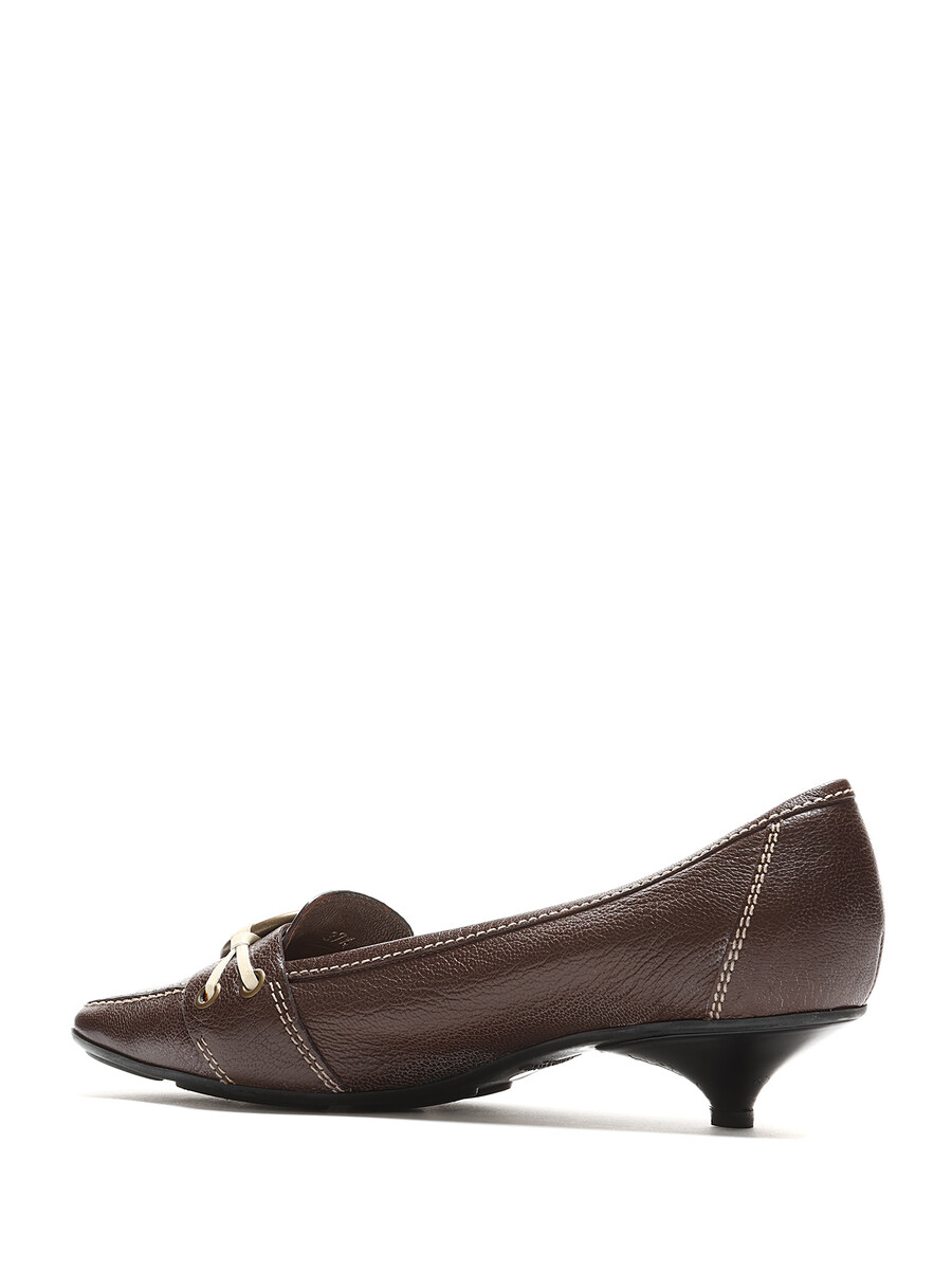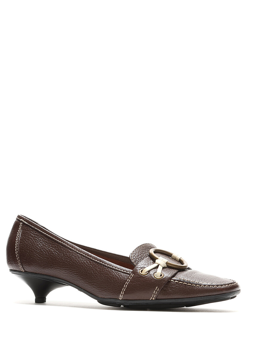 Mocassins à talons bas en cuir marron ornés d'une boucle en laiton. Style à enfiler avec bout carré et semelle en caoutchouc.