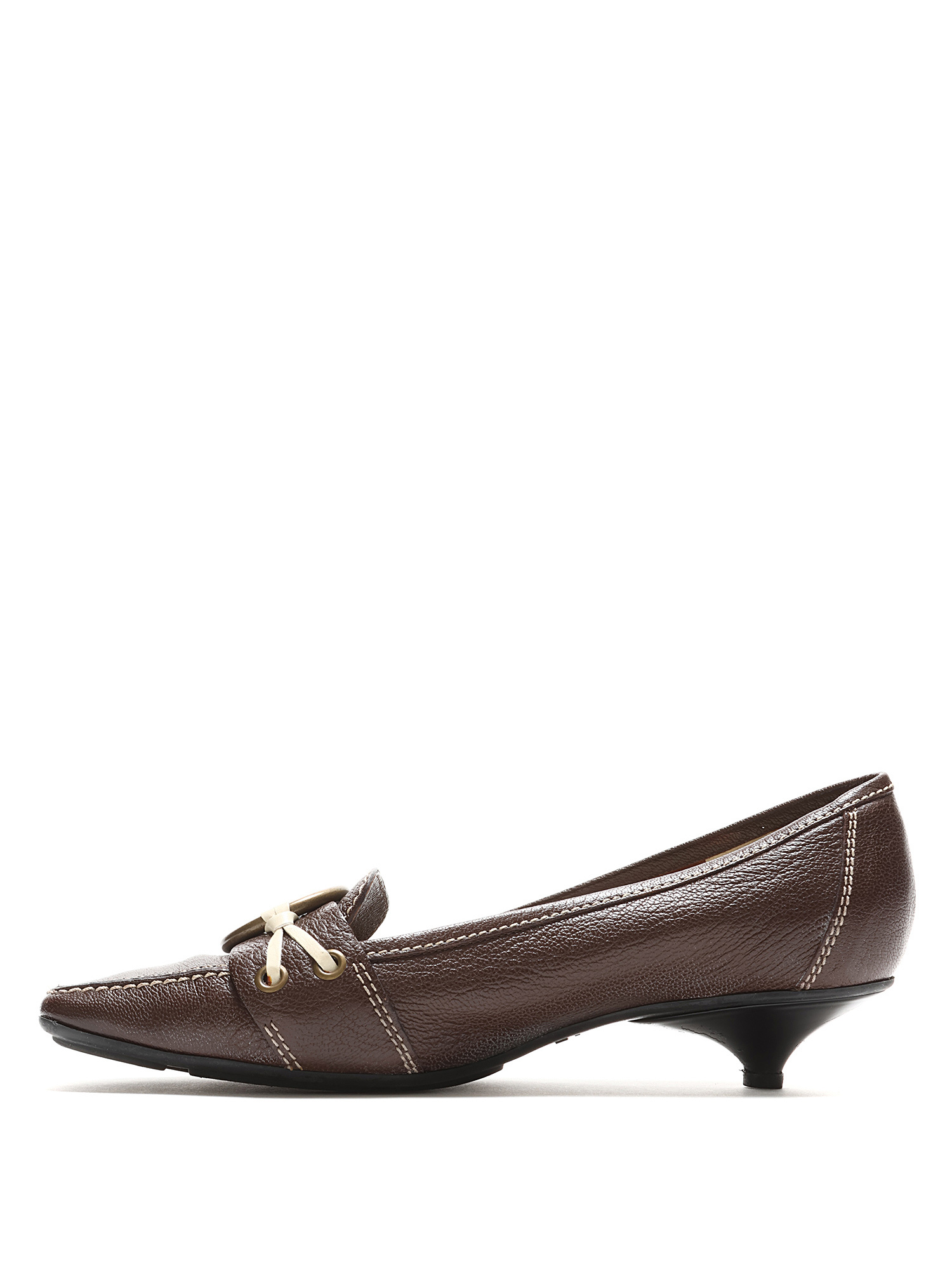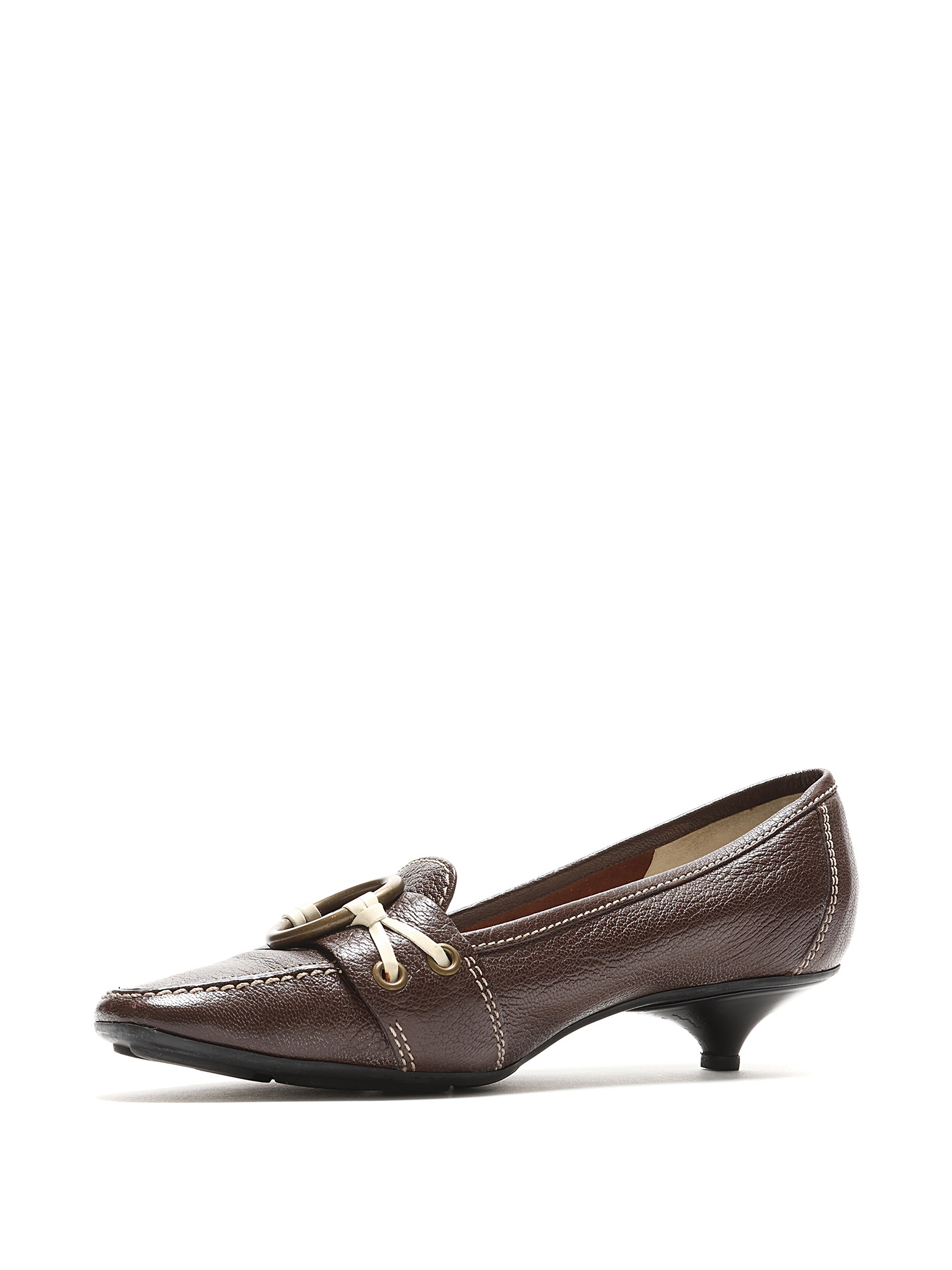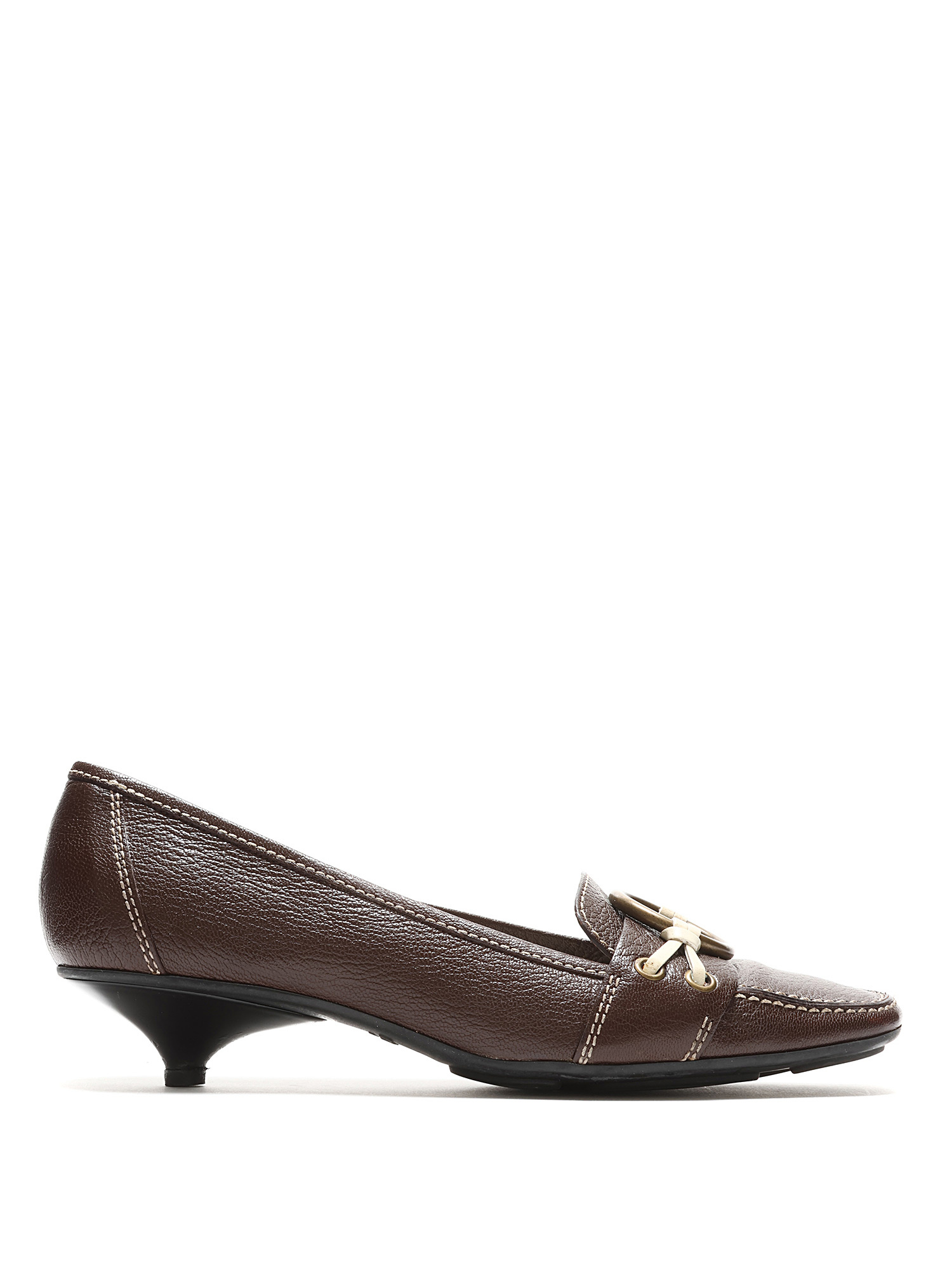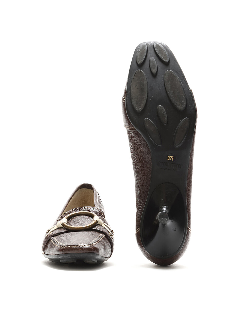 Mocassins à talons bas en cuir marron ornés d'une boucle en laiton. Style à enfiler avec bout carré et semelle en caoutchouc.