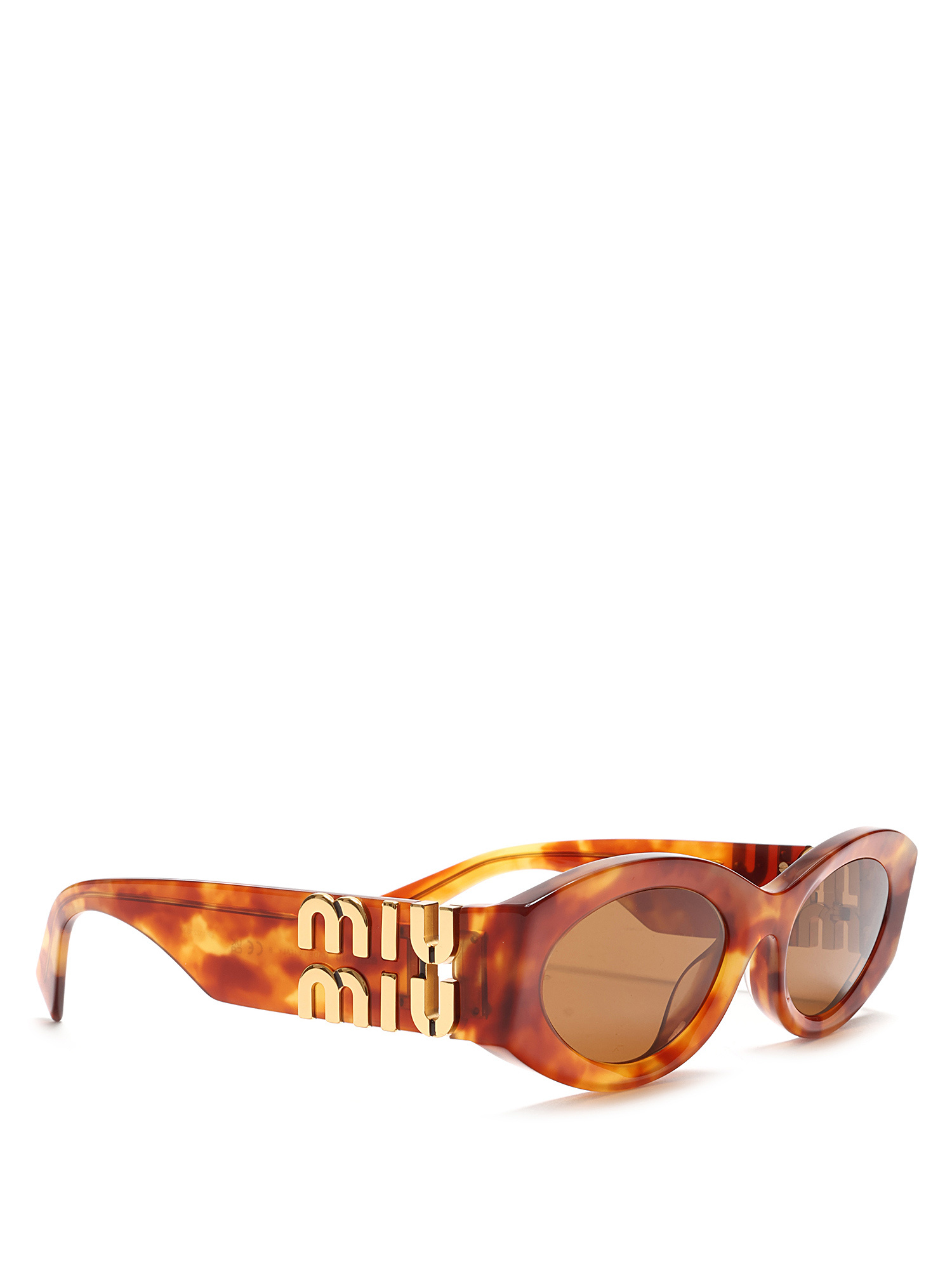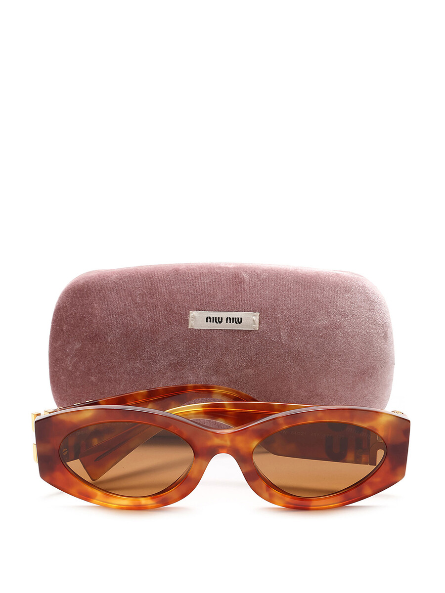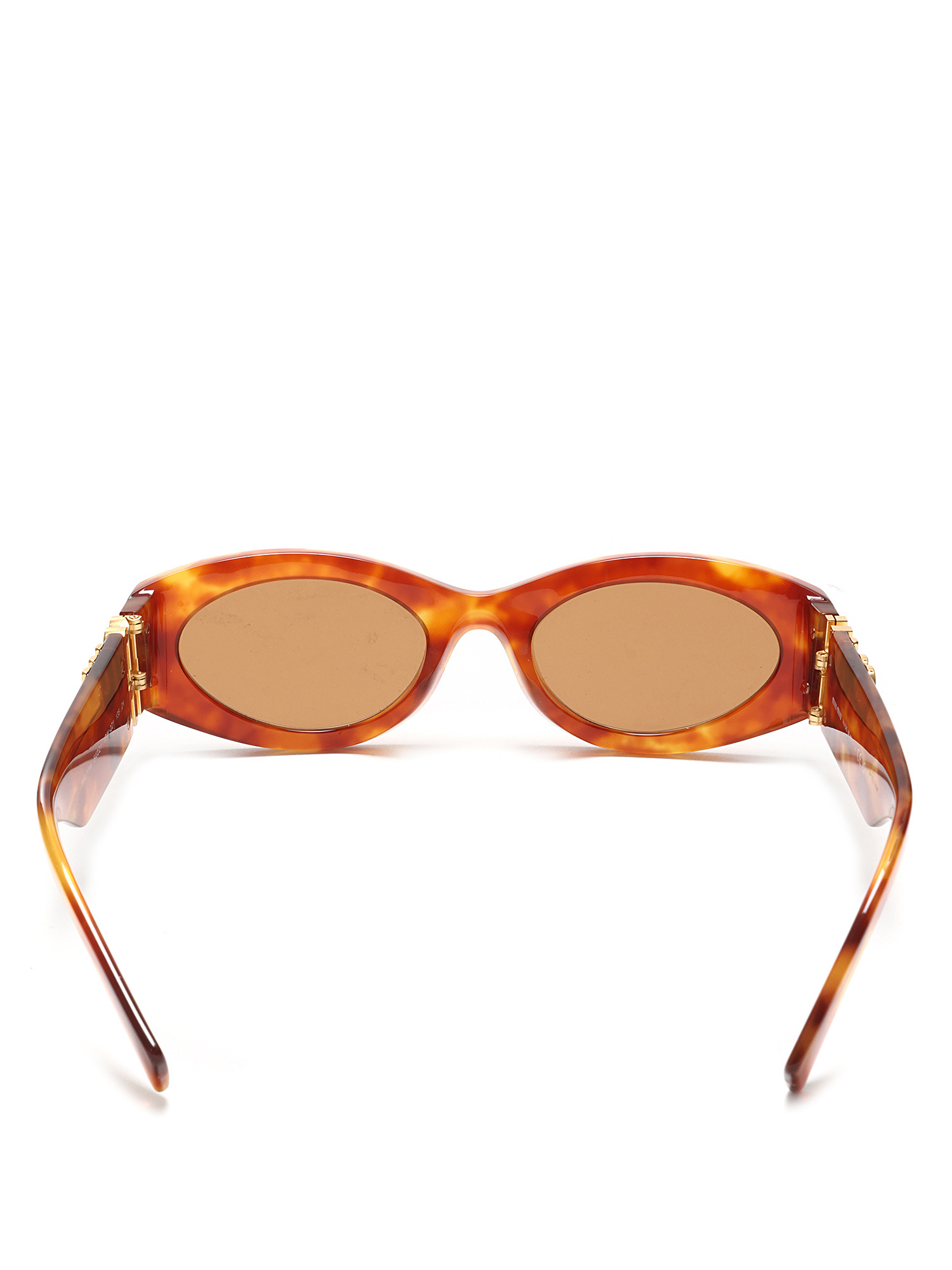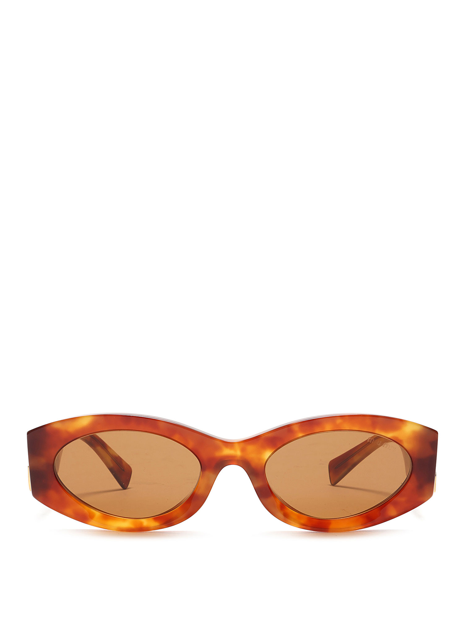 Lunettes de soleil ovales en acétate écaille de tortue dans les tons de brun et orange. Logo en métal doré aux branches. Avec étui de protection.
