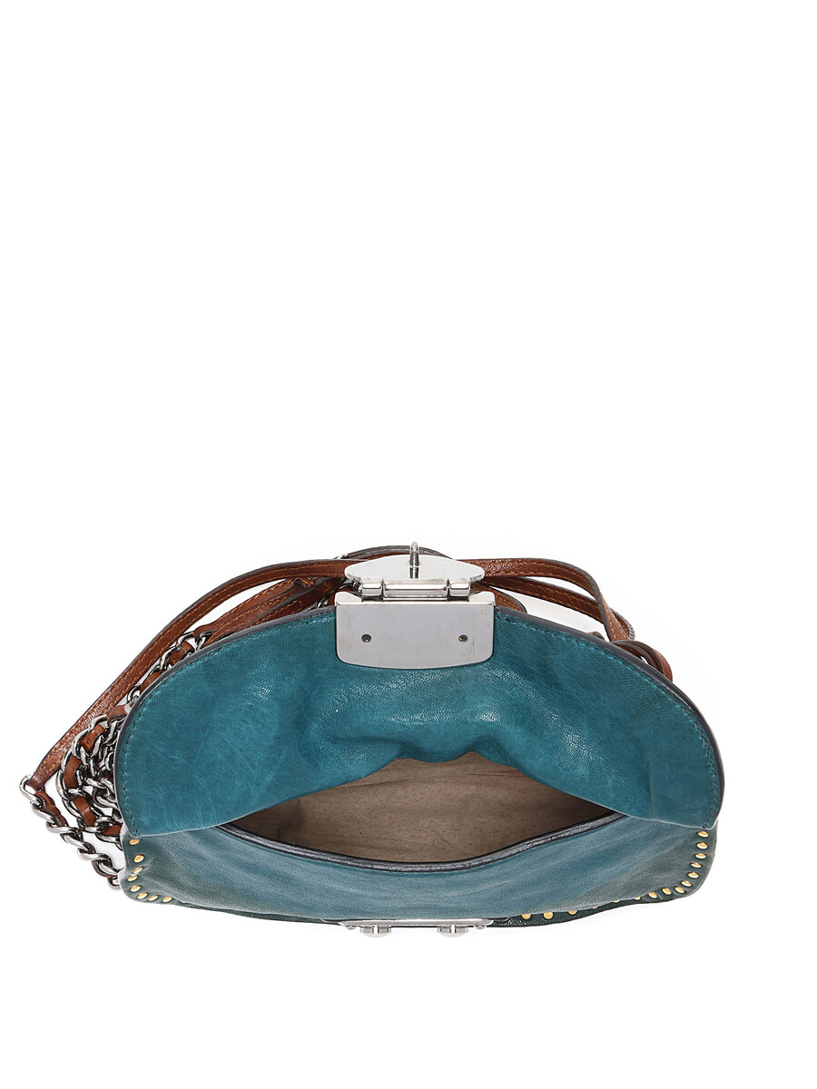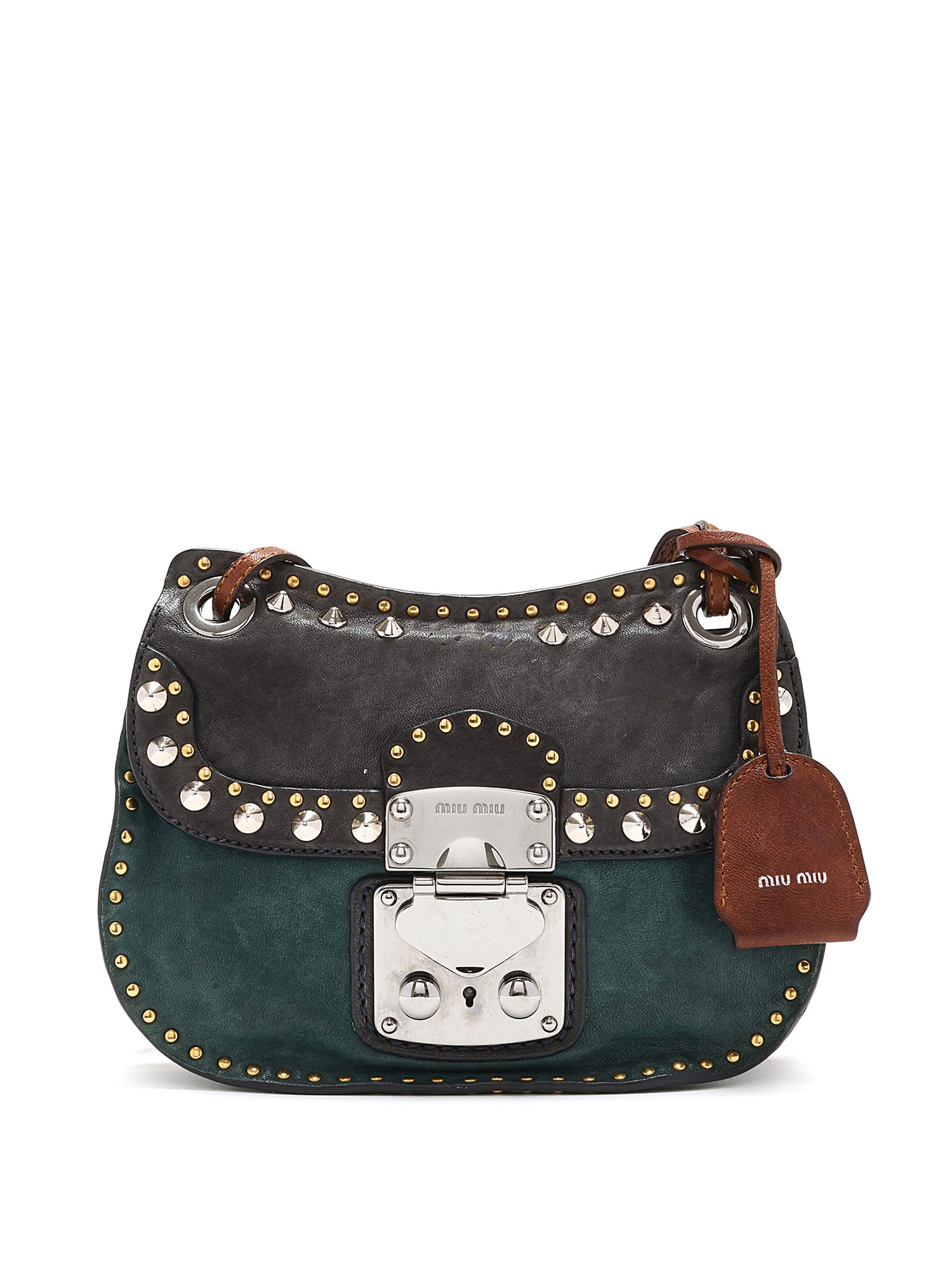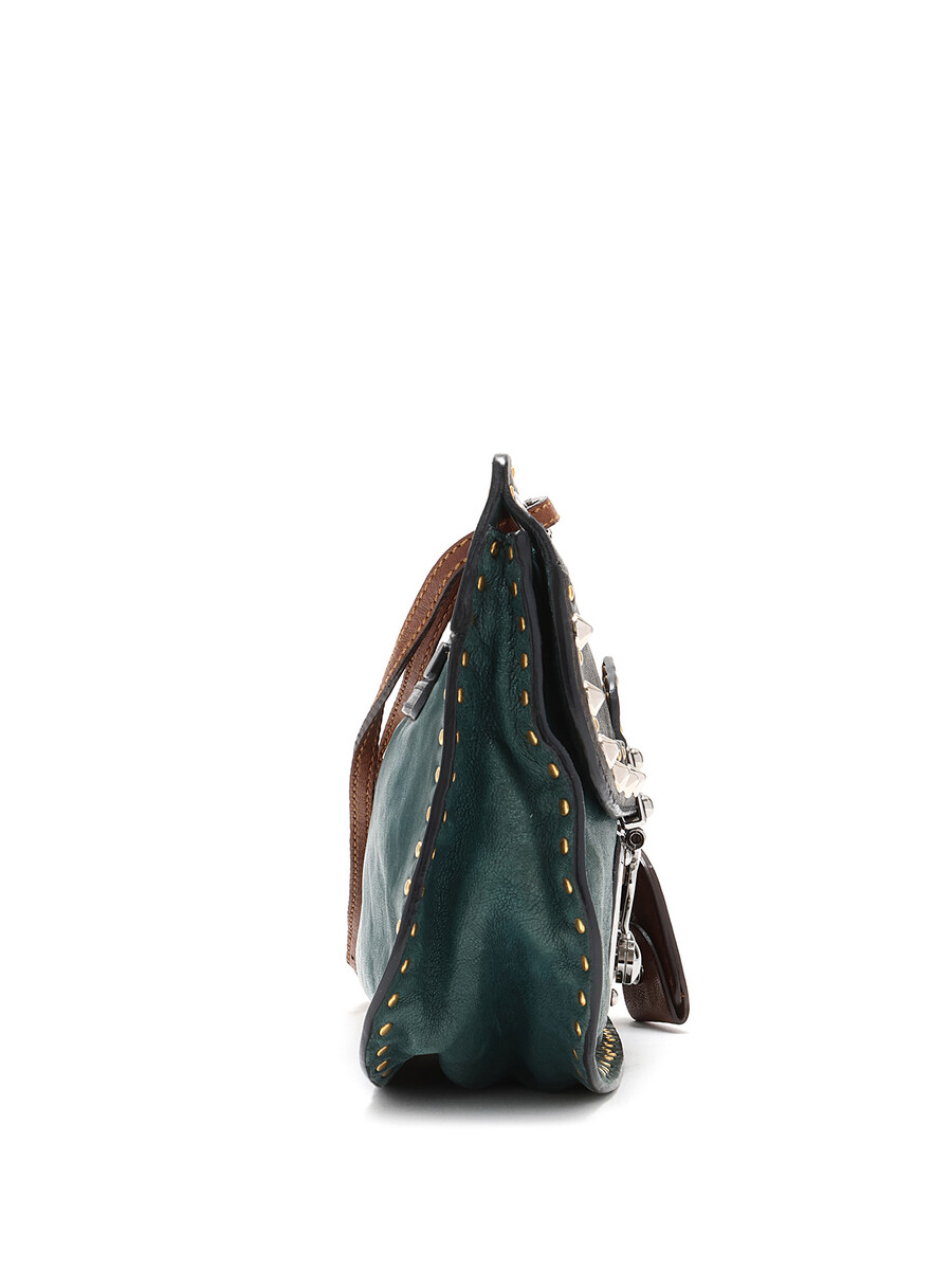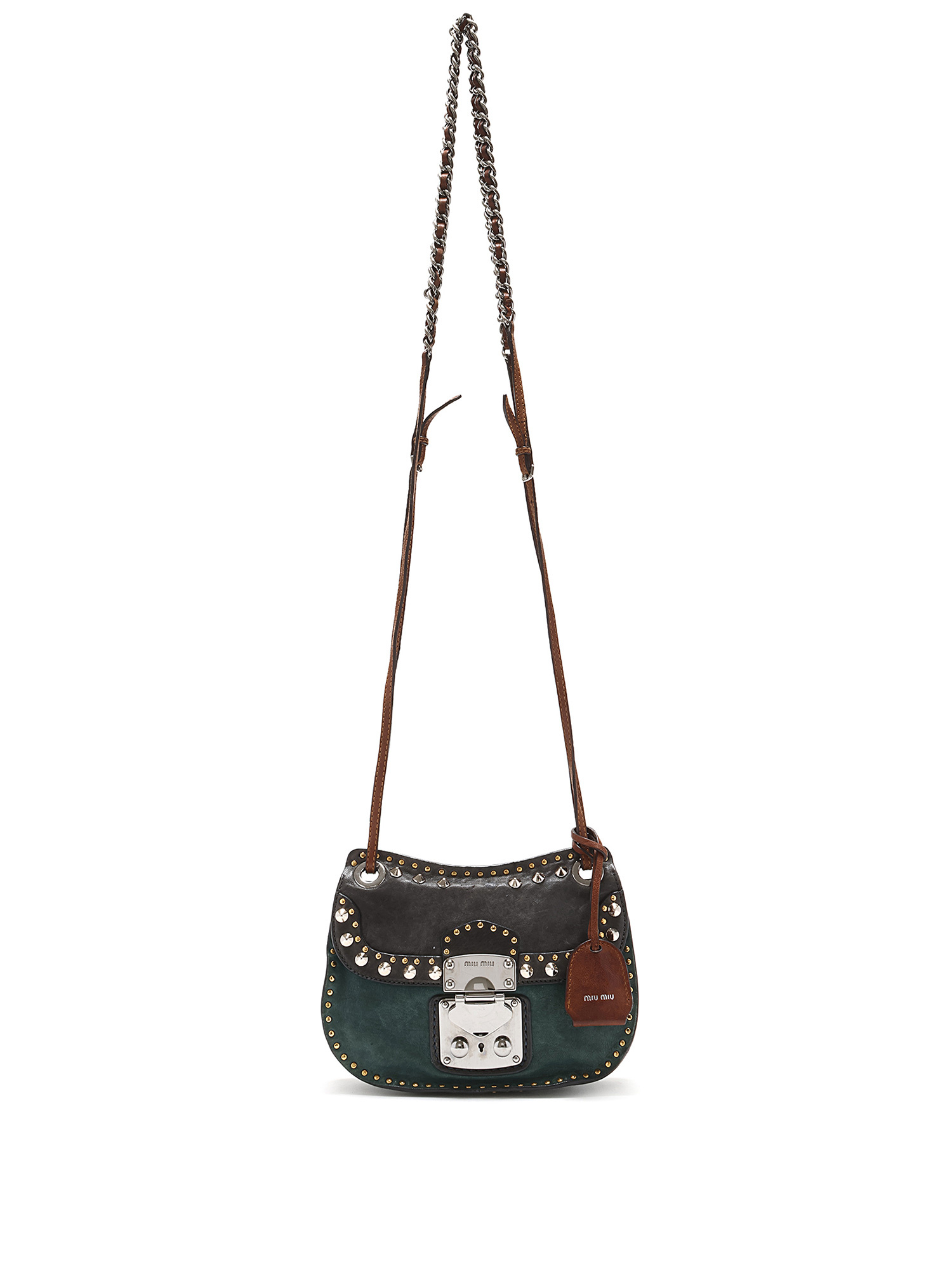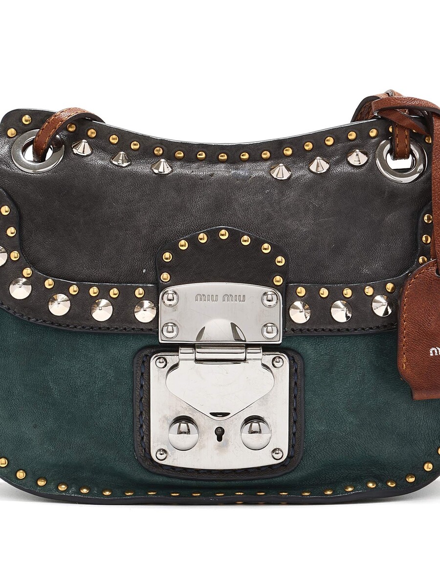 Sac à bandoulière clouté avec couture ton sur ton en vert et noir avec accents marron. Fermeture à tourniquet. Bandoulière en chaîne et cuir. Ferrures en métal argenté. Livré avec une clé.