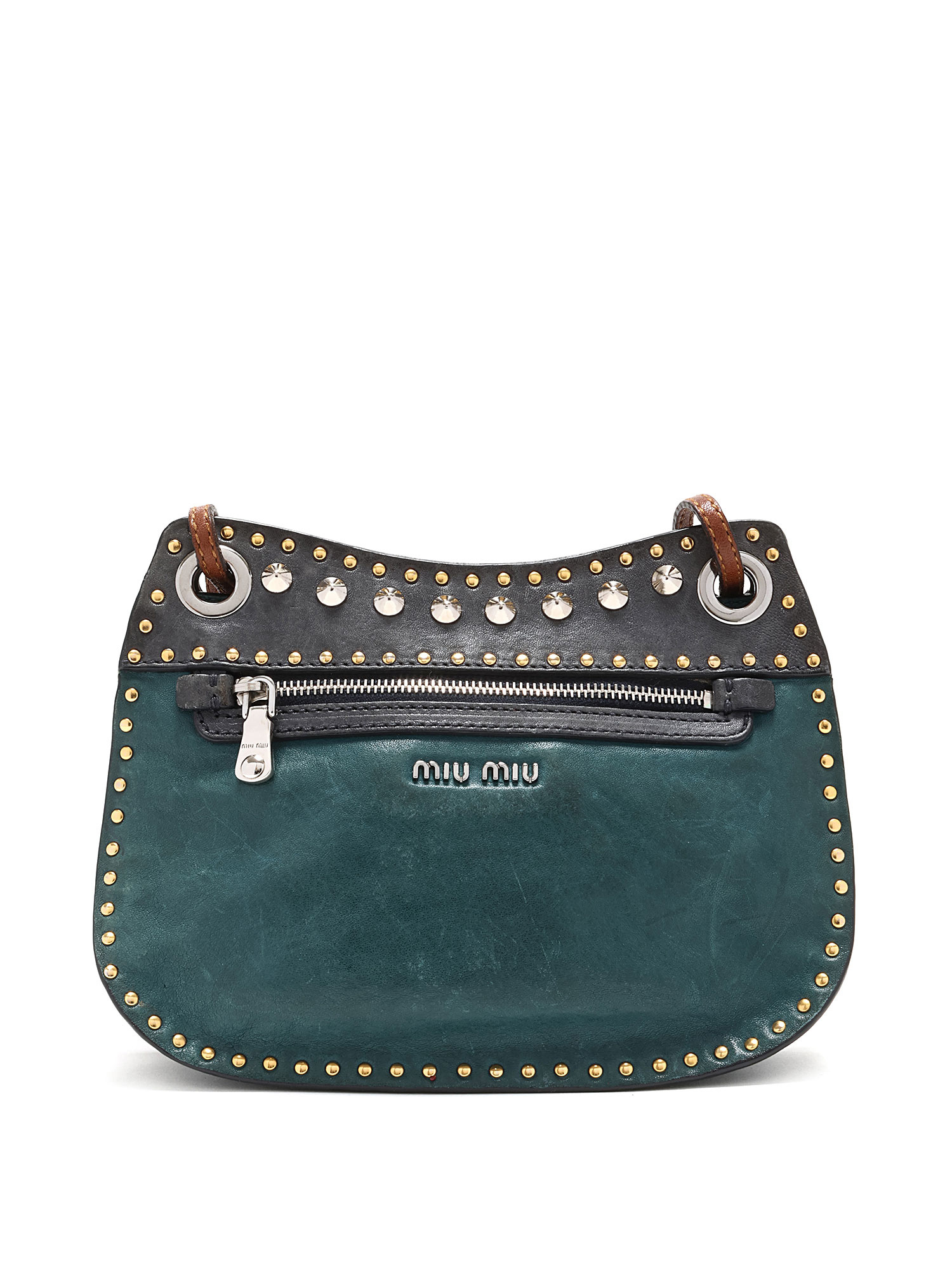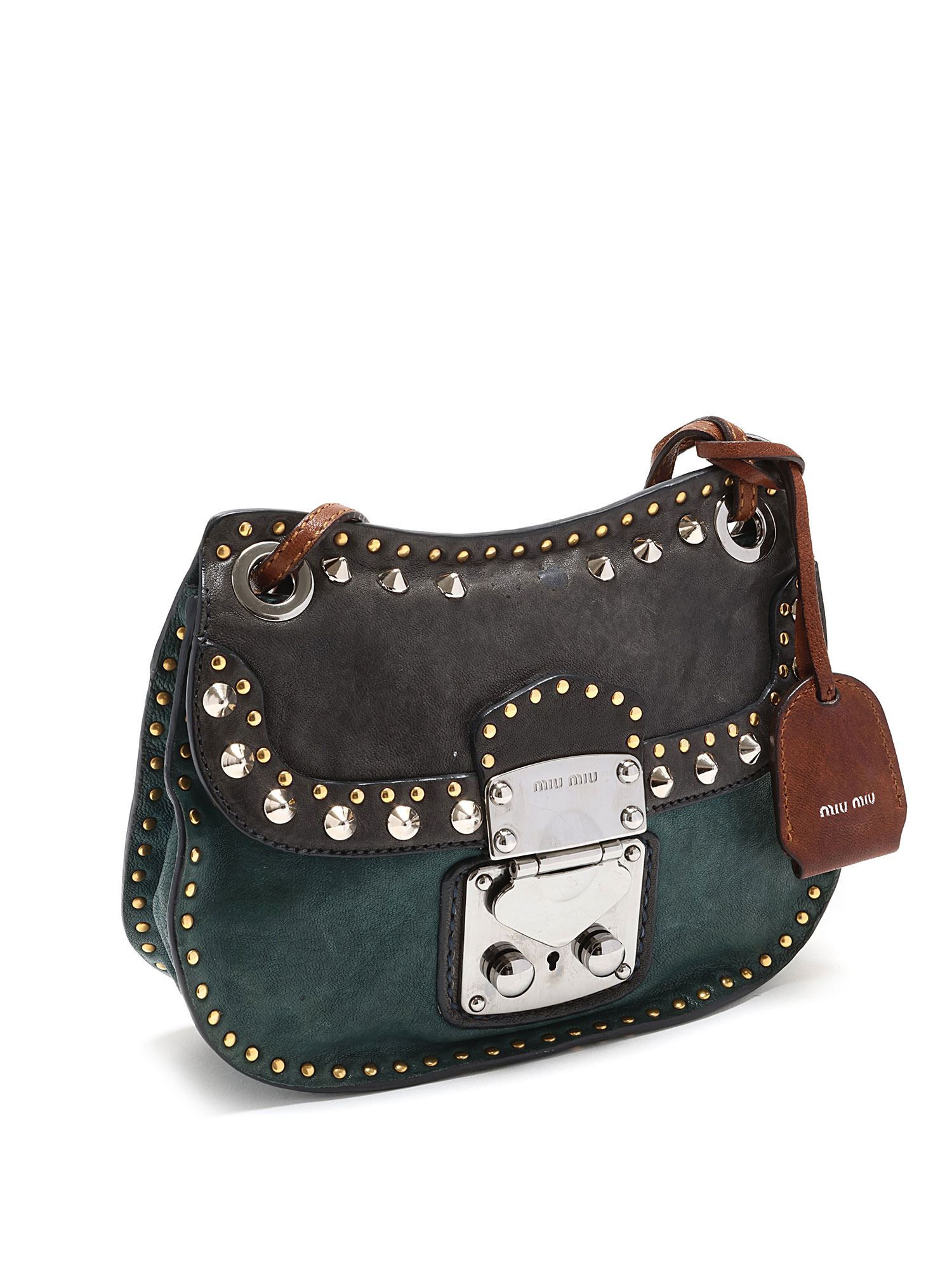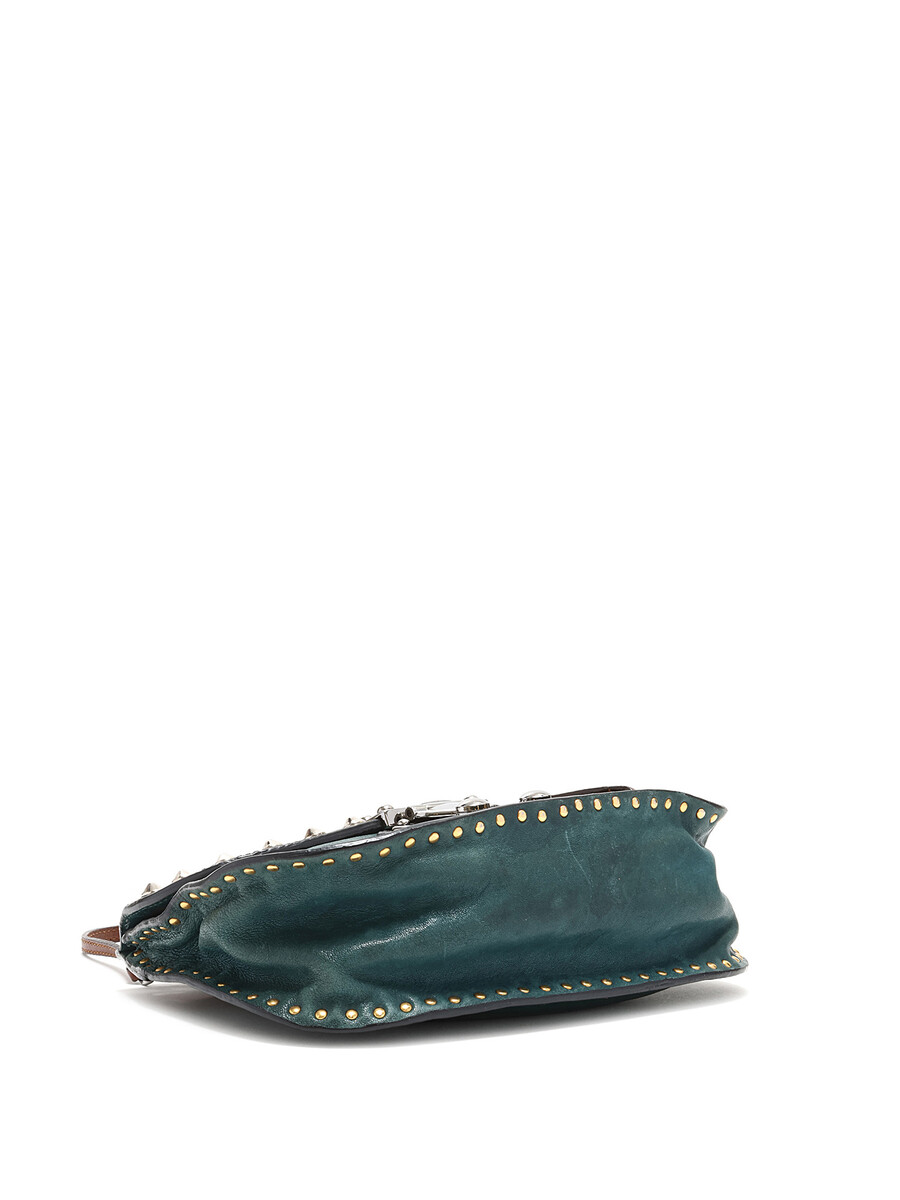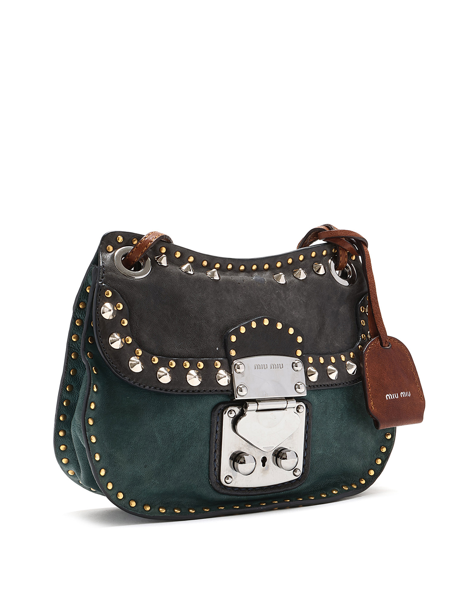 Sac à bandoulière clouté avec couture ton sur ton en vert et noir avec accents marron. Fermeture à tourniquet. Bandoulière en chaîne et cuir. Ferrures en métal argenté. Livré avec une clé.