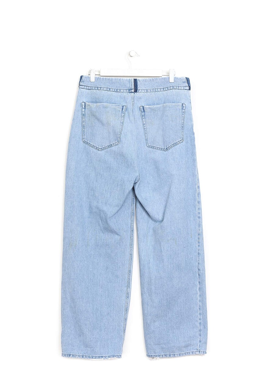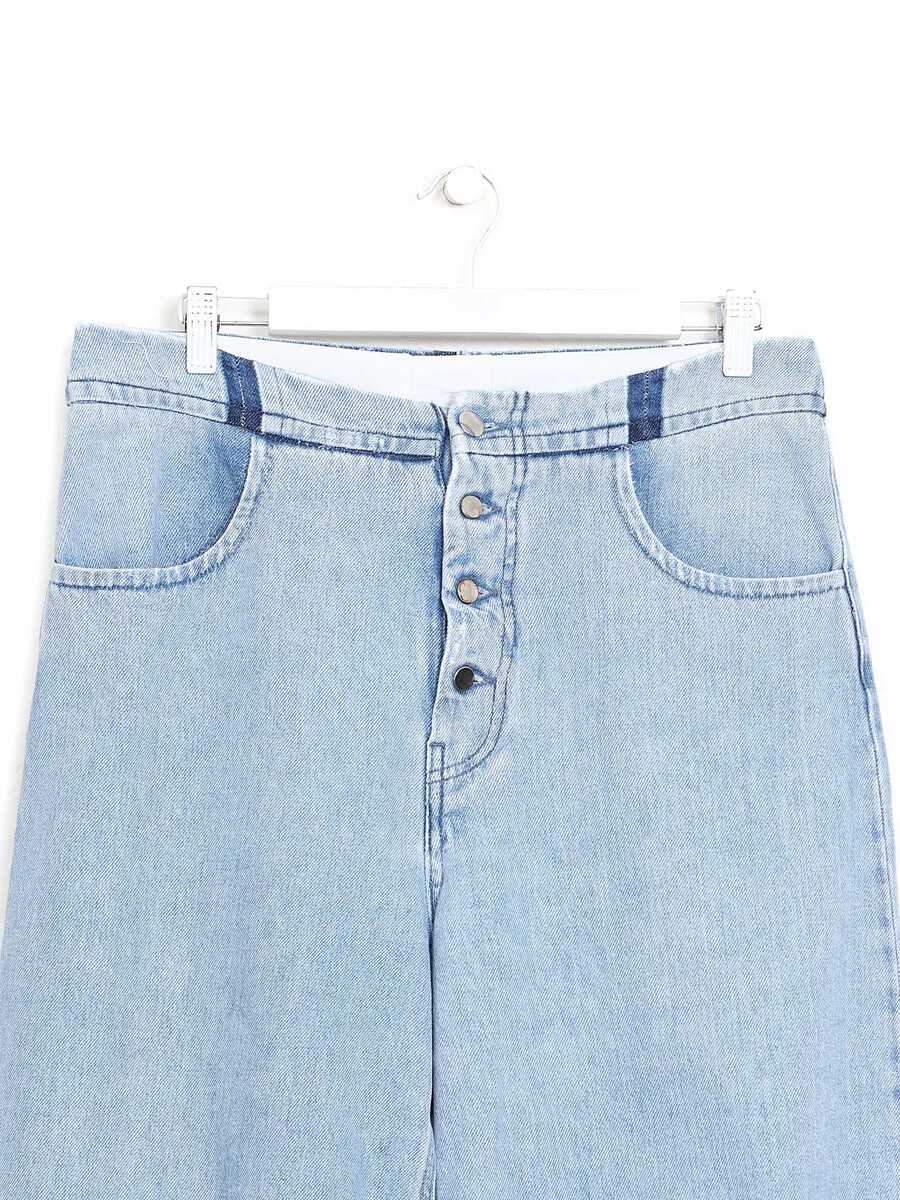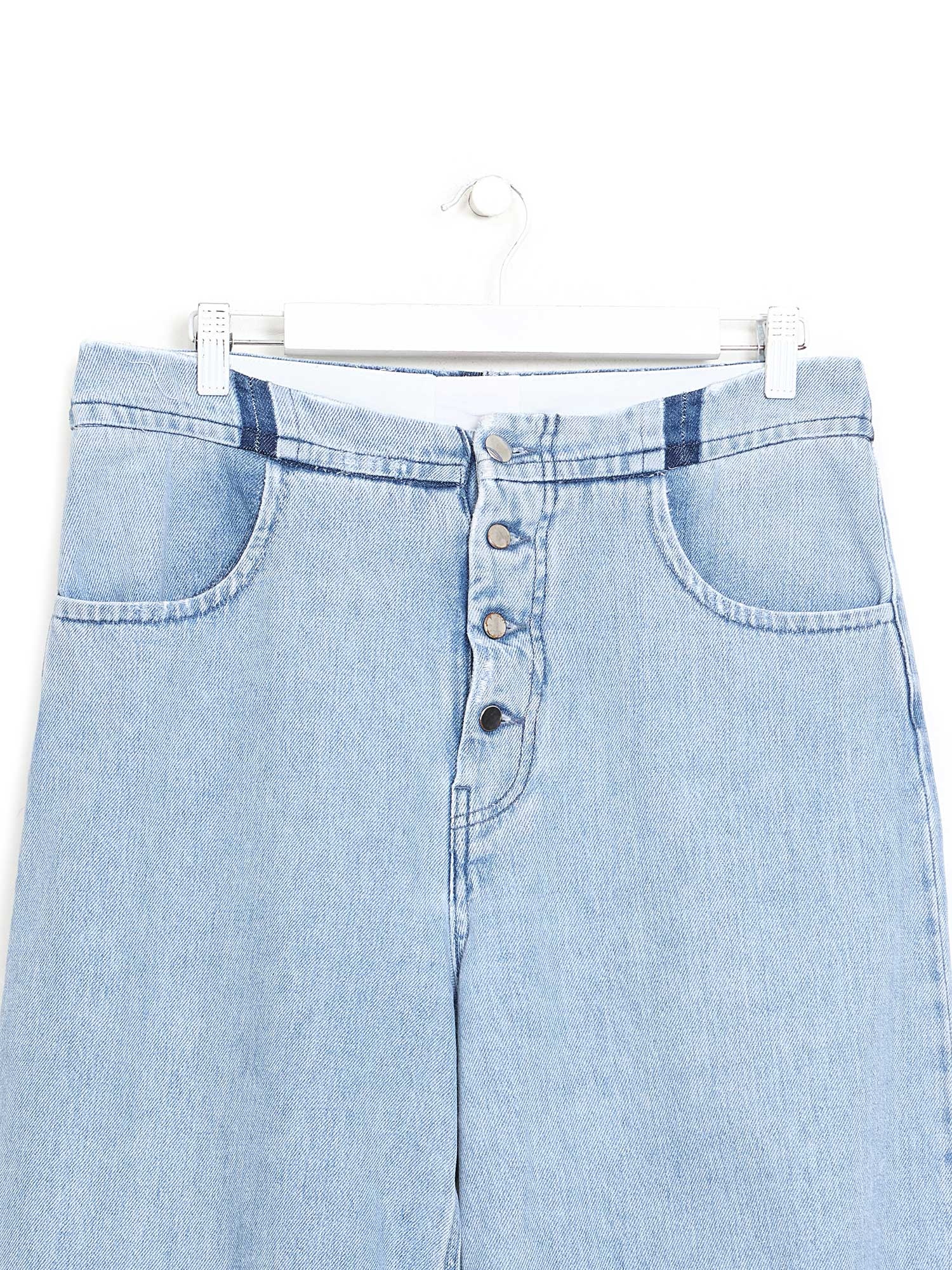 Jean écourté en denim bleu pâle avec boutonnière. Poches plaquées à l’arrière et poches latérales à l’avant.