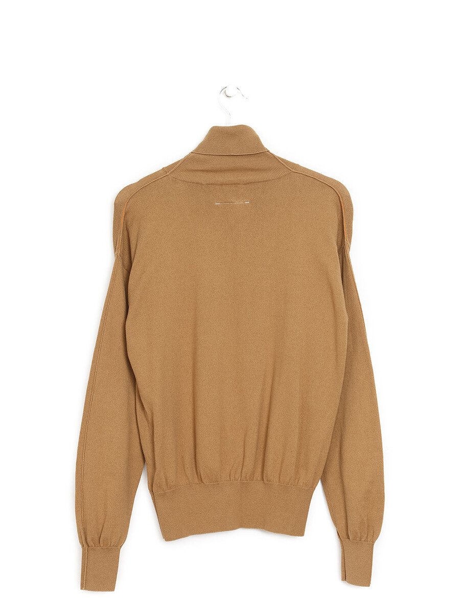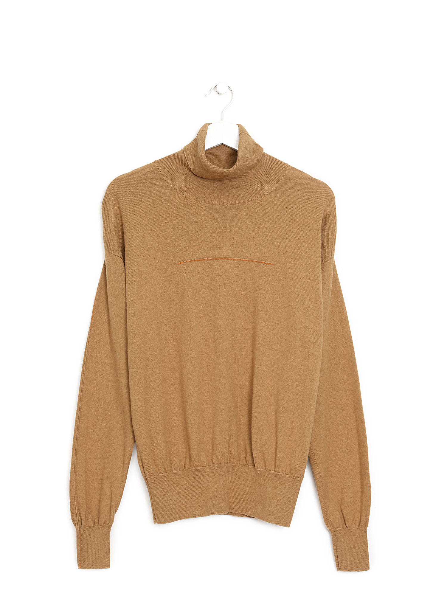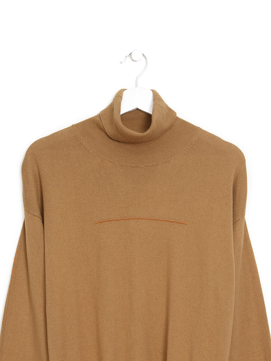 Chandail à col roulé beige. Coutures ton sur ton au buste. Mélange doux de coton et cachemire pour une sensation luxueuse.