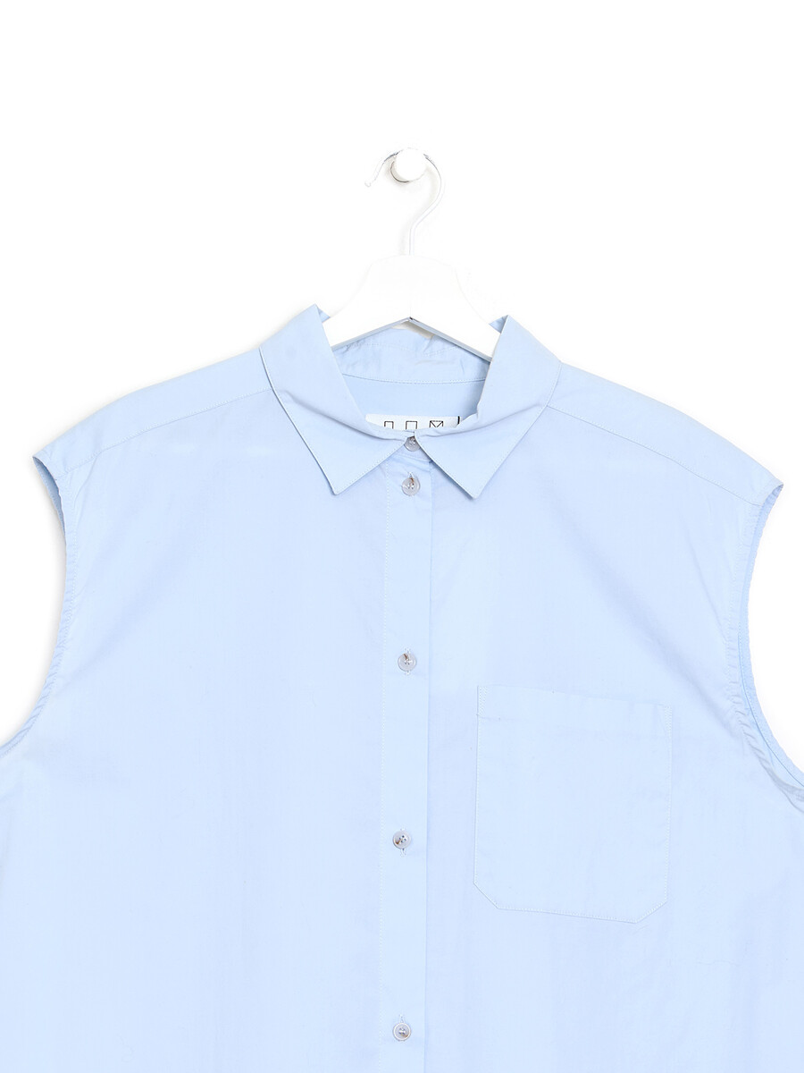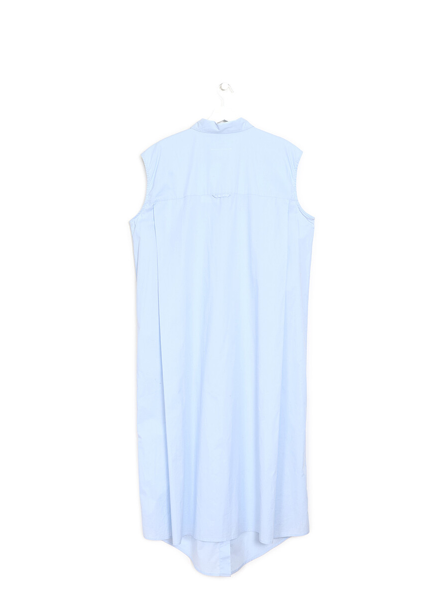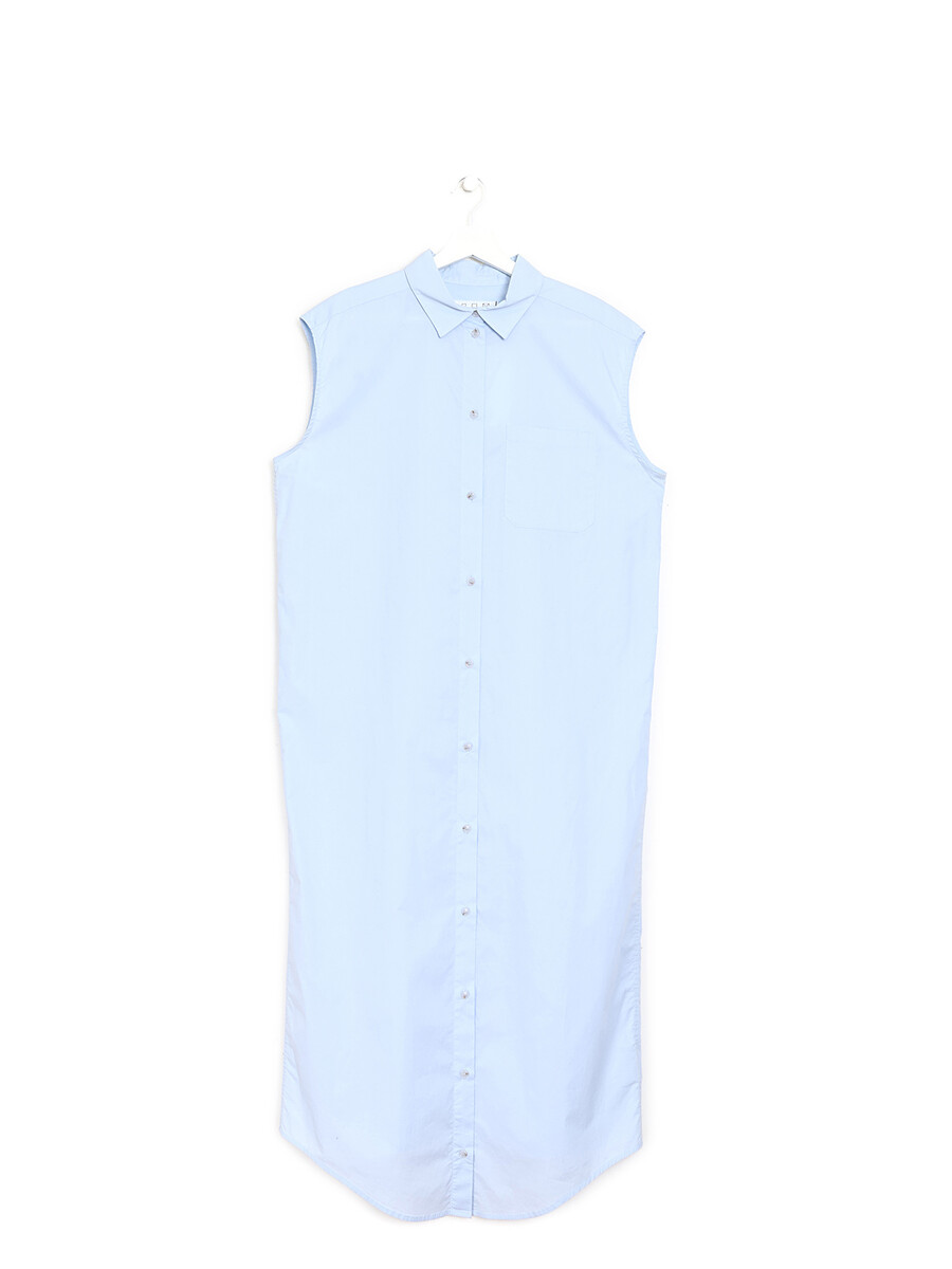 Robe-chemise sans manches bleu pâle avec col chemisier classique. Confectionnée dans un mélange de coton extensible pour un ajustement confortable.