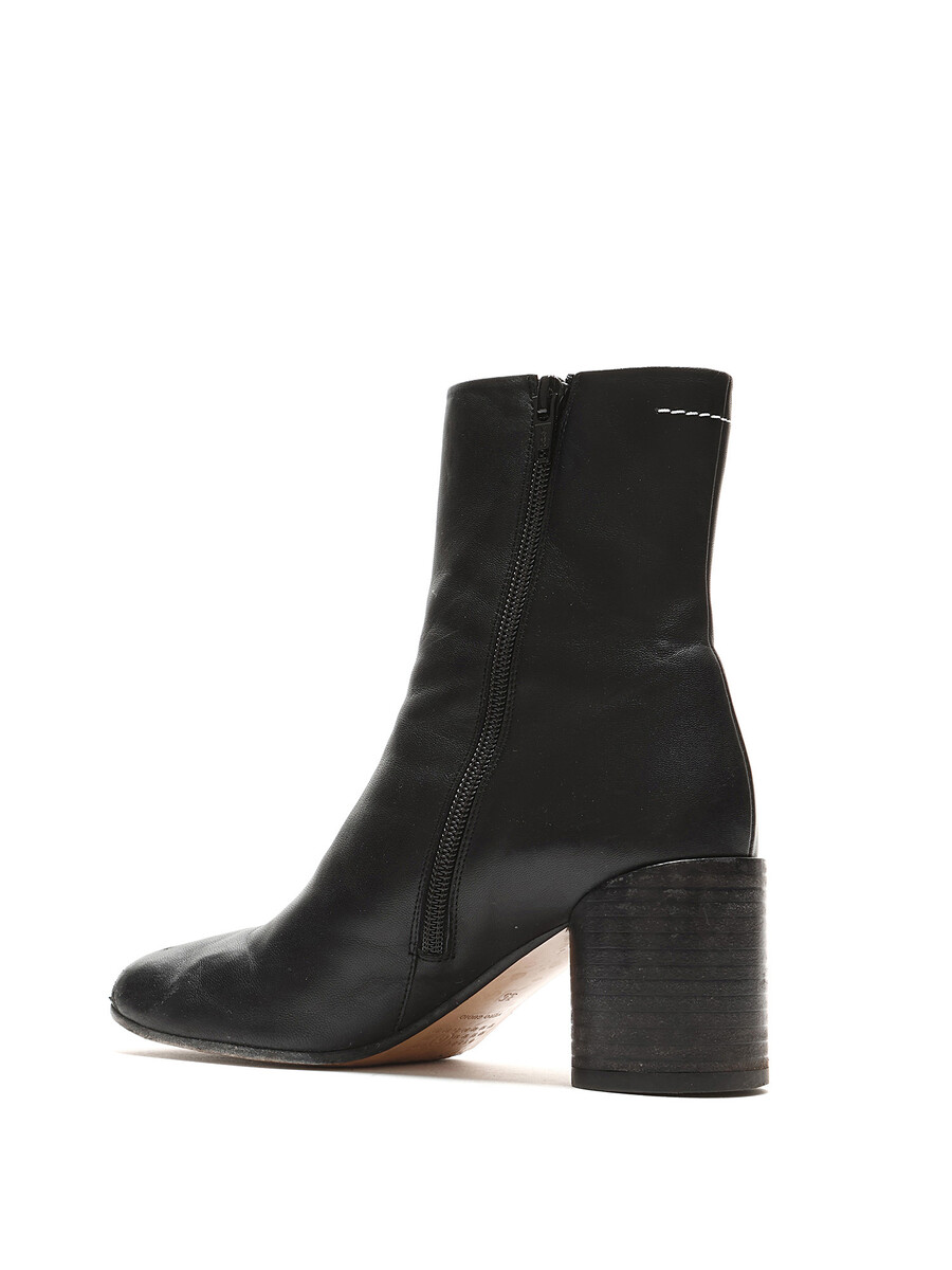 Bottes à cheville en cuir grainé noir avec un design à bout carré. Fermeture à glissière latérale. Semelle en cuir robuste.