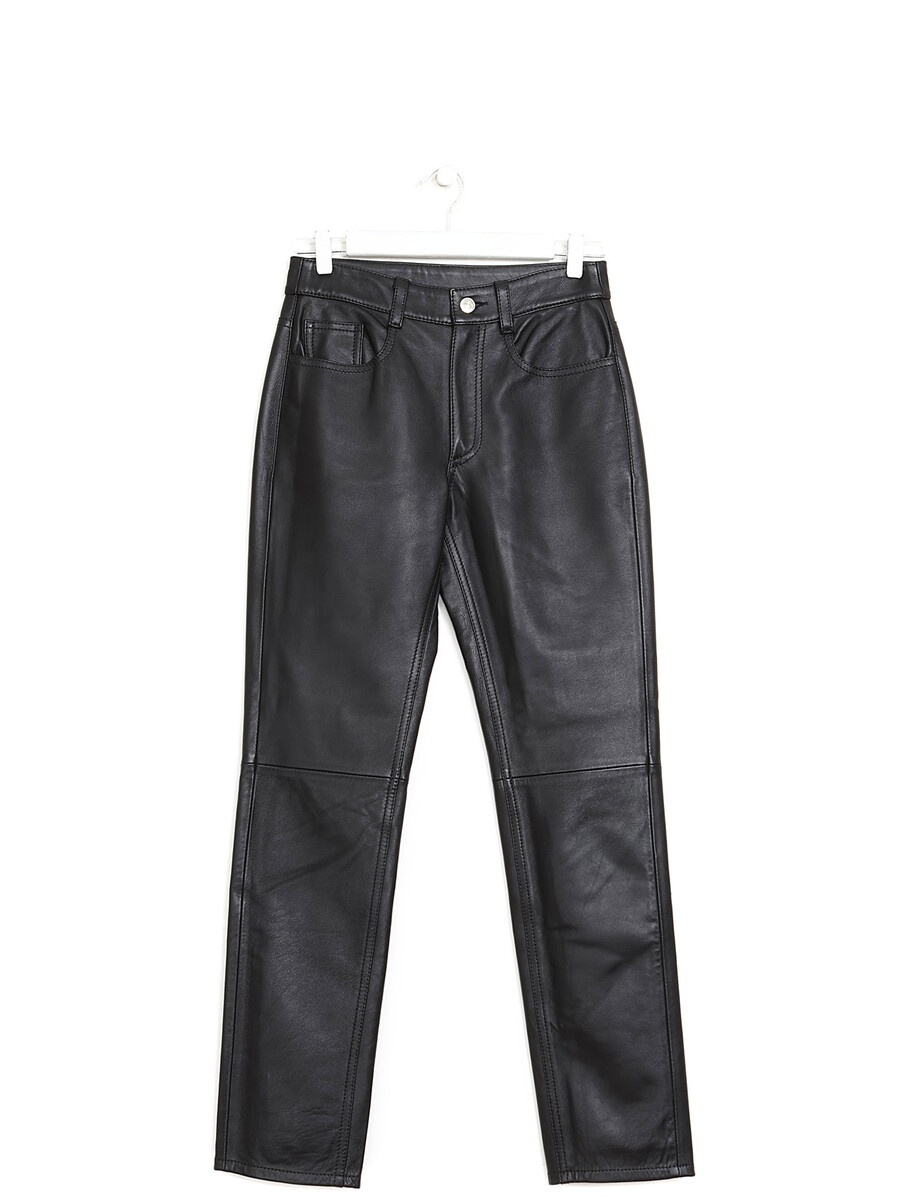 Pantalon en cuir noir avec un design classique à cinq poches.
