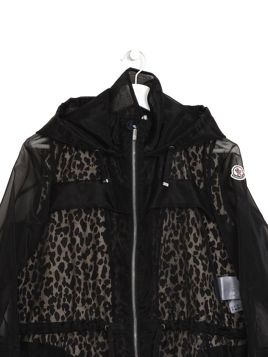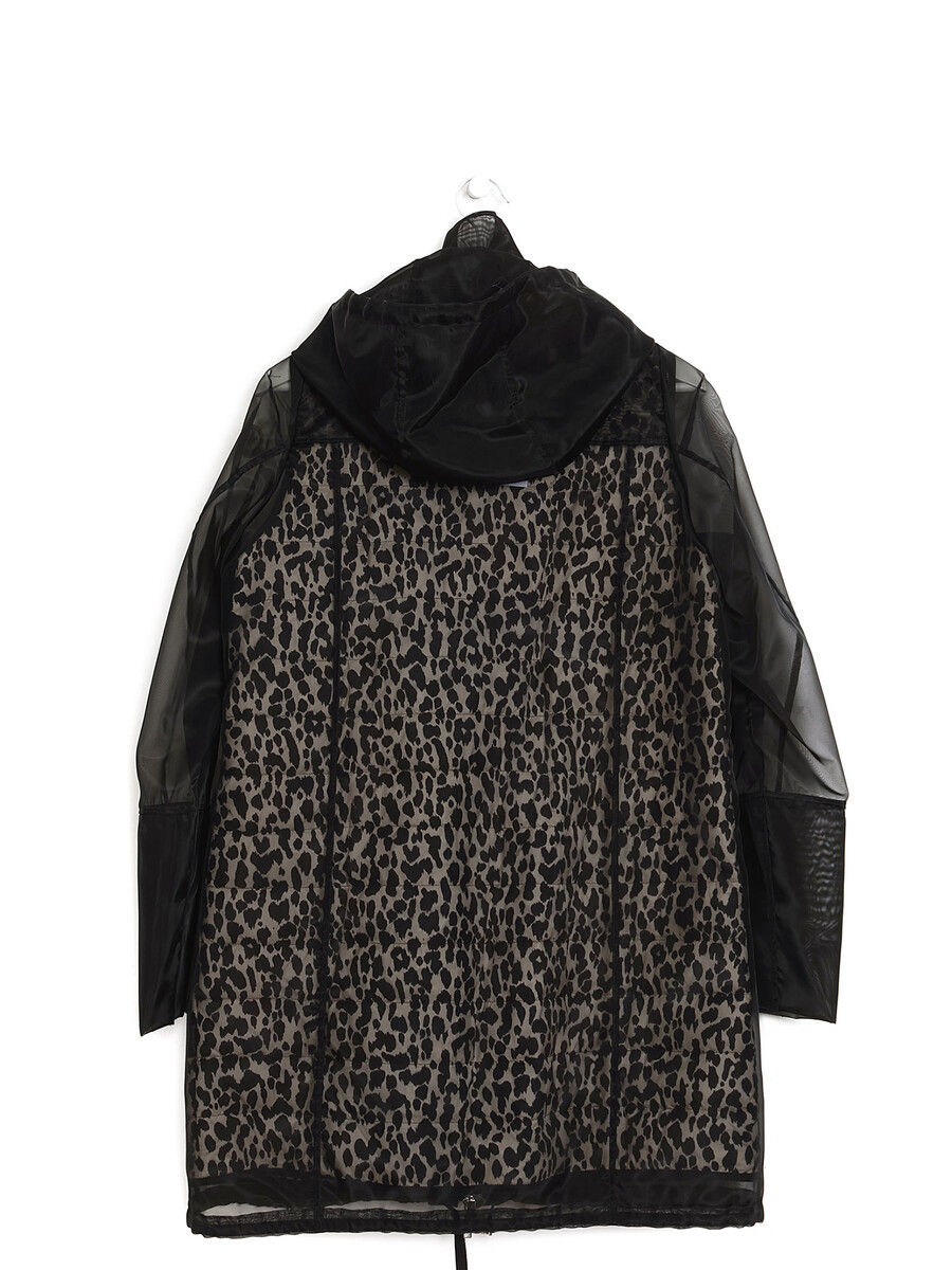 Manteau semi-transparent à doublure motif animalier dans les tons de noir et beige. Col montant. Fermeture à glissière.