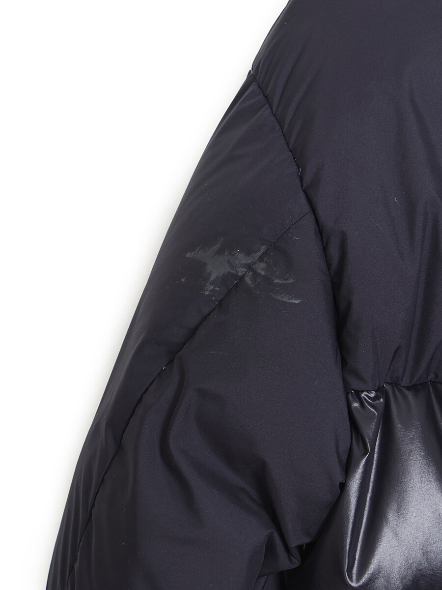 Manteau matelassé noir avec fermeture à glissière avant et tirette noire. Capuchon intégré avec doublure en molleton. Deux poches à rabat sur le devant.
