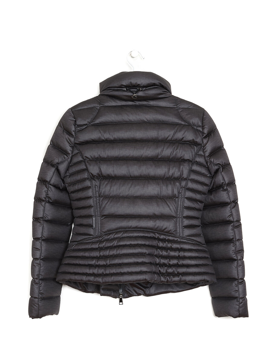 Manteau matelassé à manches longues en gris. Fermeture éclair au devant. Deux poches à rabat devant.