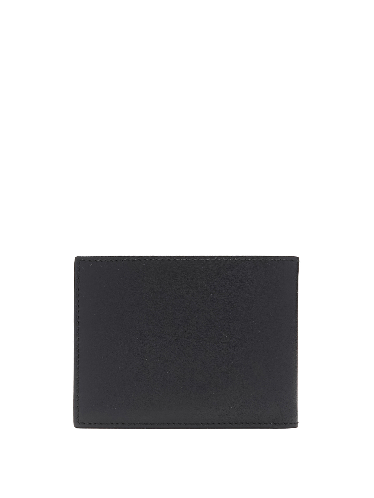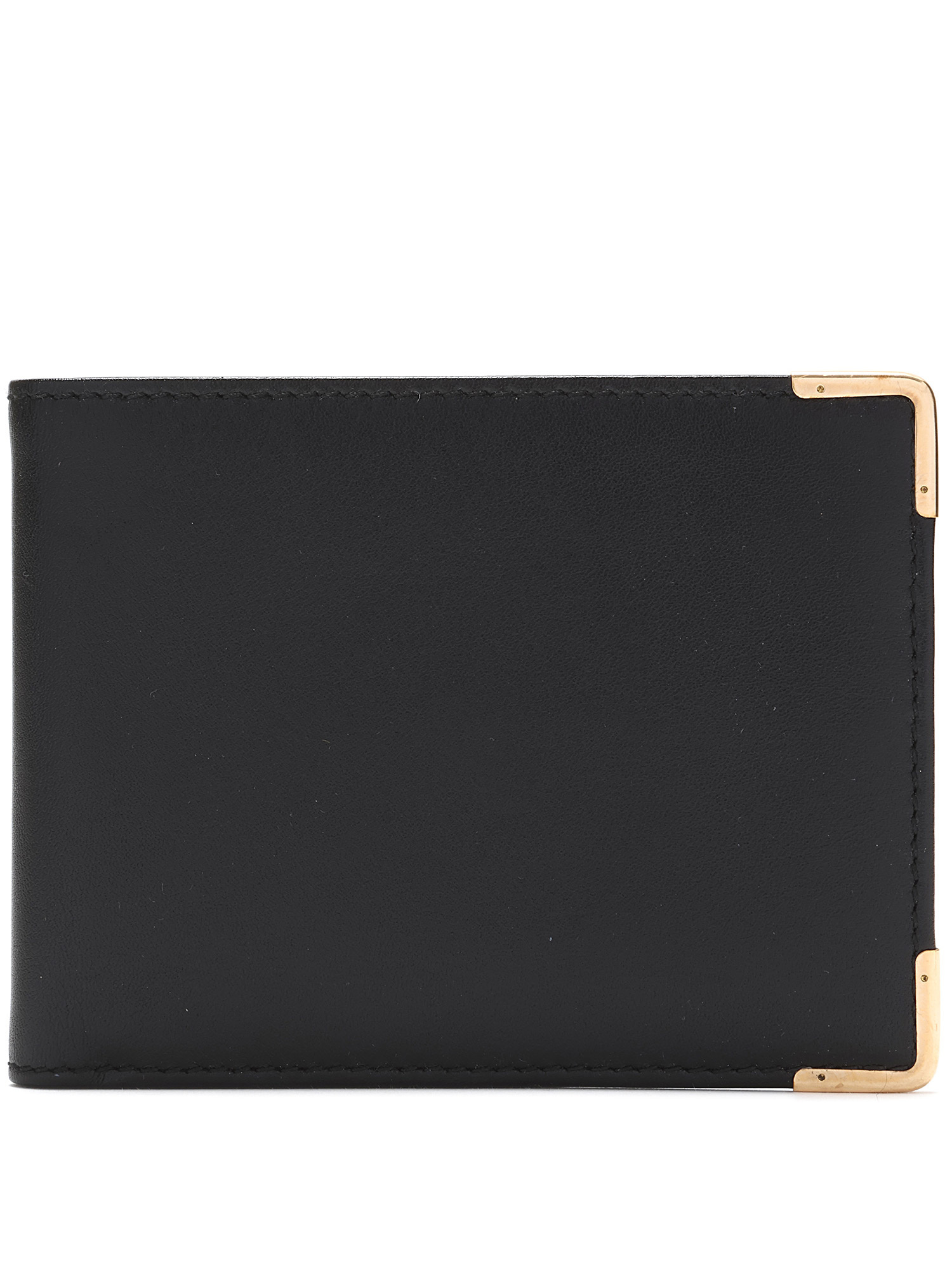 Portefeuille compact en cuir noir avec protecteurs d'angles dorés. Coutures ton sur ton.