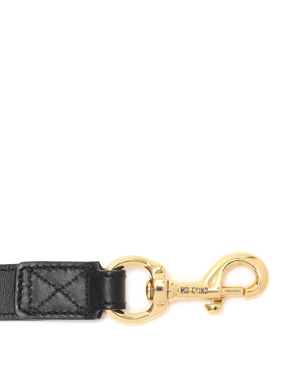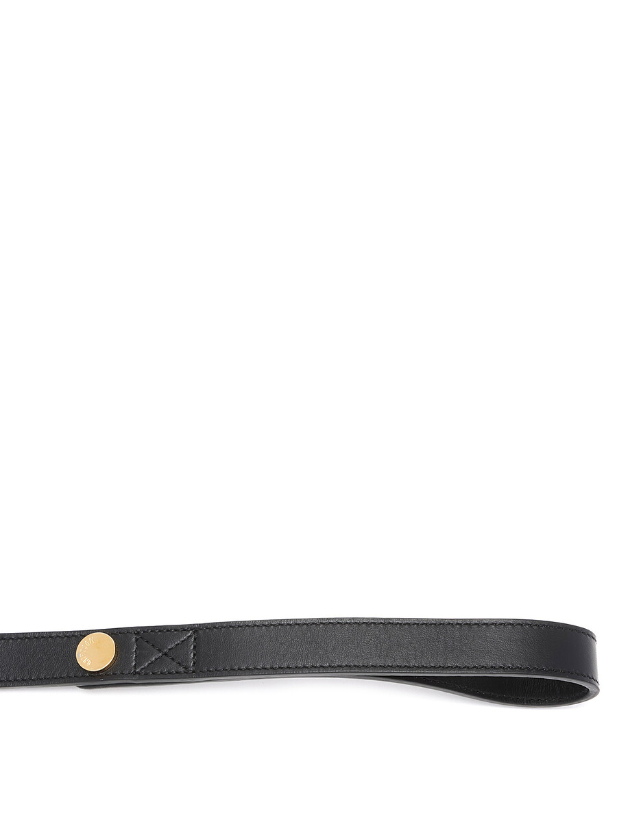 Laisse de luxe en cuir noir avec le logo Moschino en lettres dorées. Accents en ferrures dorées, y compris un fermoir et une extrémité de laisse. Livré avec un dust bag.