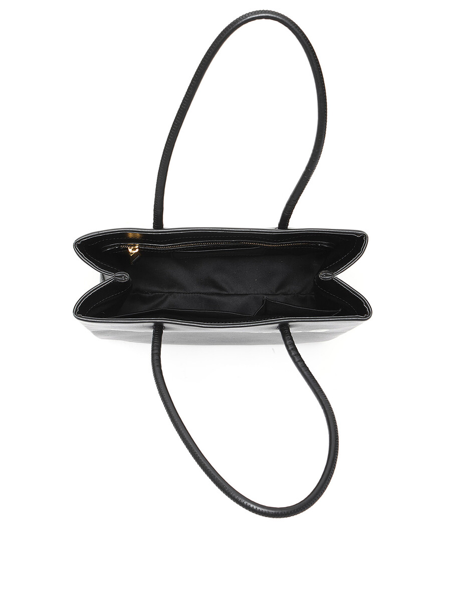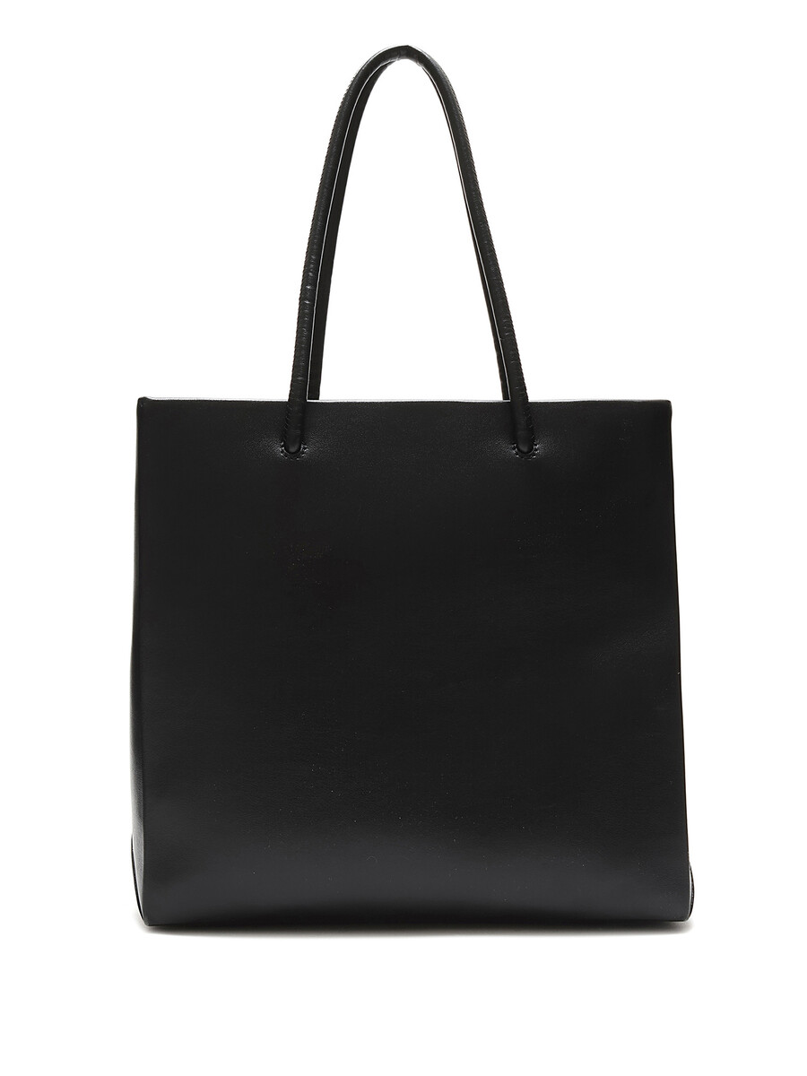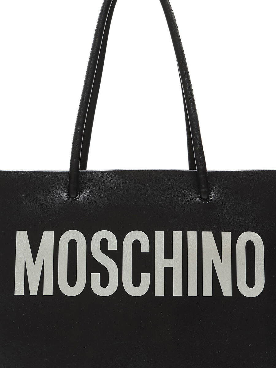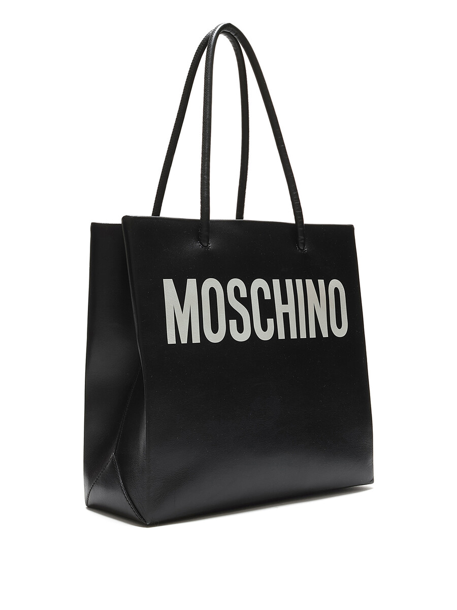 Cabas en cuir noir avec lettrage blanc signature MOSCHINO. Design ouvert avec poignées fixes en cuir. Couture ton sur ton. Livré avec dustbag.