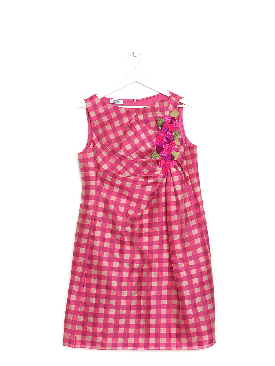 Robe sans manches à carreaux roses avec appliqué floral. Fermeture à glissière au dos.