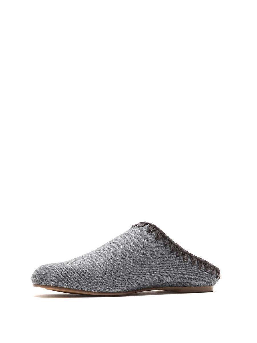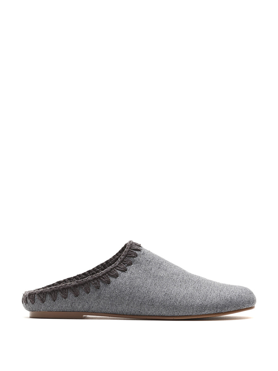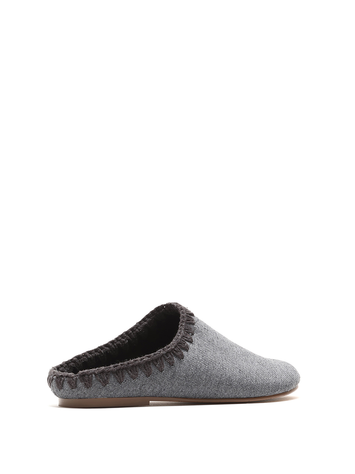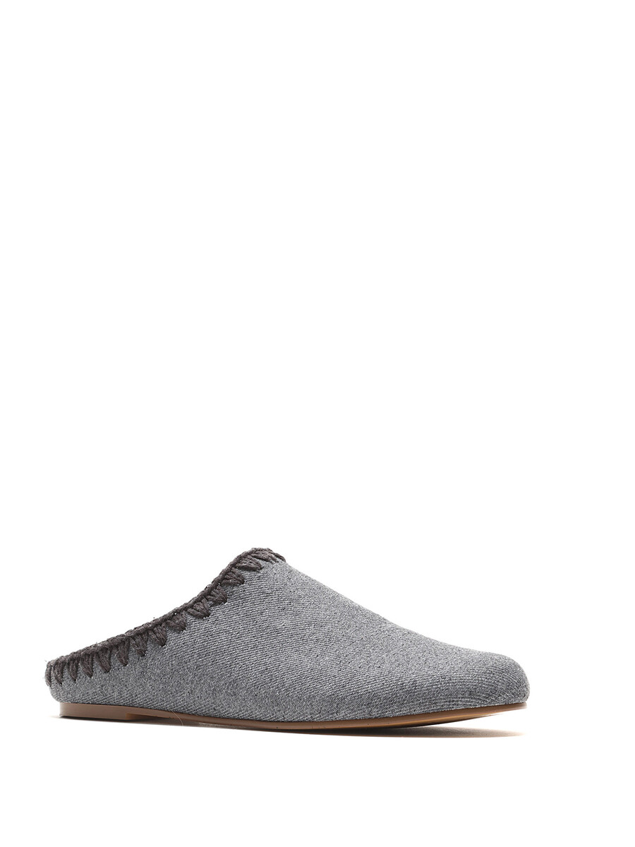 Mules en feutre gris à enfiler avec bout rond fermé et semelle en cuir.