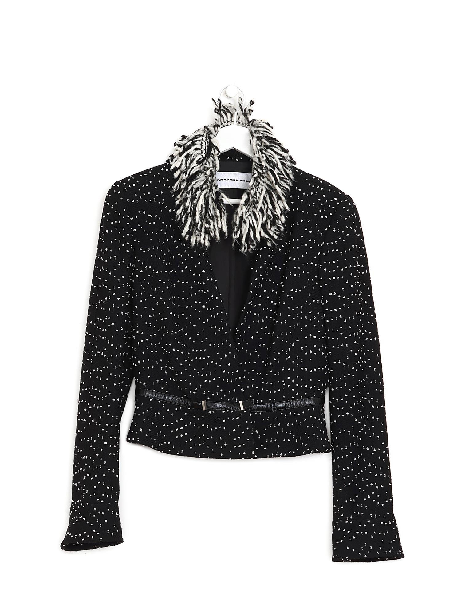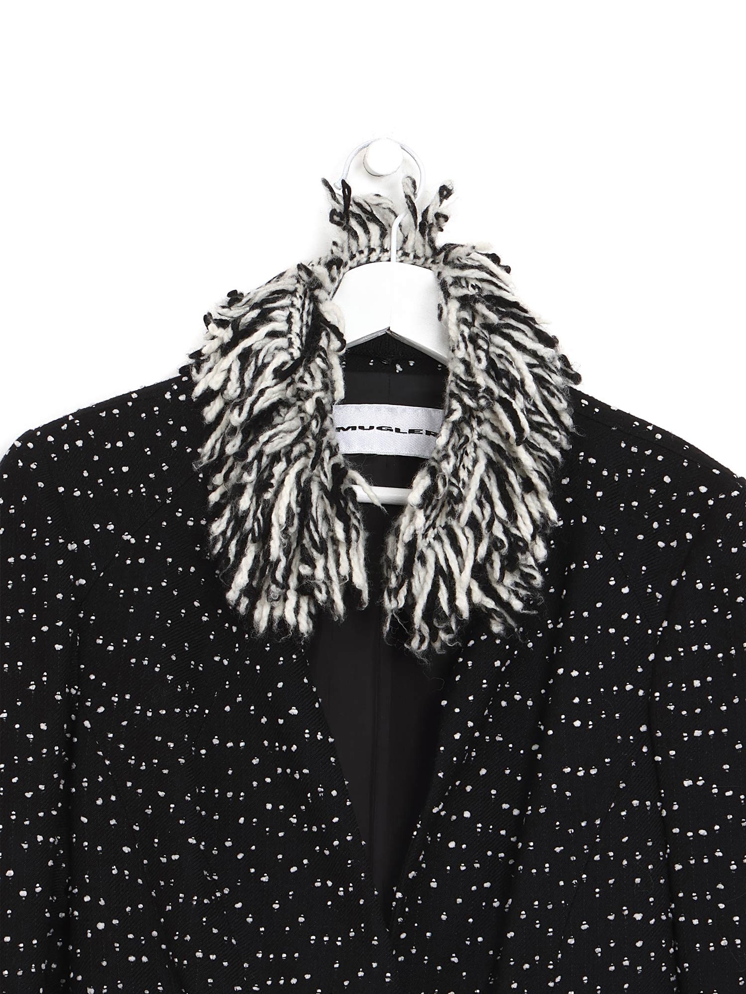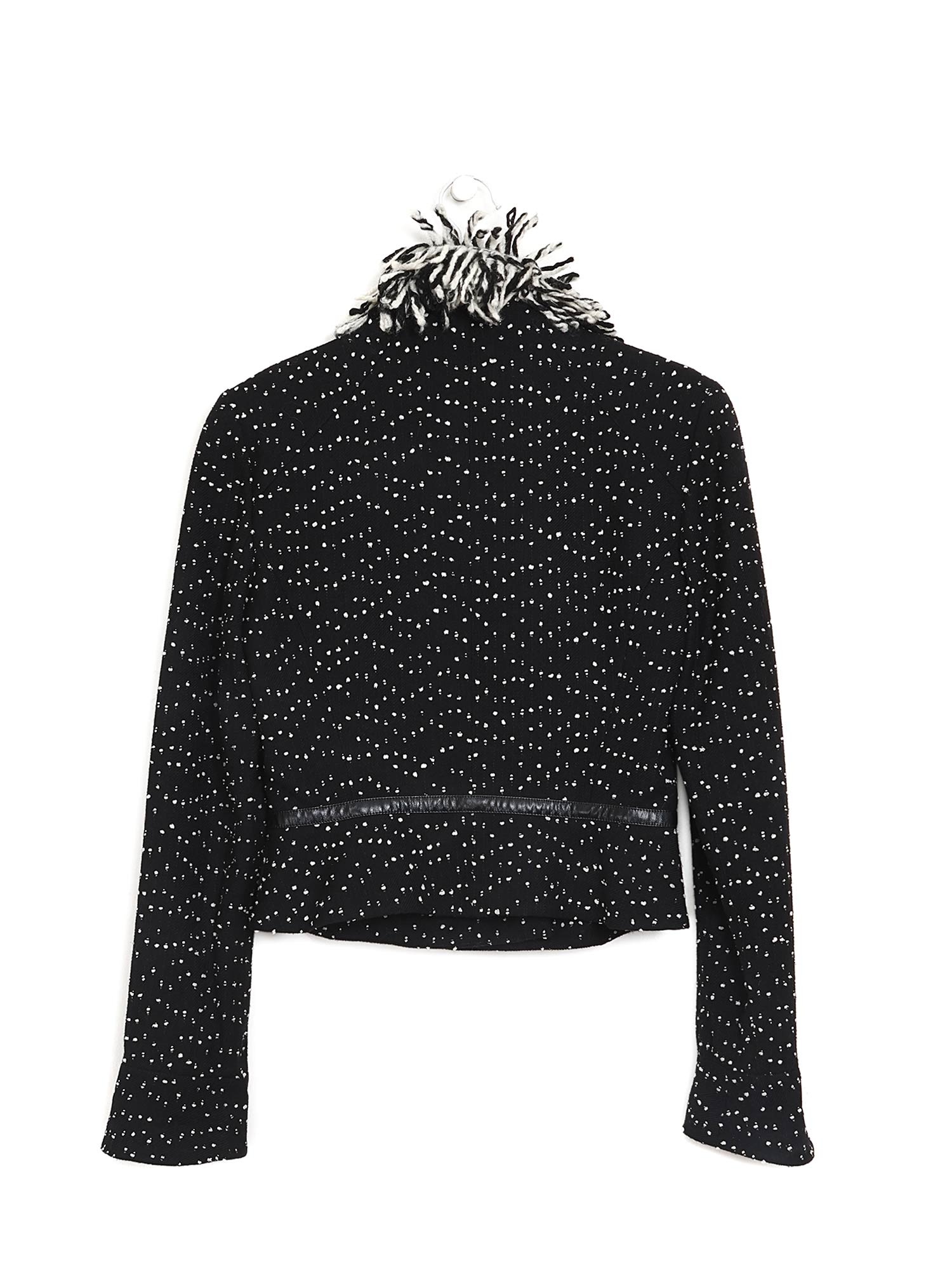 Blazer noir à motif à pois blancs. Col en fausse fourrure. Fermeture boutonnée. Construction à panneaux et épaules rembourrées.