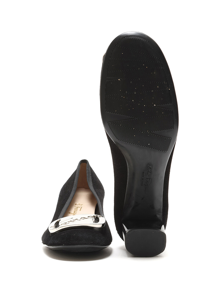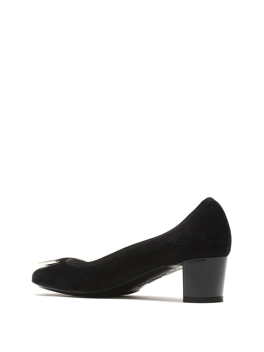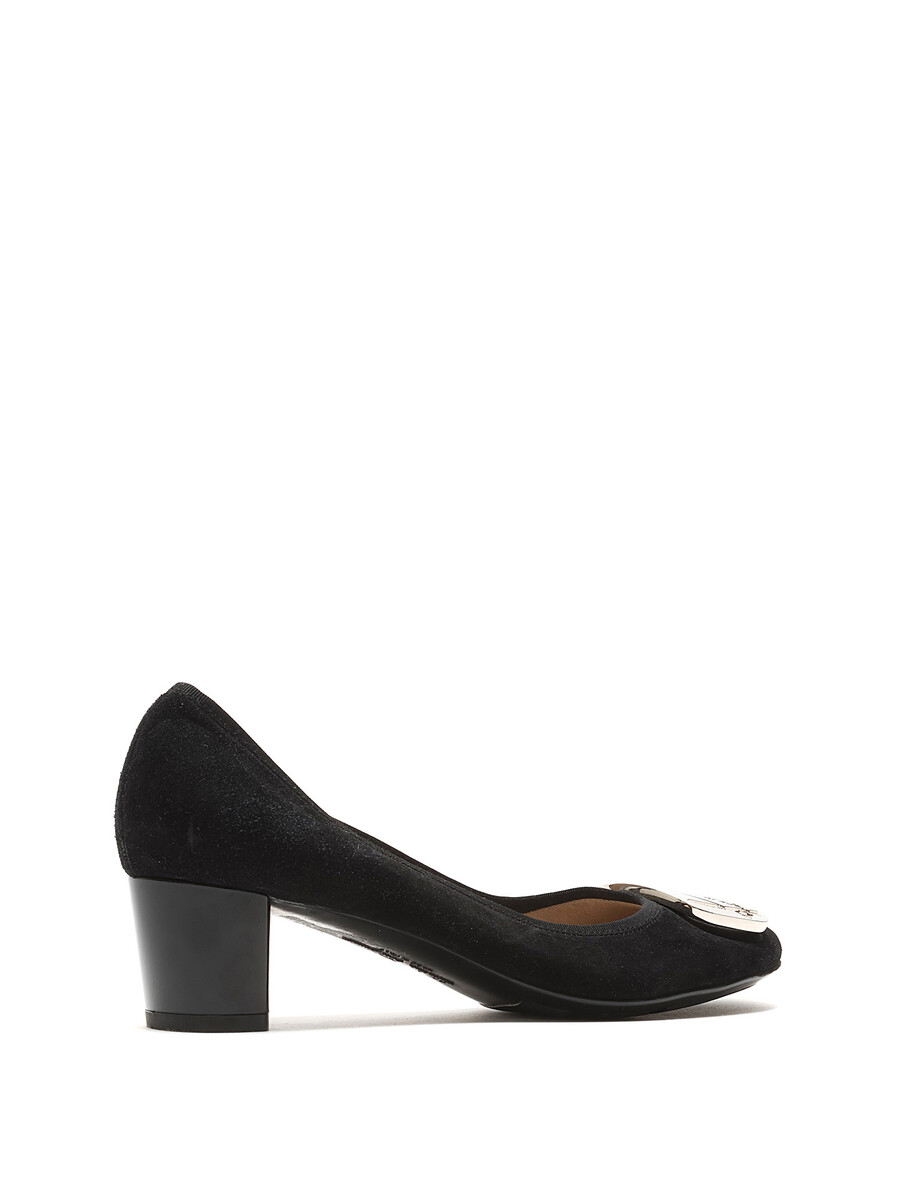 Ballerines en daim noir avec boucle métallique argentée. Fermeture à enfiler. Bout rond. Semelle en caoutchouc. Coutures ton sur ton. Livrées avec dustbag.