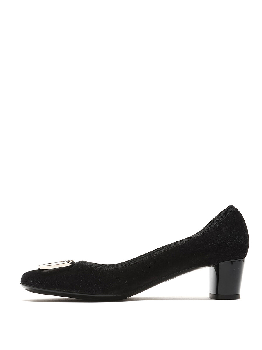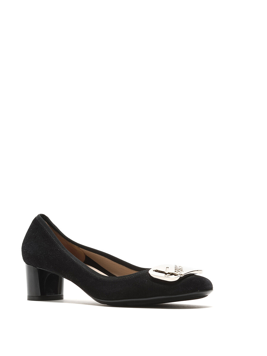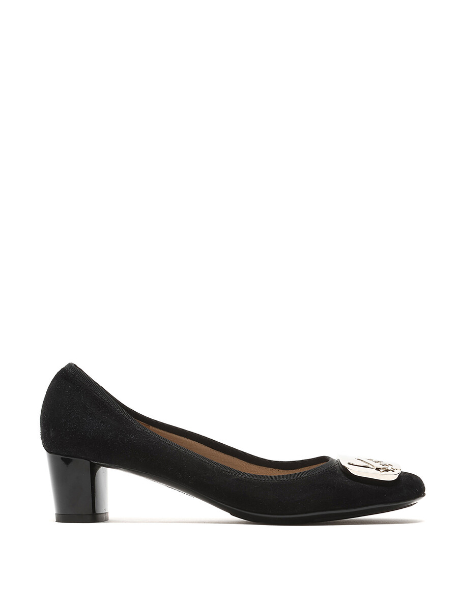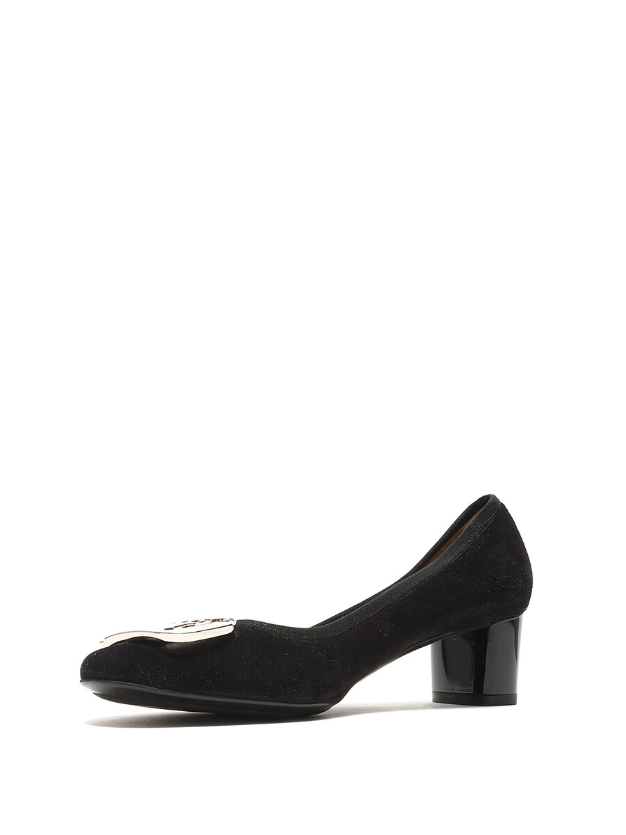 Ballerines en daim noir avec boucle métallique argentée. Fermeture à enfiler. Bout rond. Semelle en caoutchouc. Coutures ton sur ton. Livrées avec dustbag.