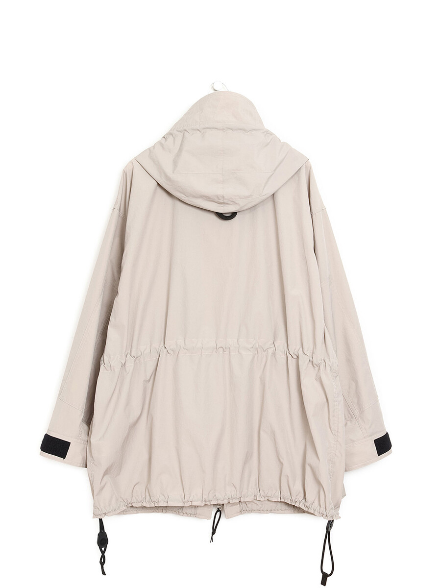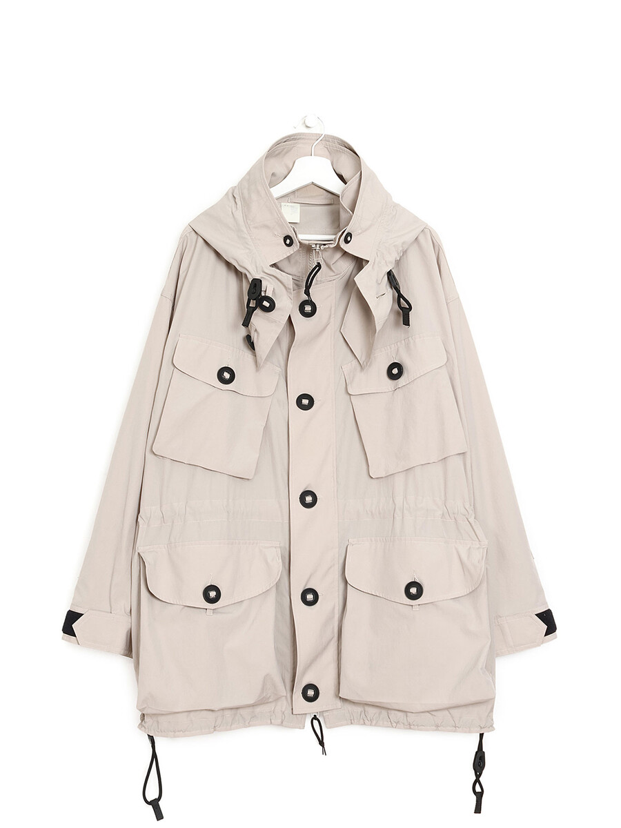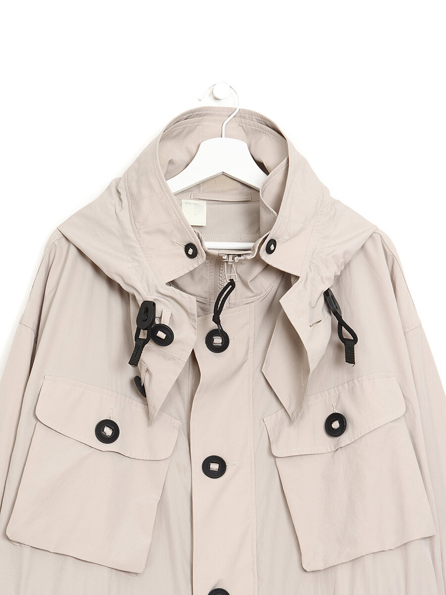 Manteau à manches longues en beige avec col montant et boutons noirs. Fermeture boutonnée sur le devant avec fermeture éclair supplémentaire. Poches à rabat avec boutons sur le devant.