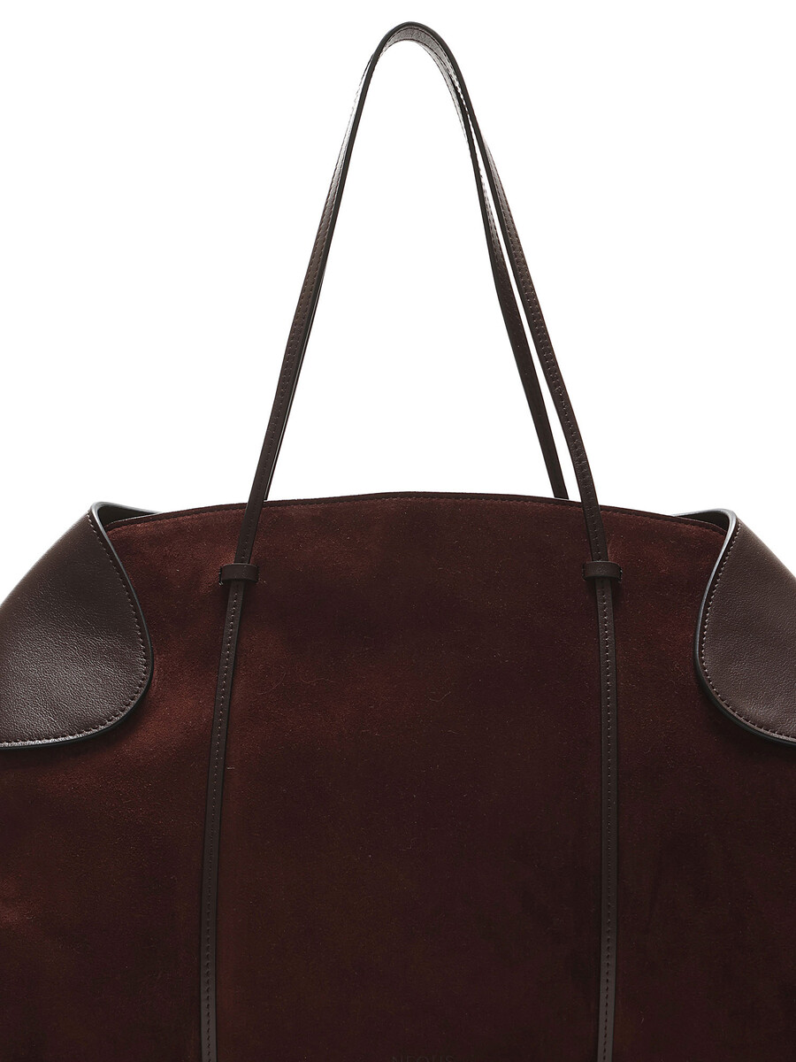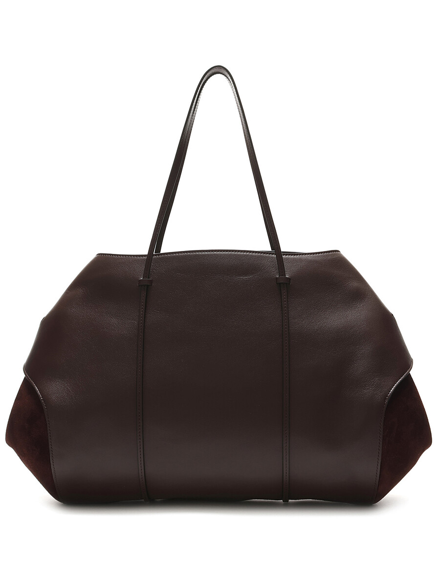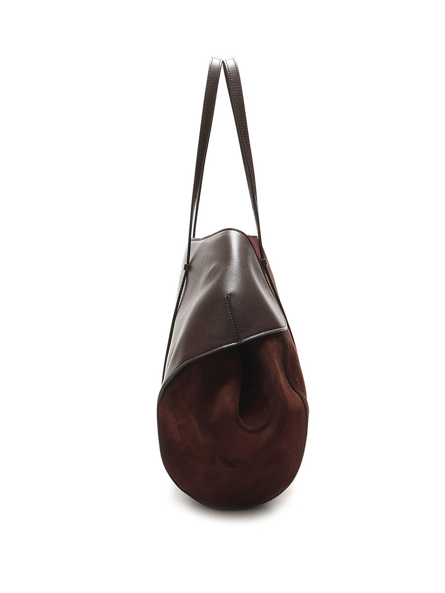 Cabas en cuir et suède à panneaux en brun. Anses et garnitures en cuir. Intérieur spacieux.