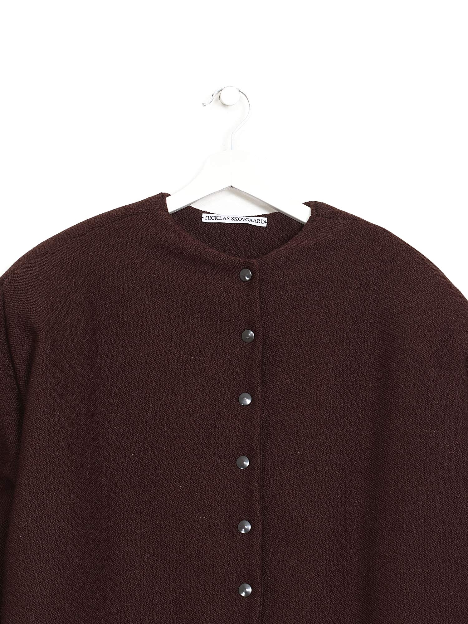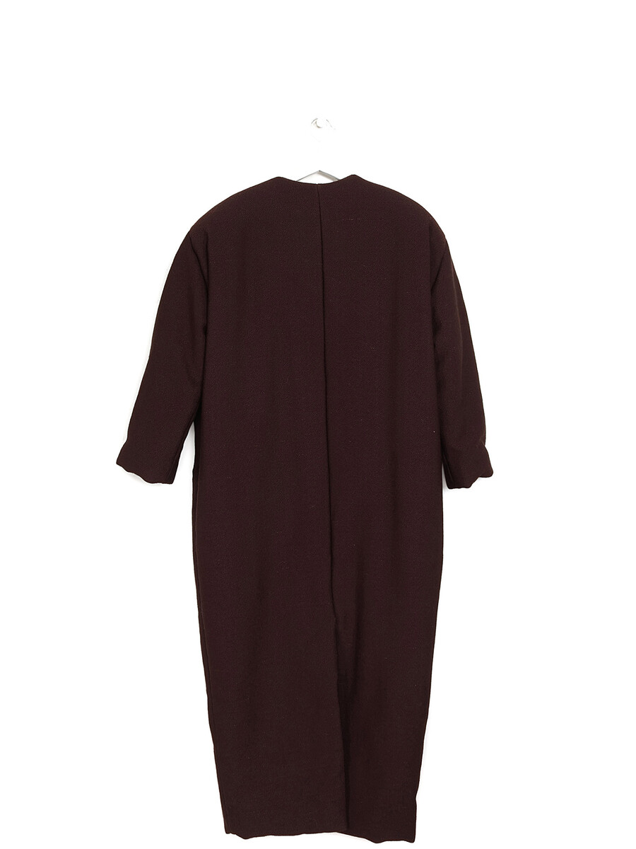 Manteau matelassé à manches longues en brun. Fermeture à boutons pression sur le devant. Poches latérales.