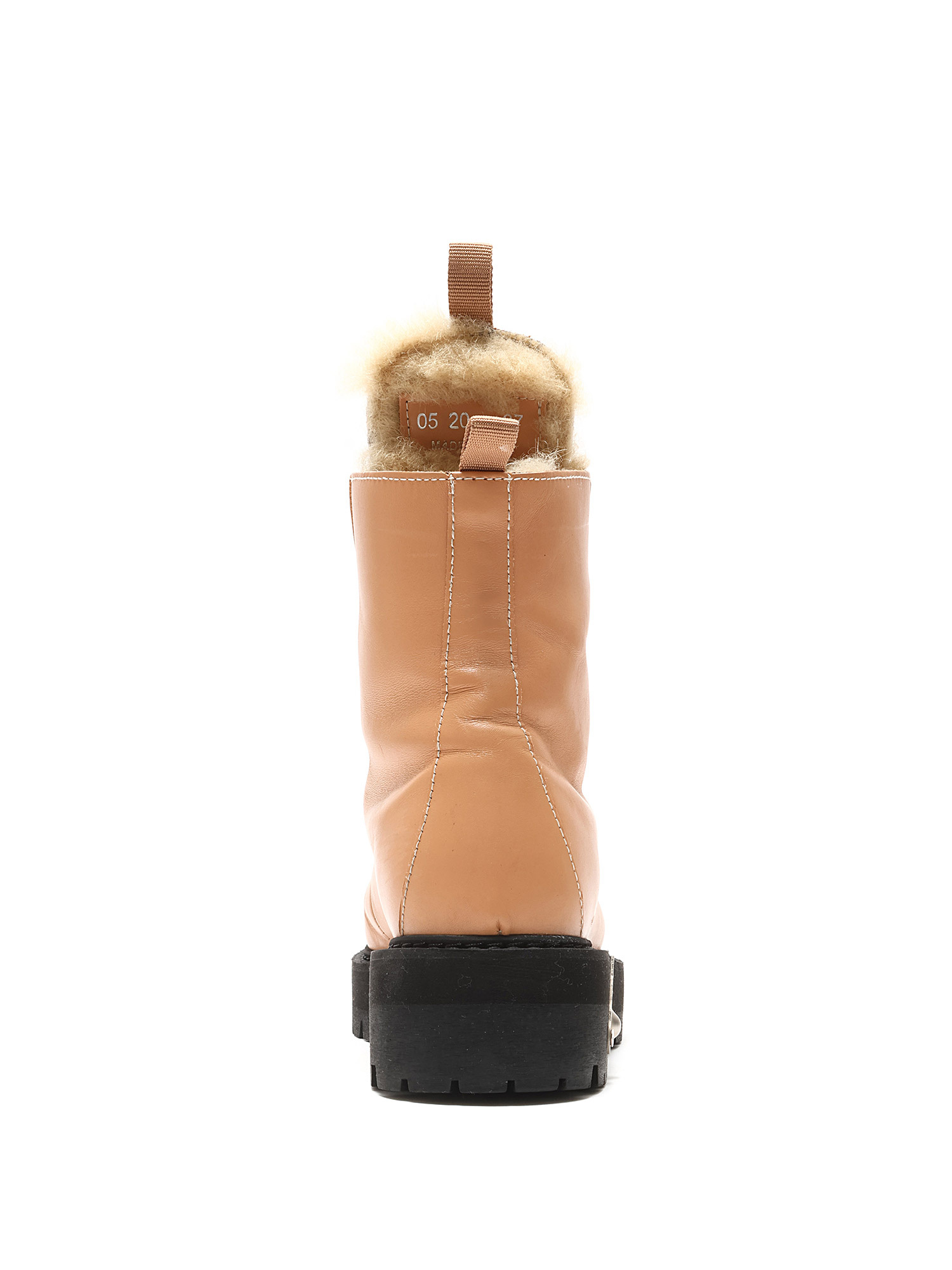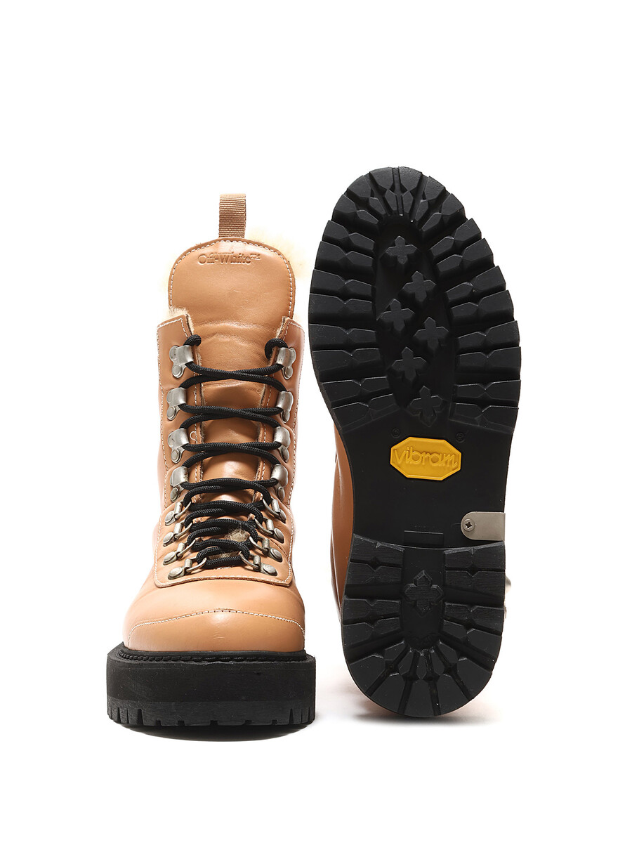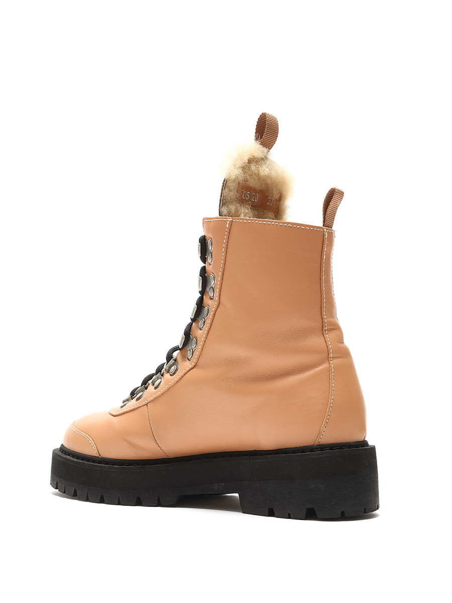 Bottes de randonnée à la cheville en cuir brun avec doublure en shearling. Fermeture à lacet avec crochets et oeillets en métal noir. Bout rond. Semelle en caoutchouc crantée.