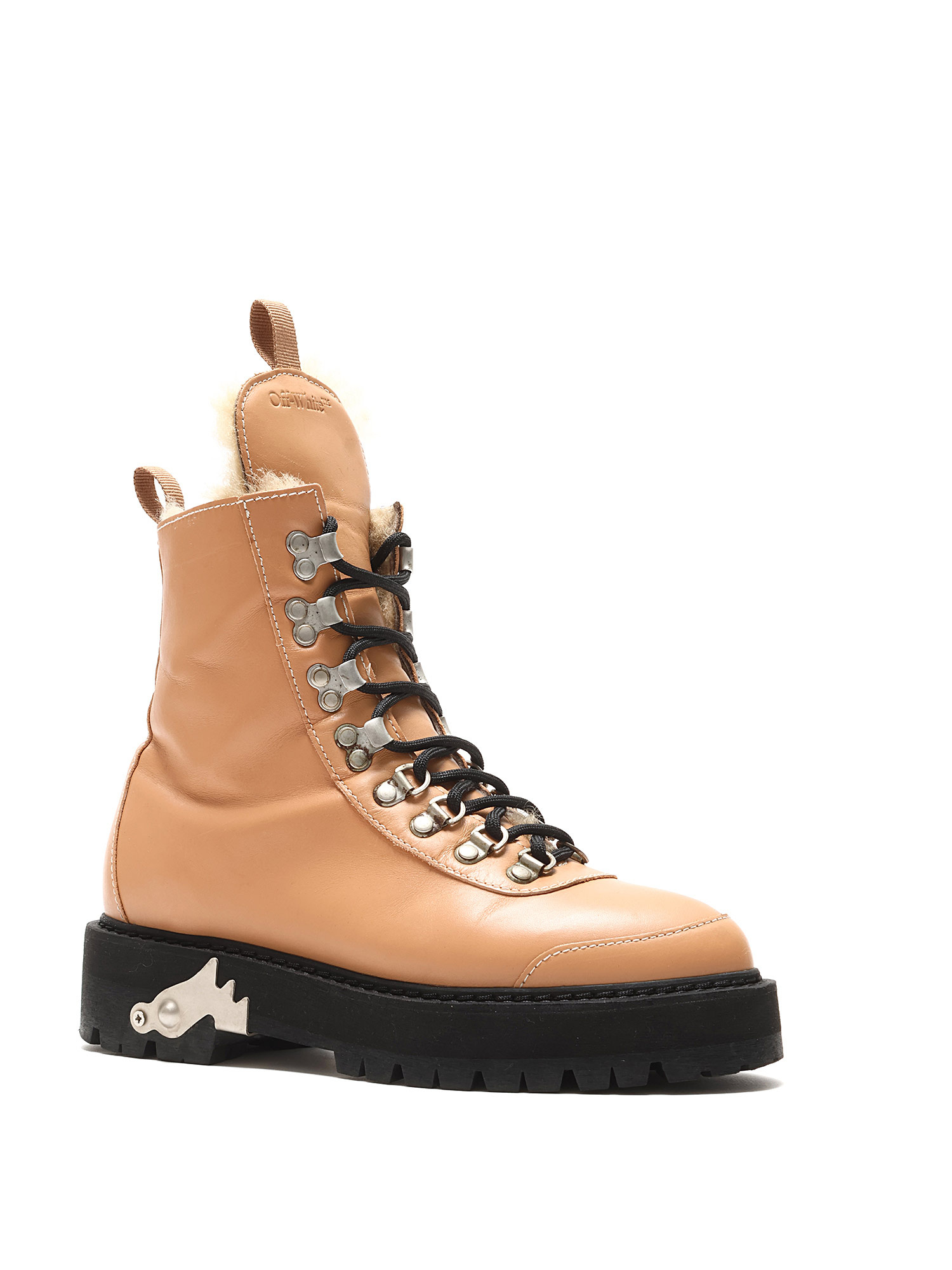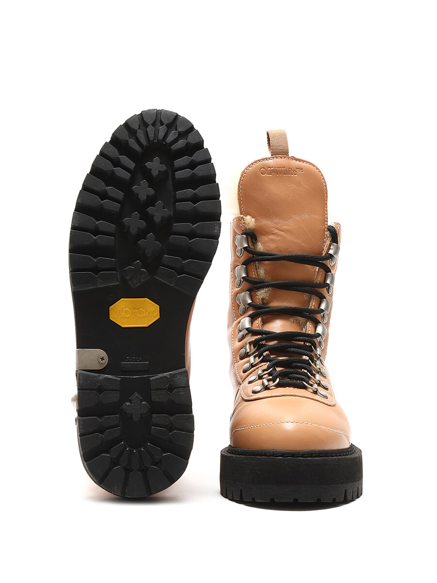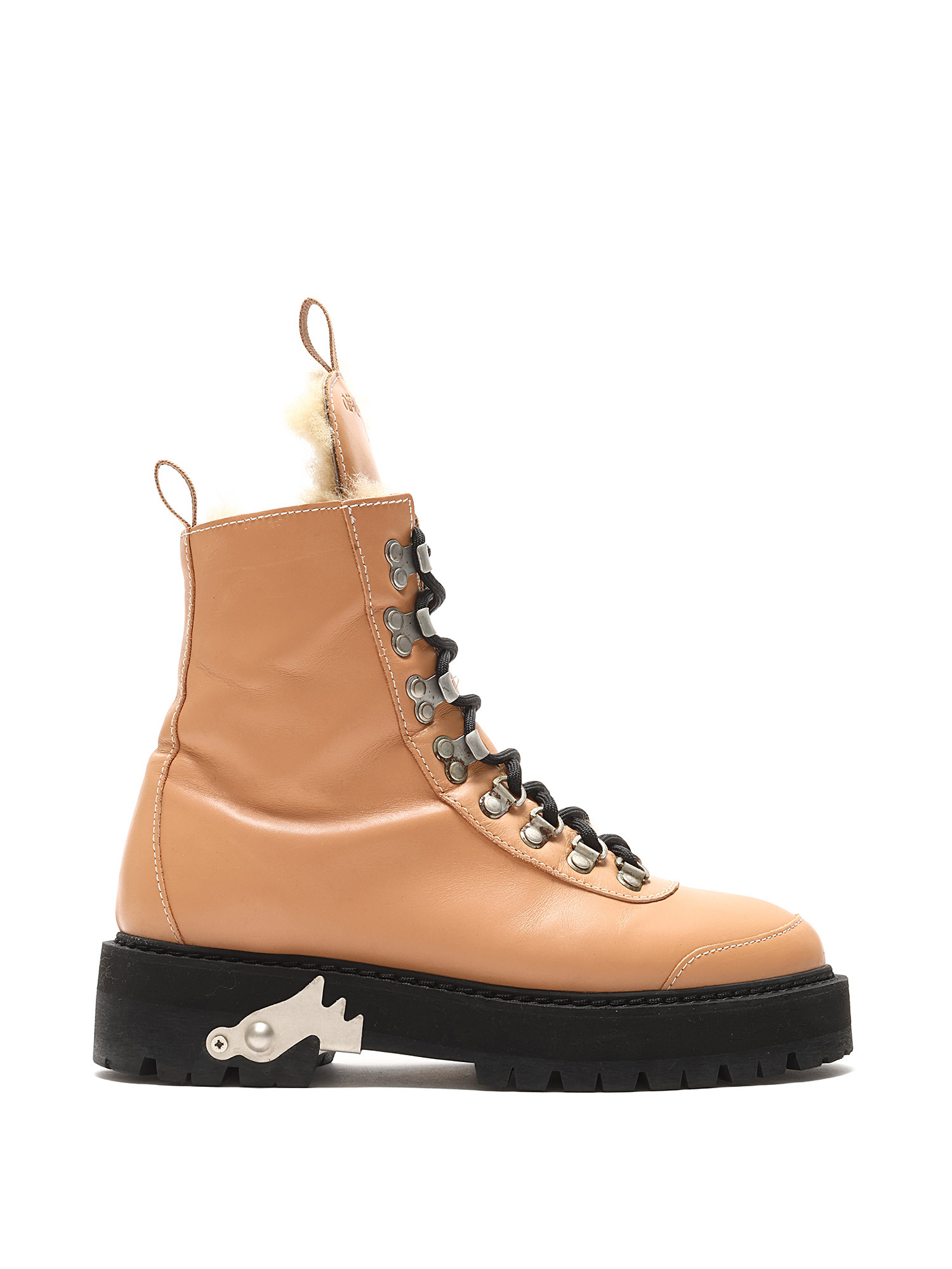 Bottes de randonnée à la cheville en cuir brun avec doublure en shearling. Fermeture à lacet avec crochets et oeillets en métal noir. Bout rond. Semelle en caoutchouc crantée.