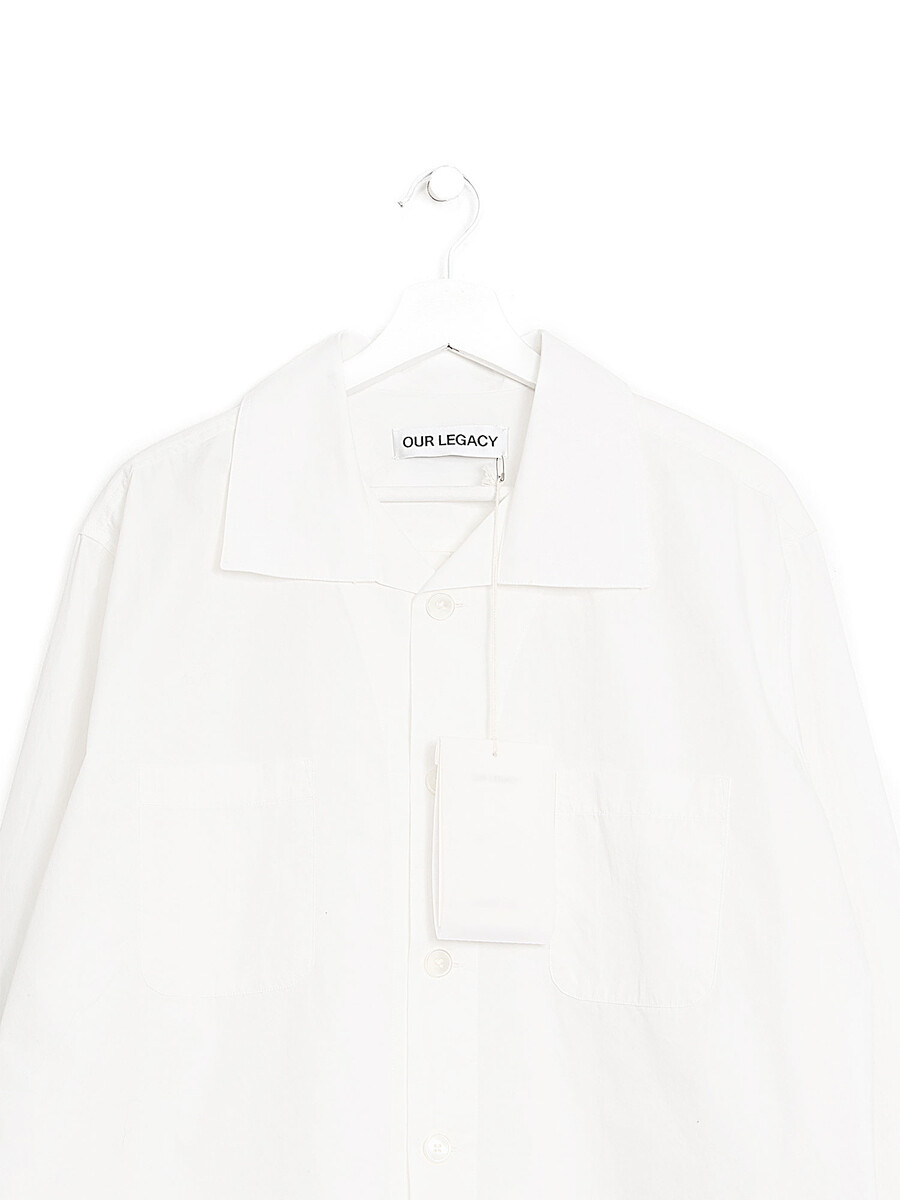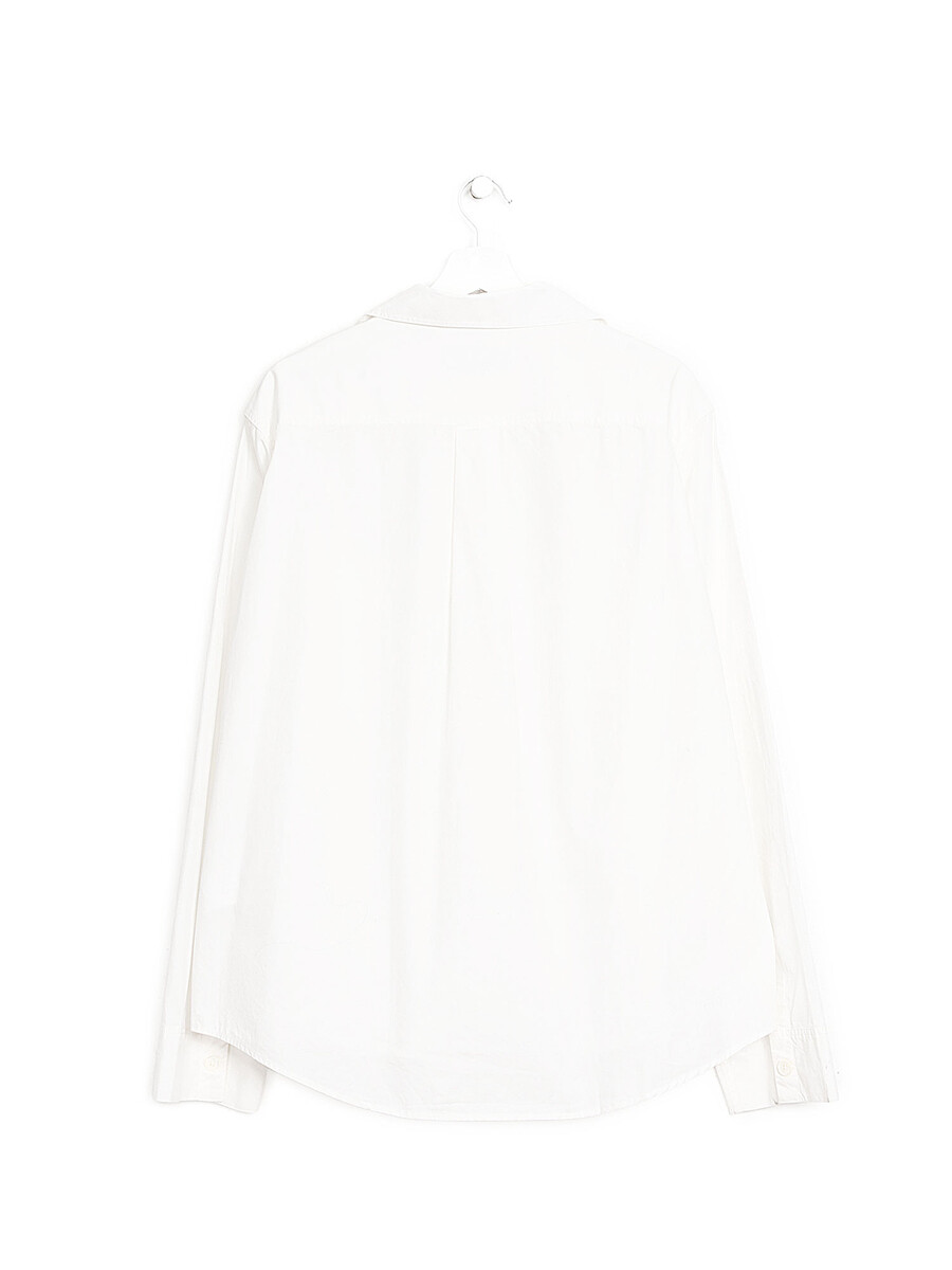 Chemise en popeline de coton blanc à manches longues et col classique. Fermeture à boutons sur le devant.