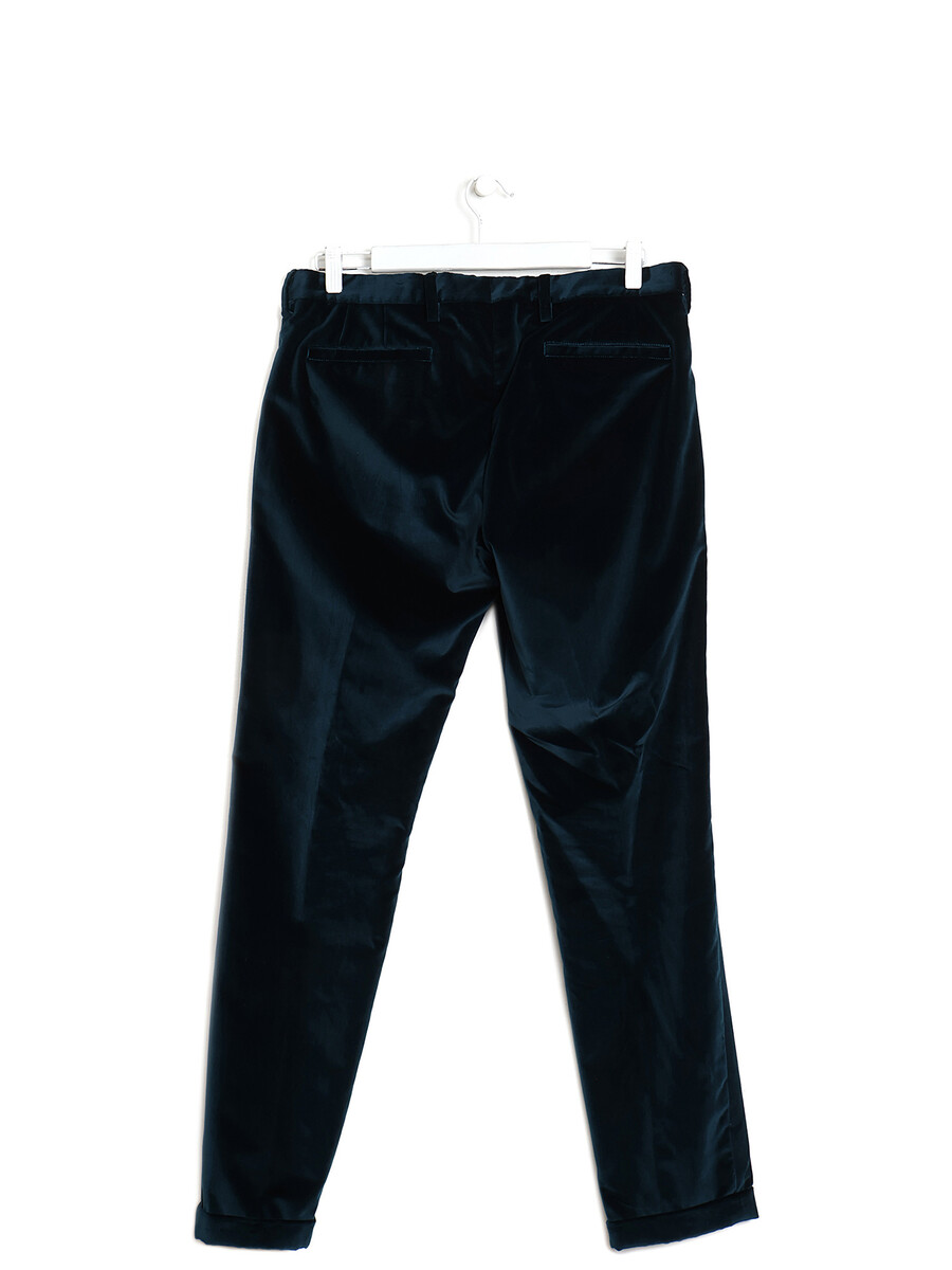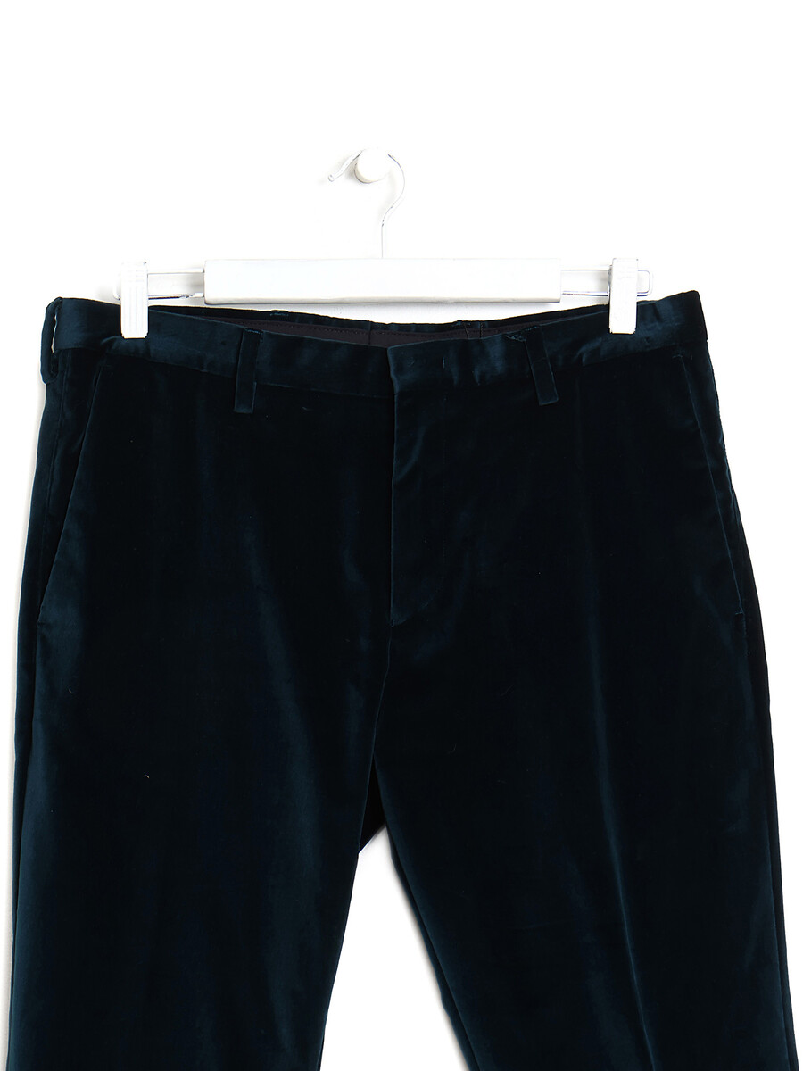 Pantalon à jambe droite en velours vert. Ganses pour ceinture. Fermeture à glissière et crochet. Poches à passepoil. Plis à la jambe. Avec étiquettes.