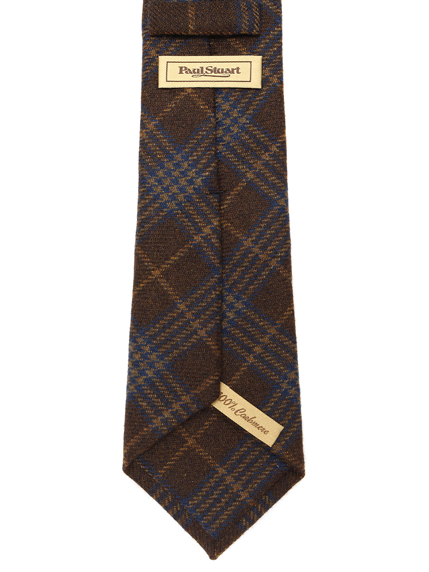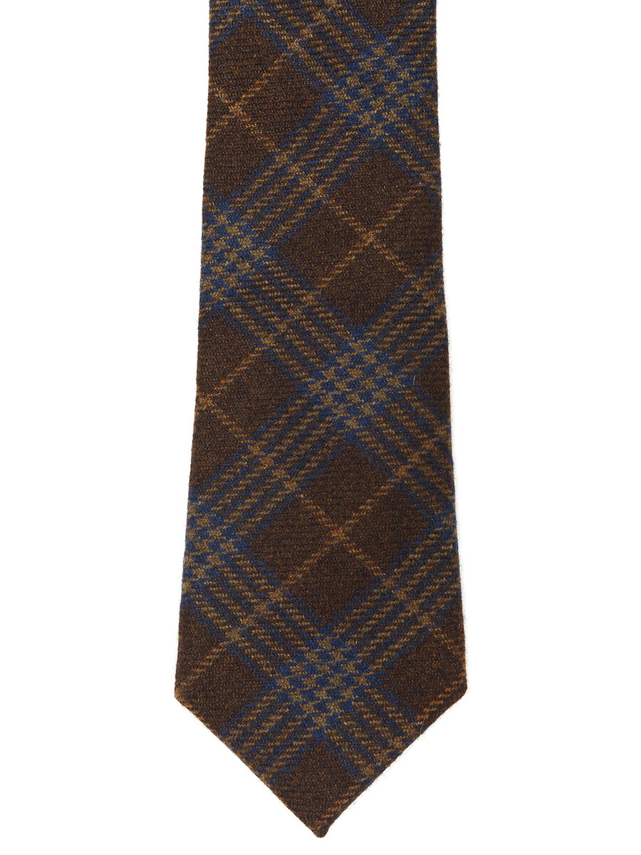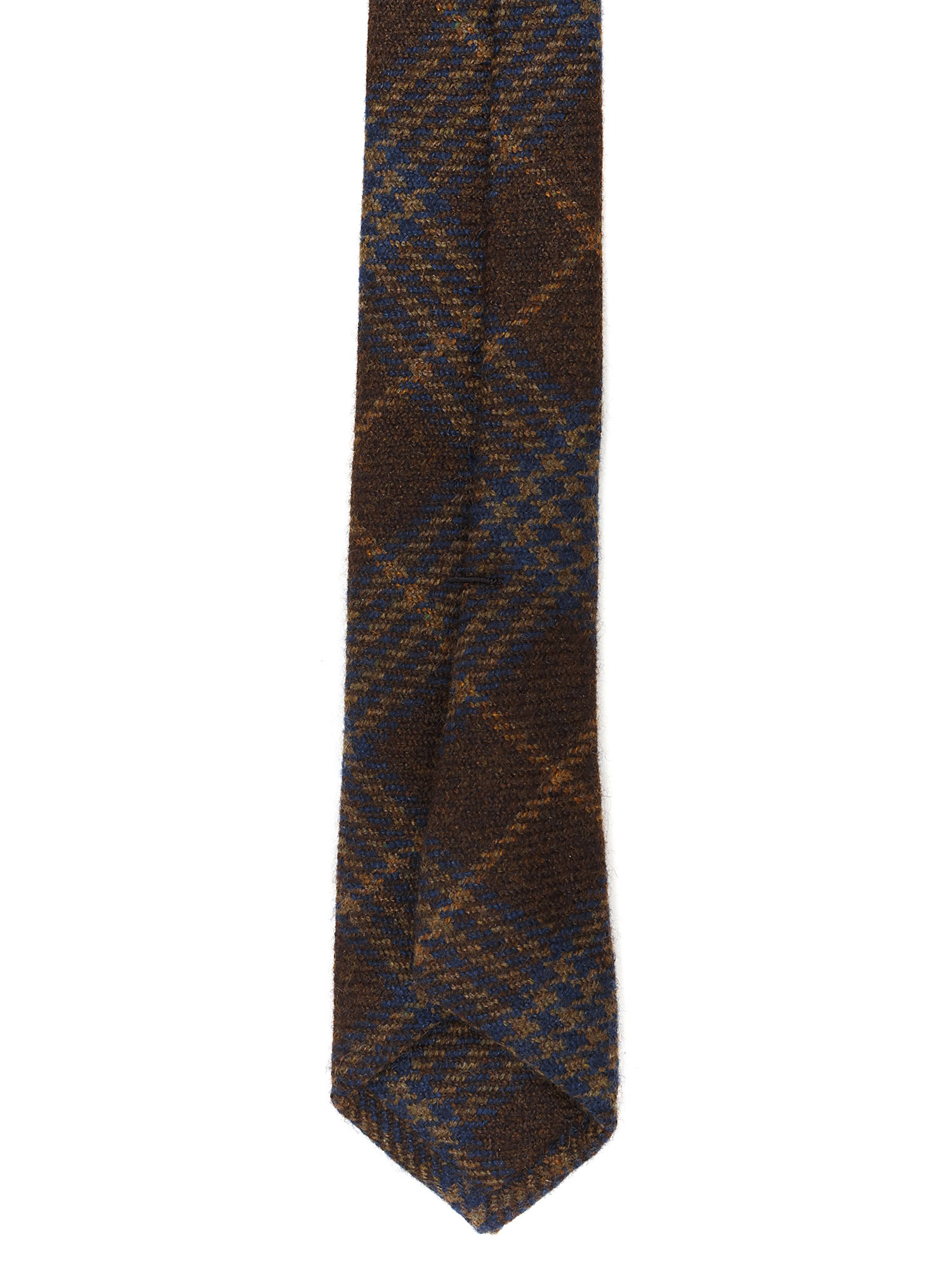 Cravate en cachemire avec motif de carreaux classique en nuances de brun, avec des accents de bleu et beige. Couture ton sur ton pour un look harmonieux.