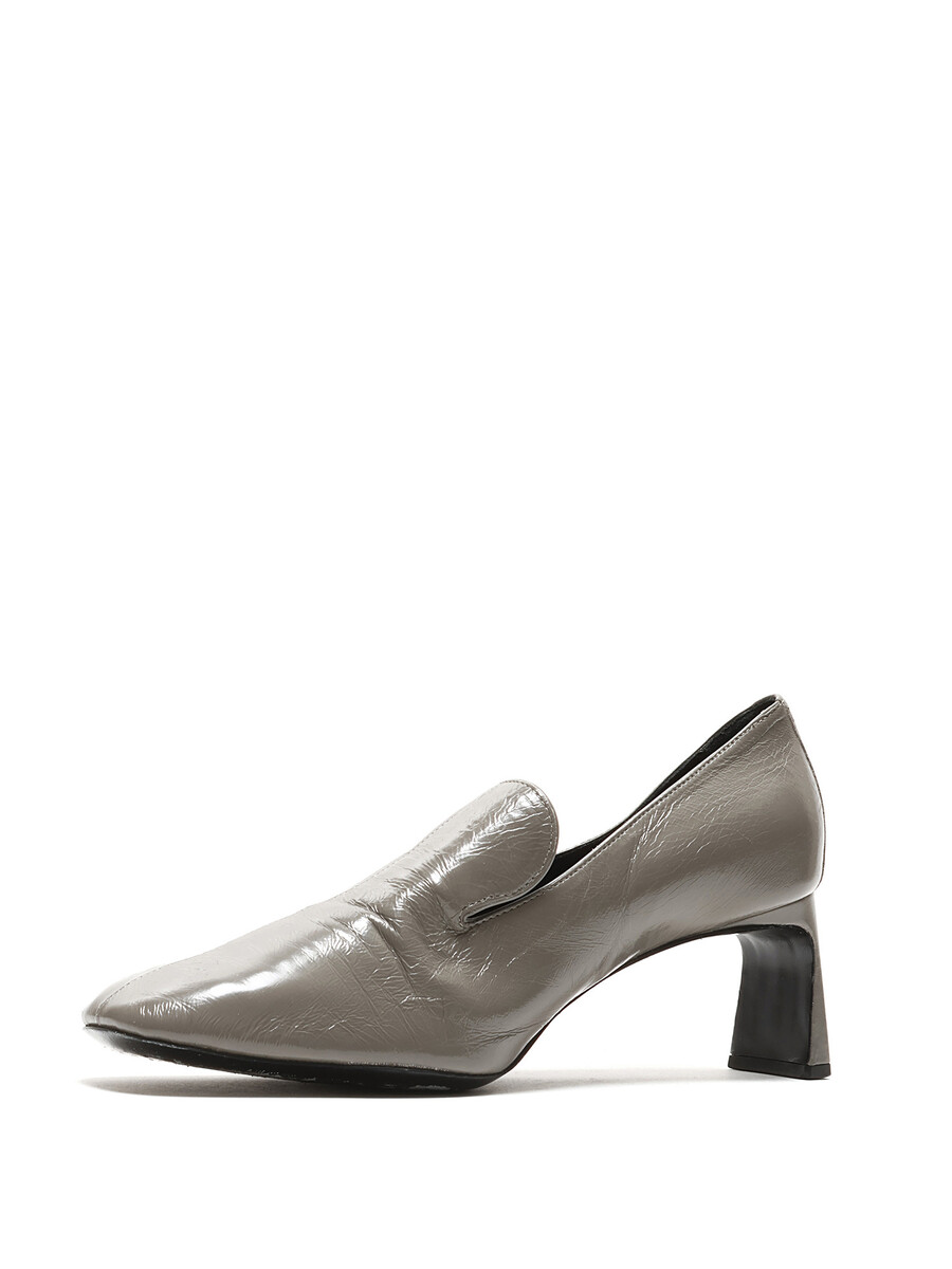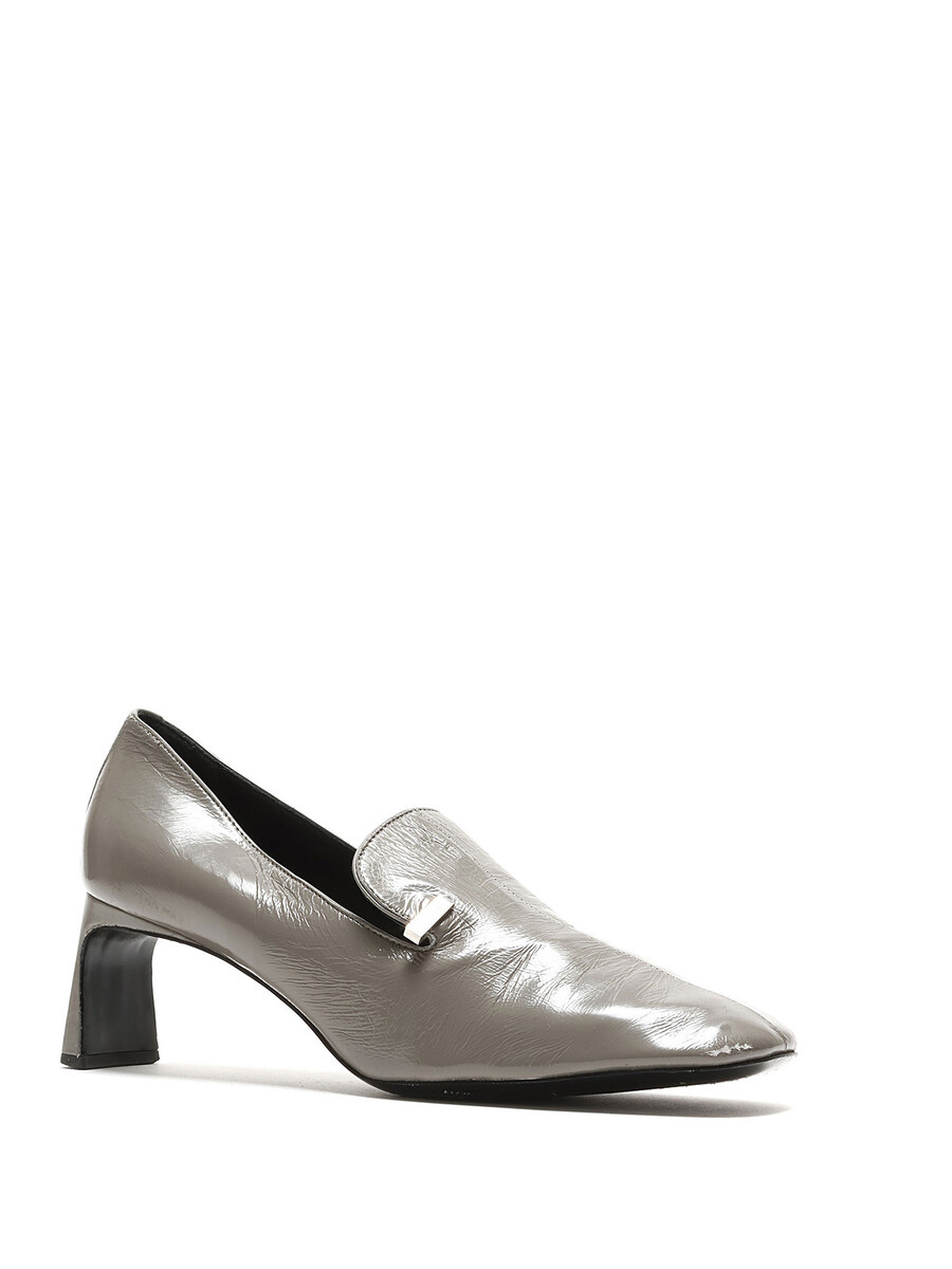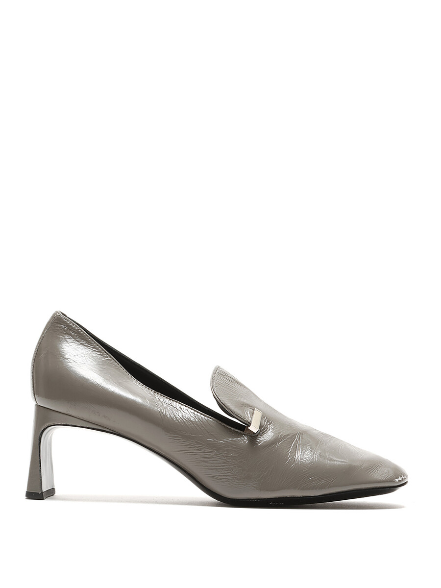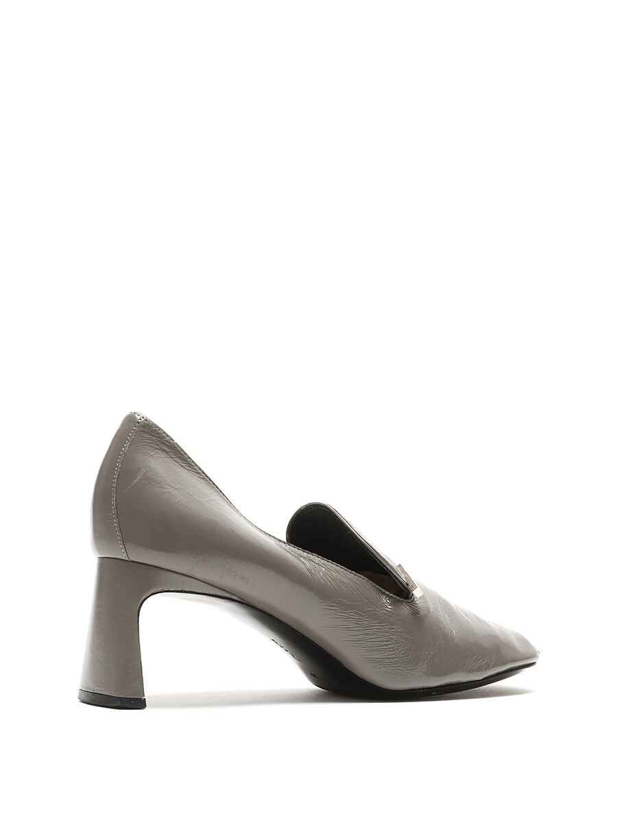 Talons hauts en cuir gris lustré avec bout carré. Détail argenté sur le côté extérieur. Semelle en cuir. Livré avec dust bag.