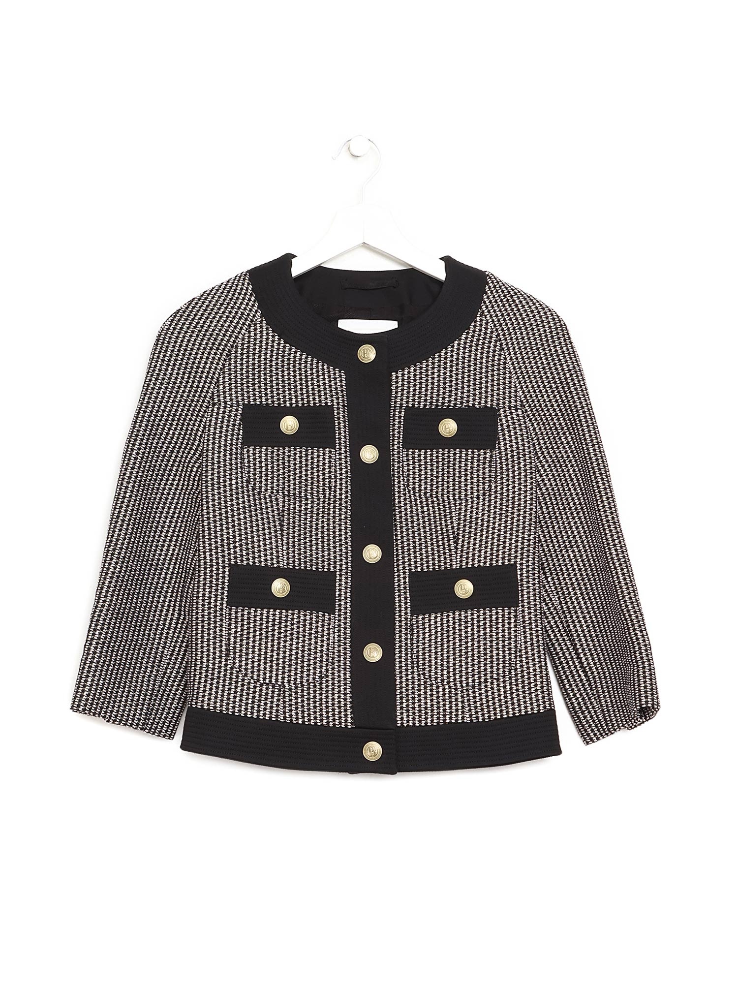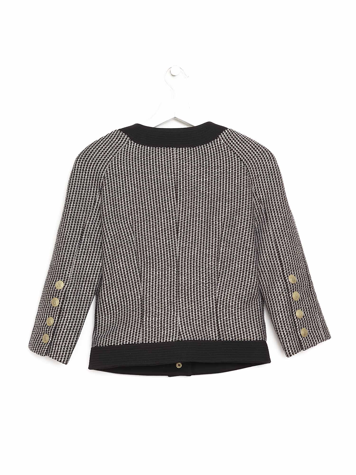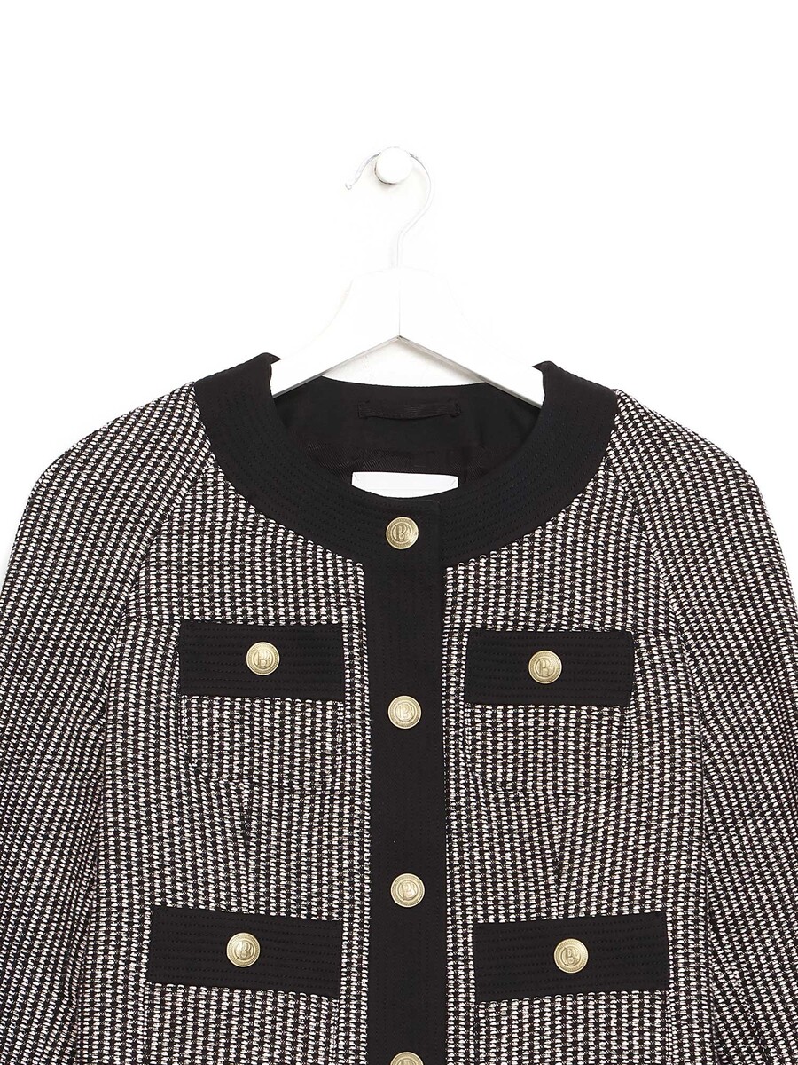 Veste à manches longues avec motif géométrique dans les tons de noir, beige et argent. Boutons dorés avec fermeture avant. Col rond. Poches à rabat.
